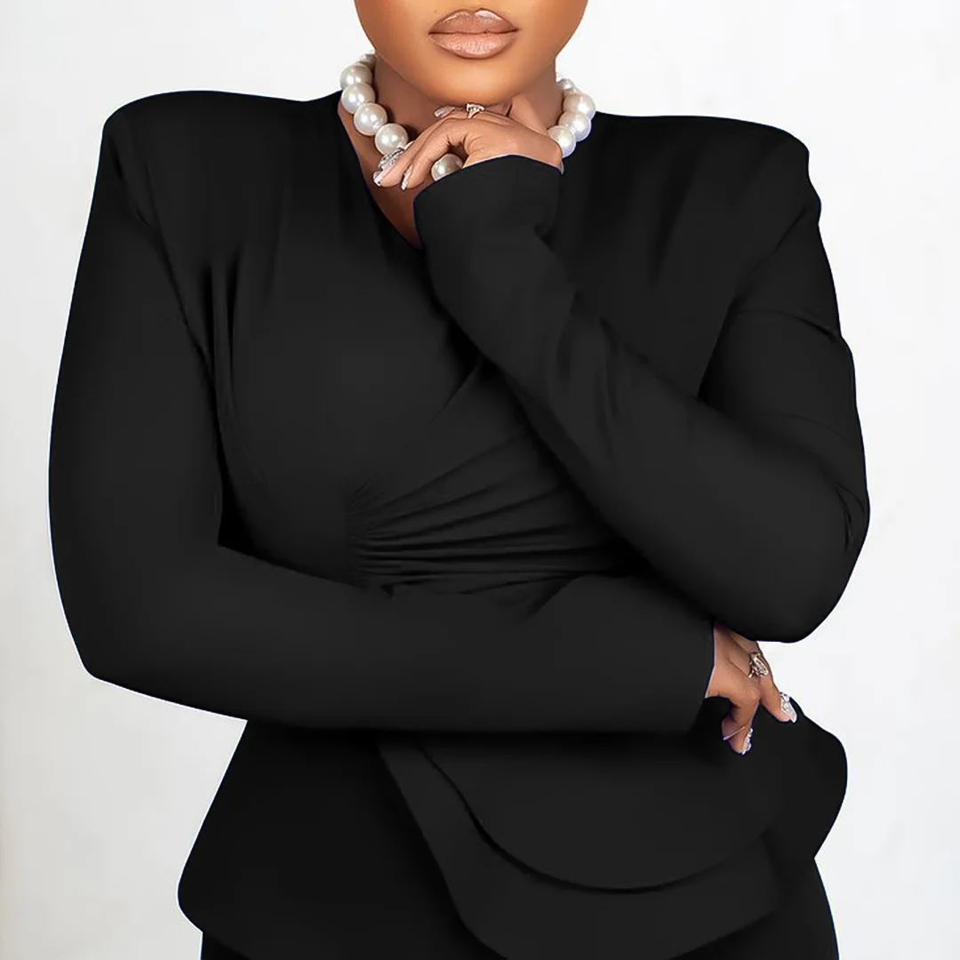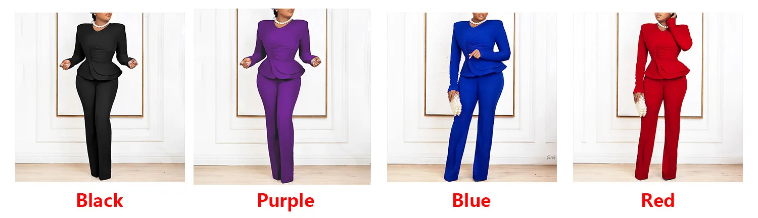 2024 Fashion Autumn Winter Outfits Ruffled V Neck Ladies Office Top And Pants Set For Women Two Pieces