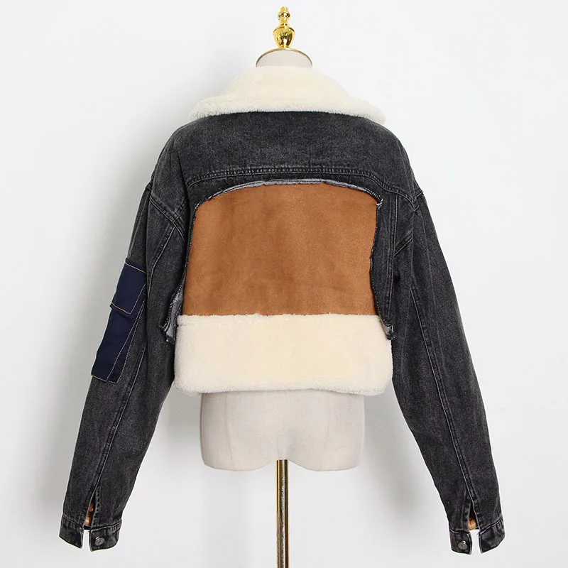 Women Winter Jackets 2021 Ins Lamp Wool Thickness Soft Denim Jeans Panelled Cropped Teddy Winter Jacket