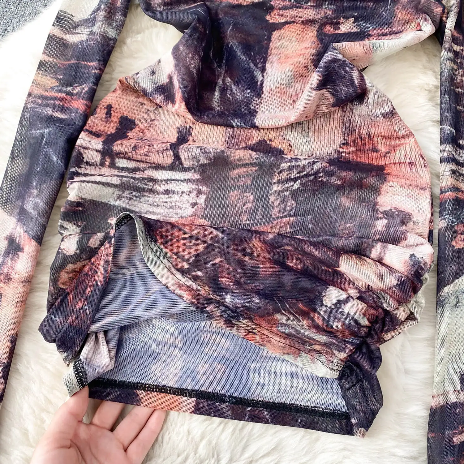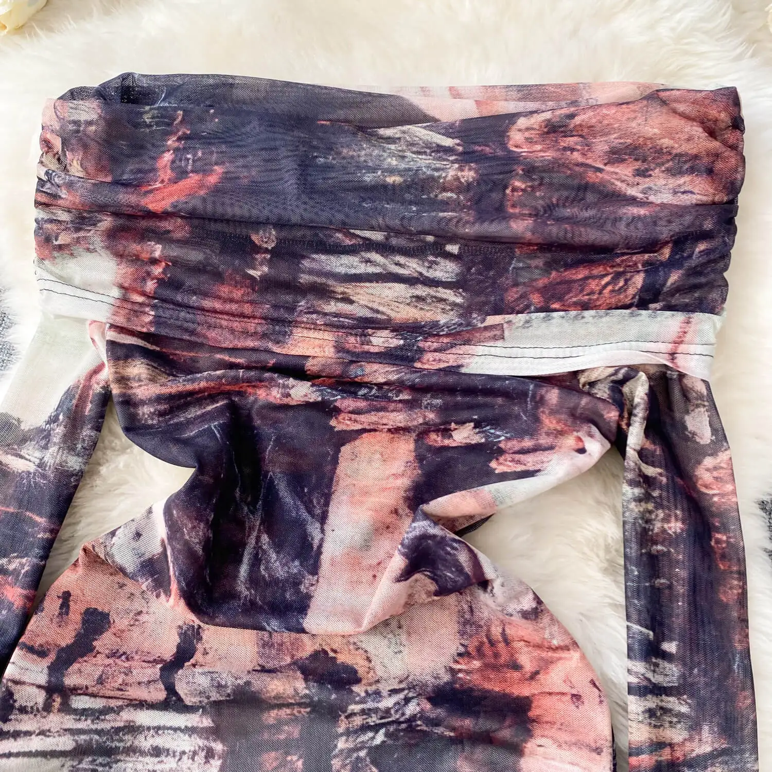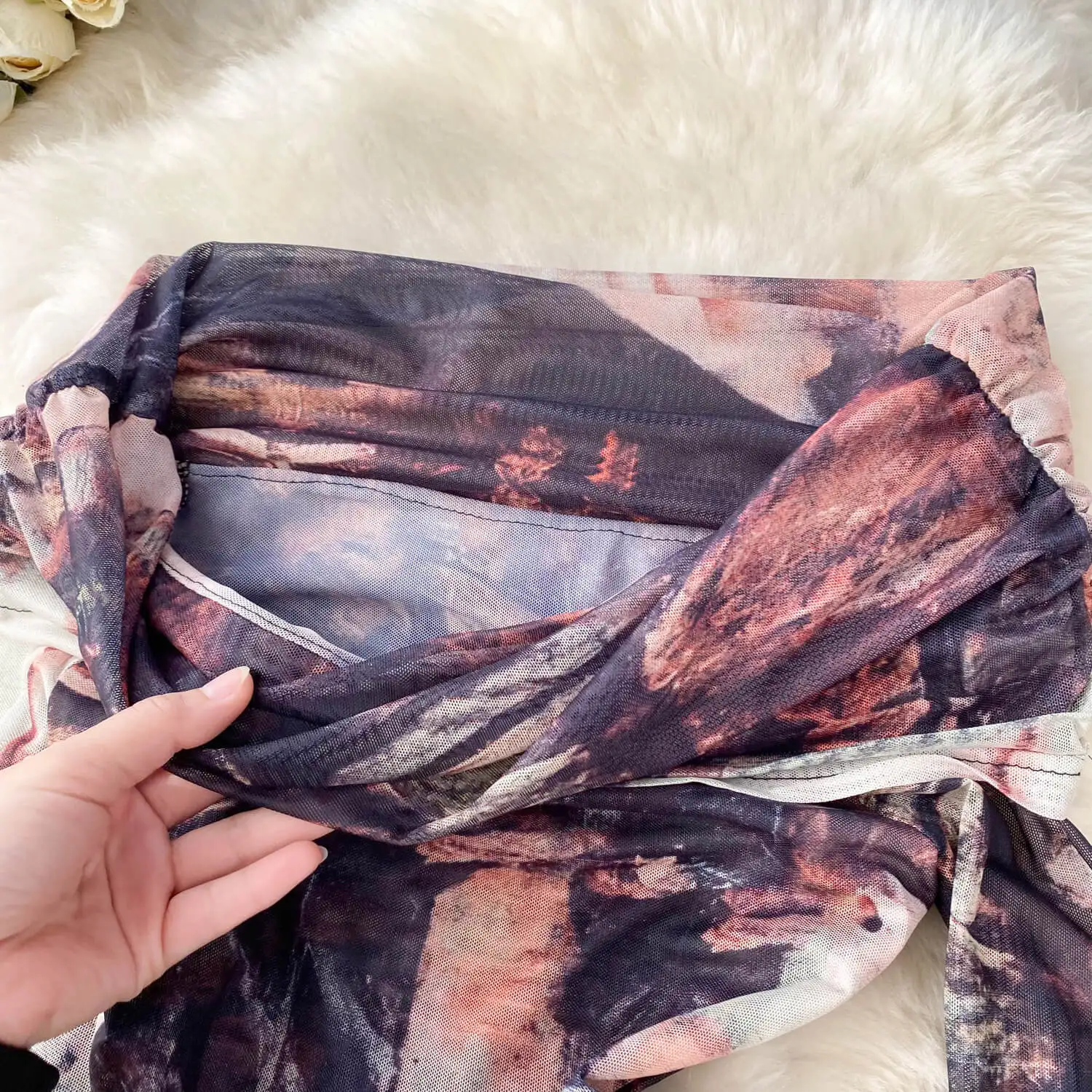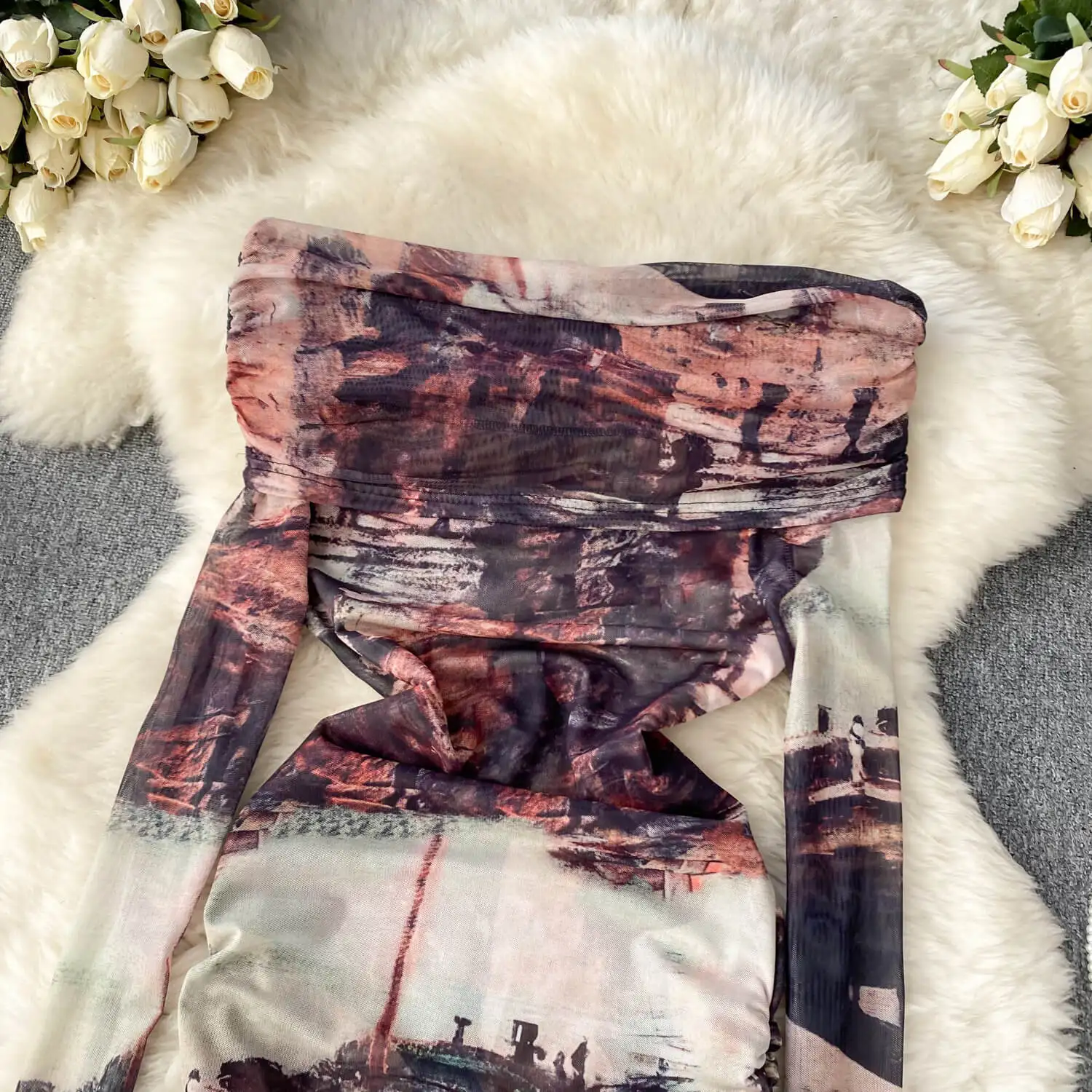 2024 Fashion Retro Mixed-color Tie-dyed Sexy Hot Girl Off-shoulder Versatile T-shirt Women