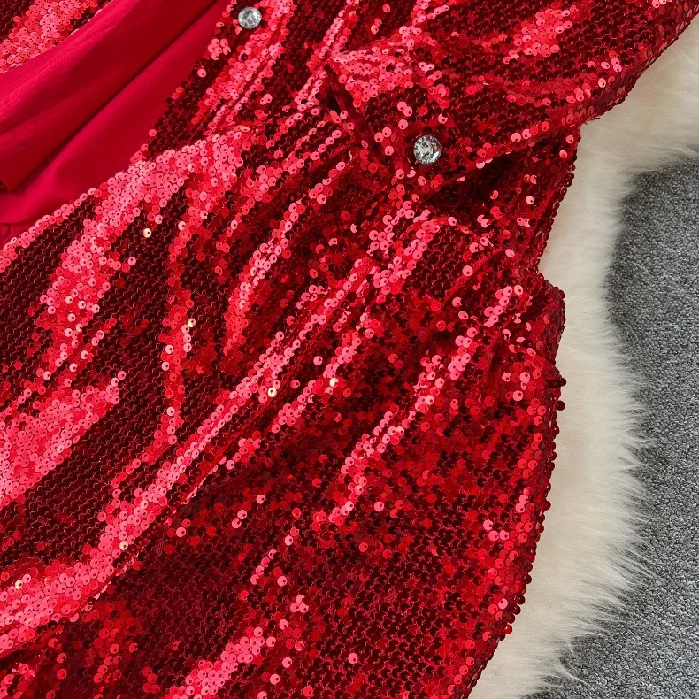 2024 fashionable sequin sparkling set for women with loose long sleeved shirt+high waisted wide pants