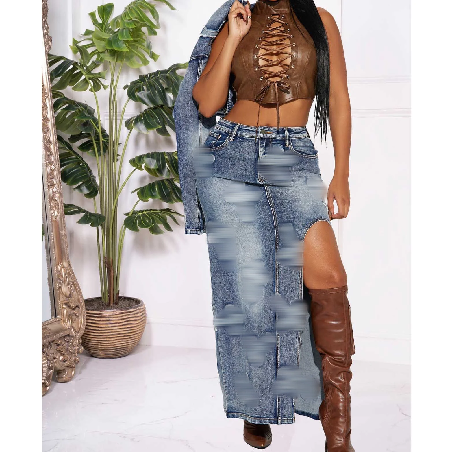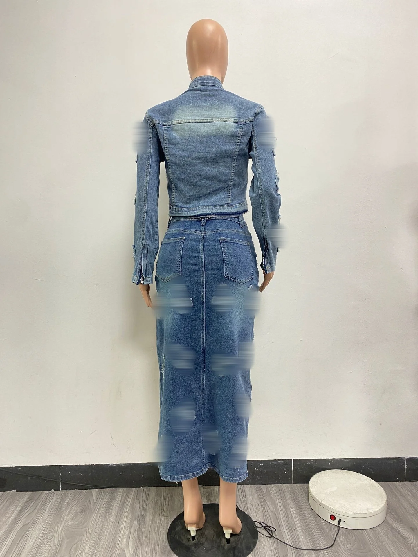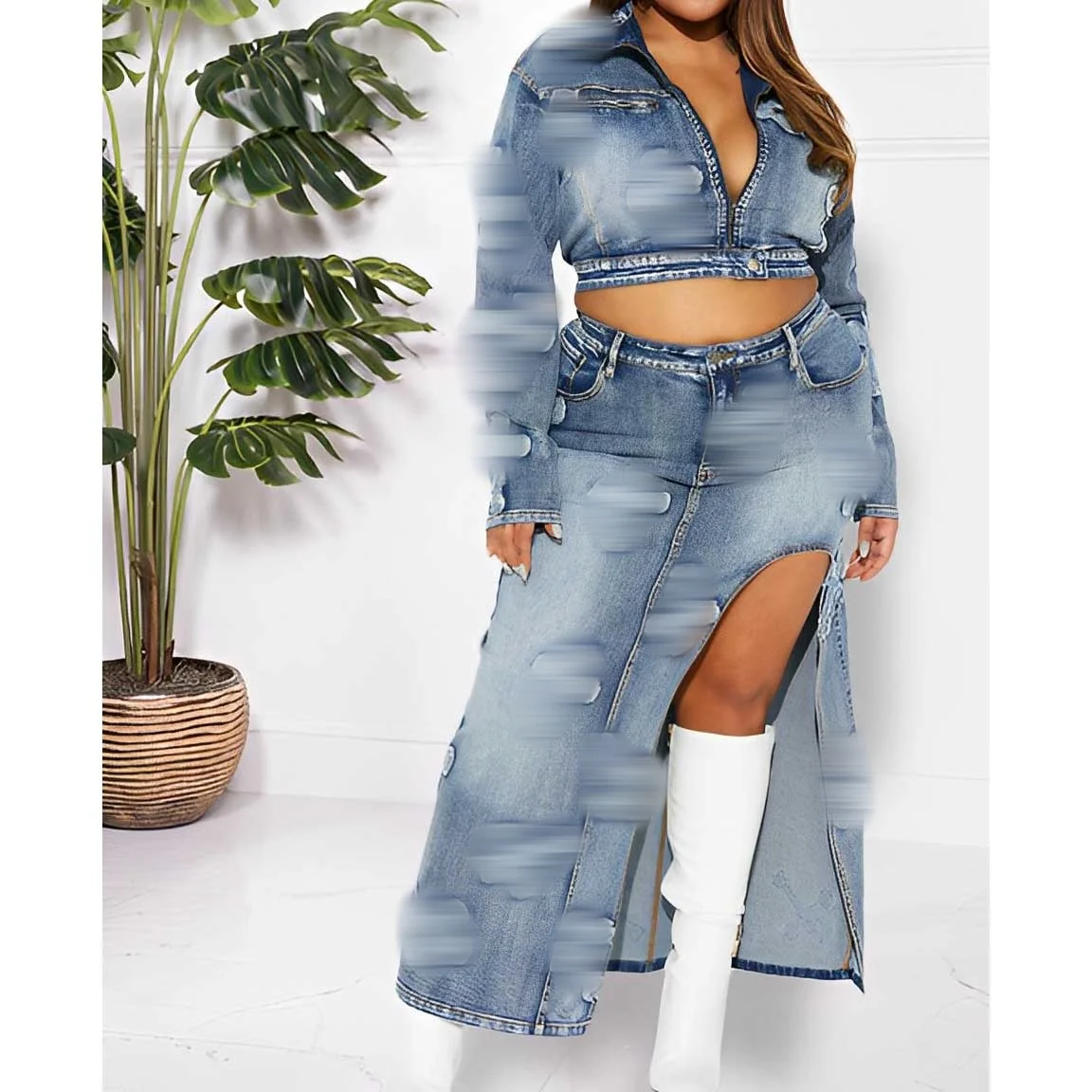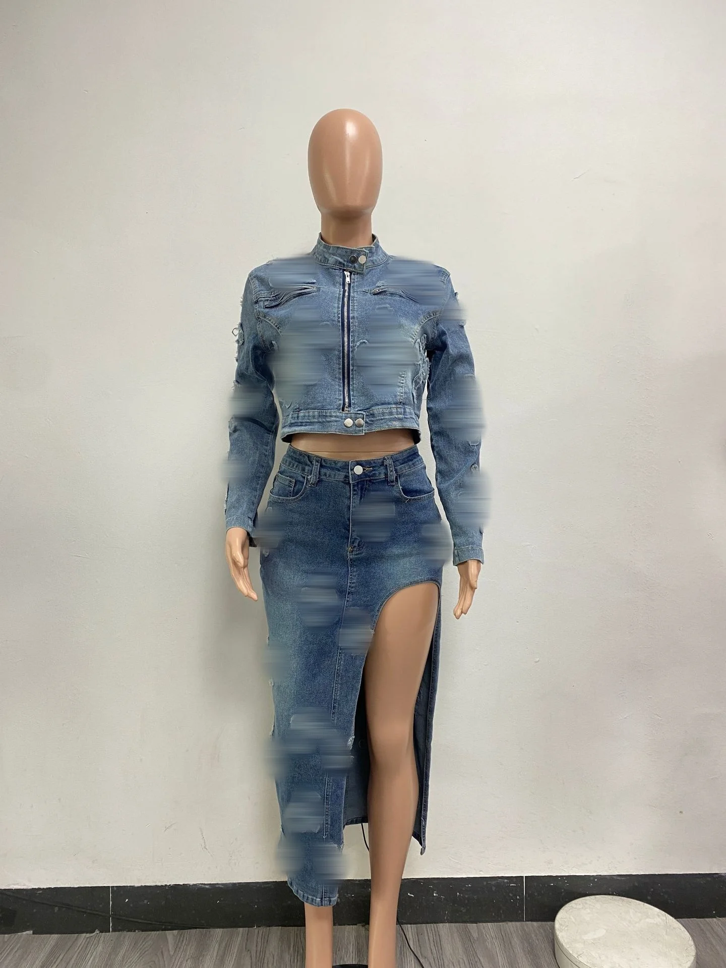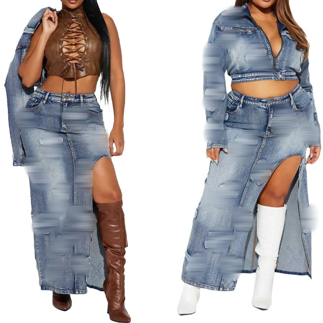2024 Hot Selling Women Zipper Denim Jacket Split Half Skirts Embroidery Elastic Two Piece Skirts Sets