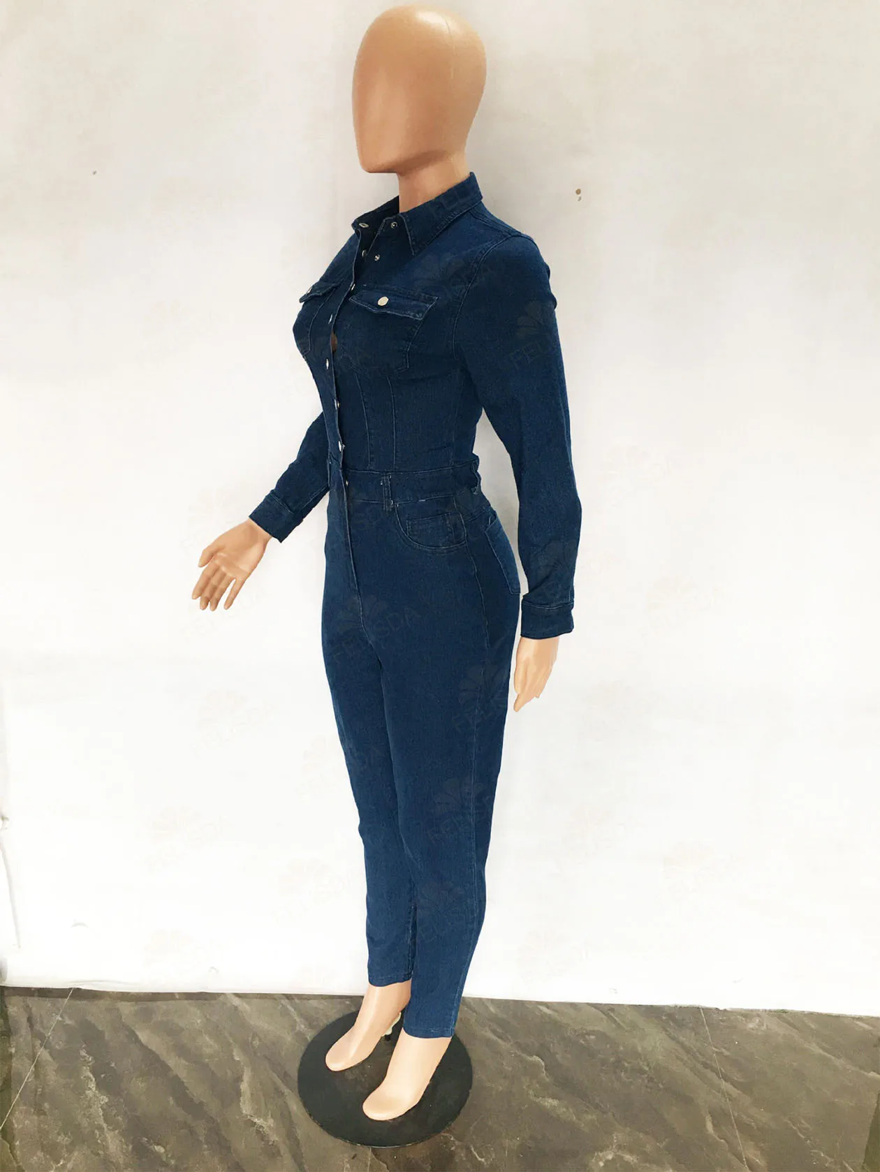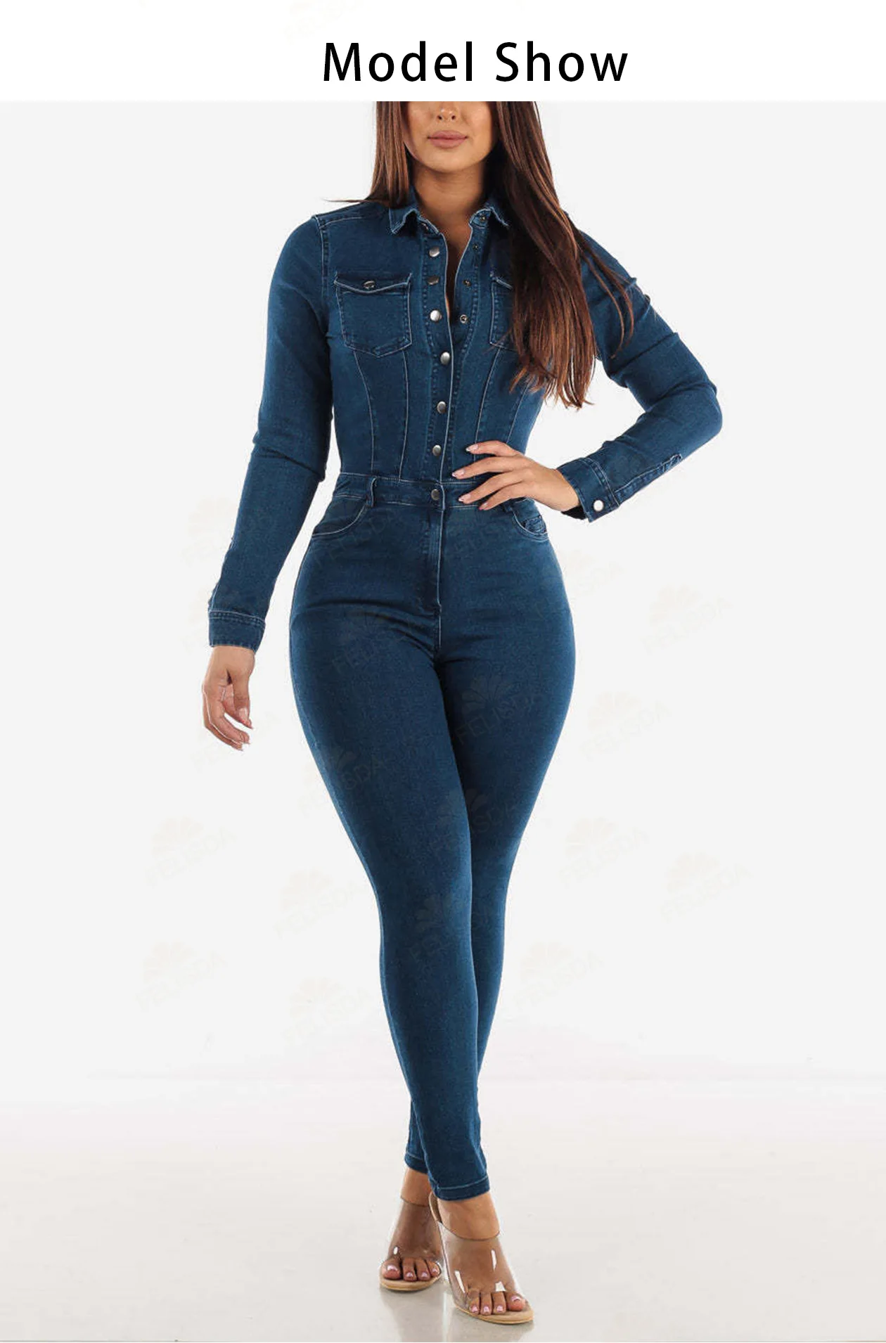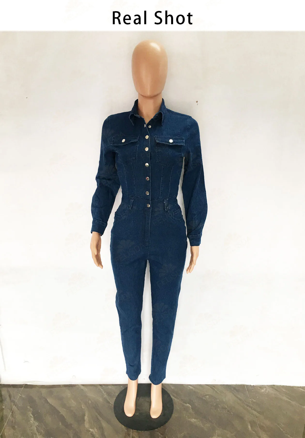 2024 New Arrival Brand Denim Jumpsuits Slim Fit Stretch Pencil Jeans Solid Turn-down Collar Long Sleeve Casual Bodycon Rompers