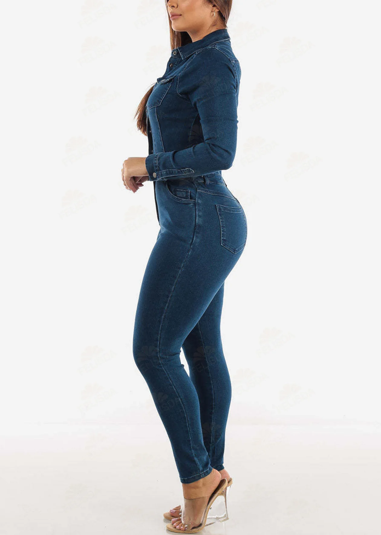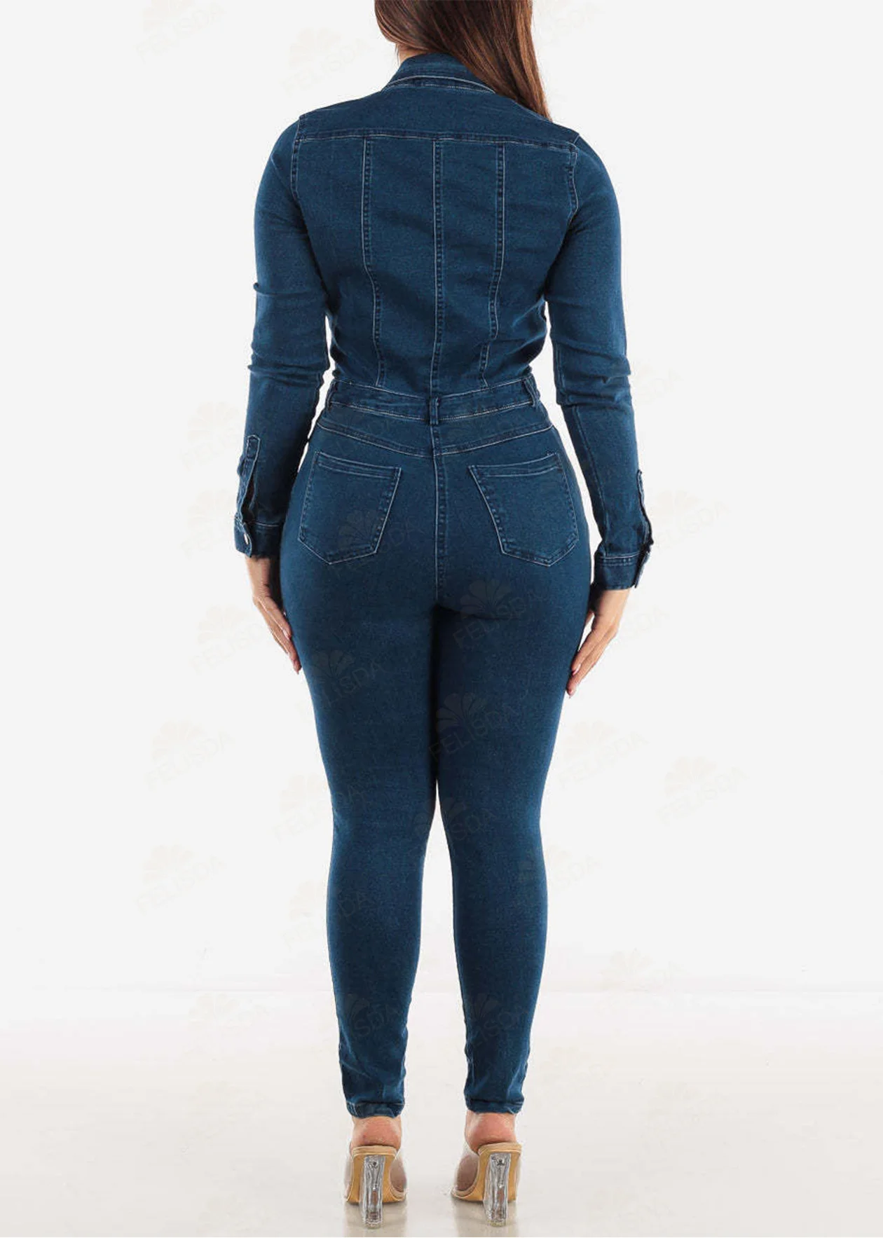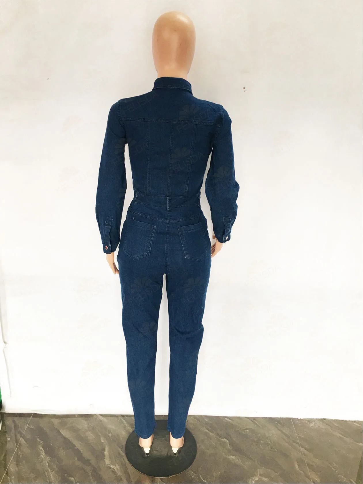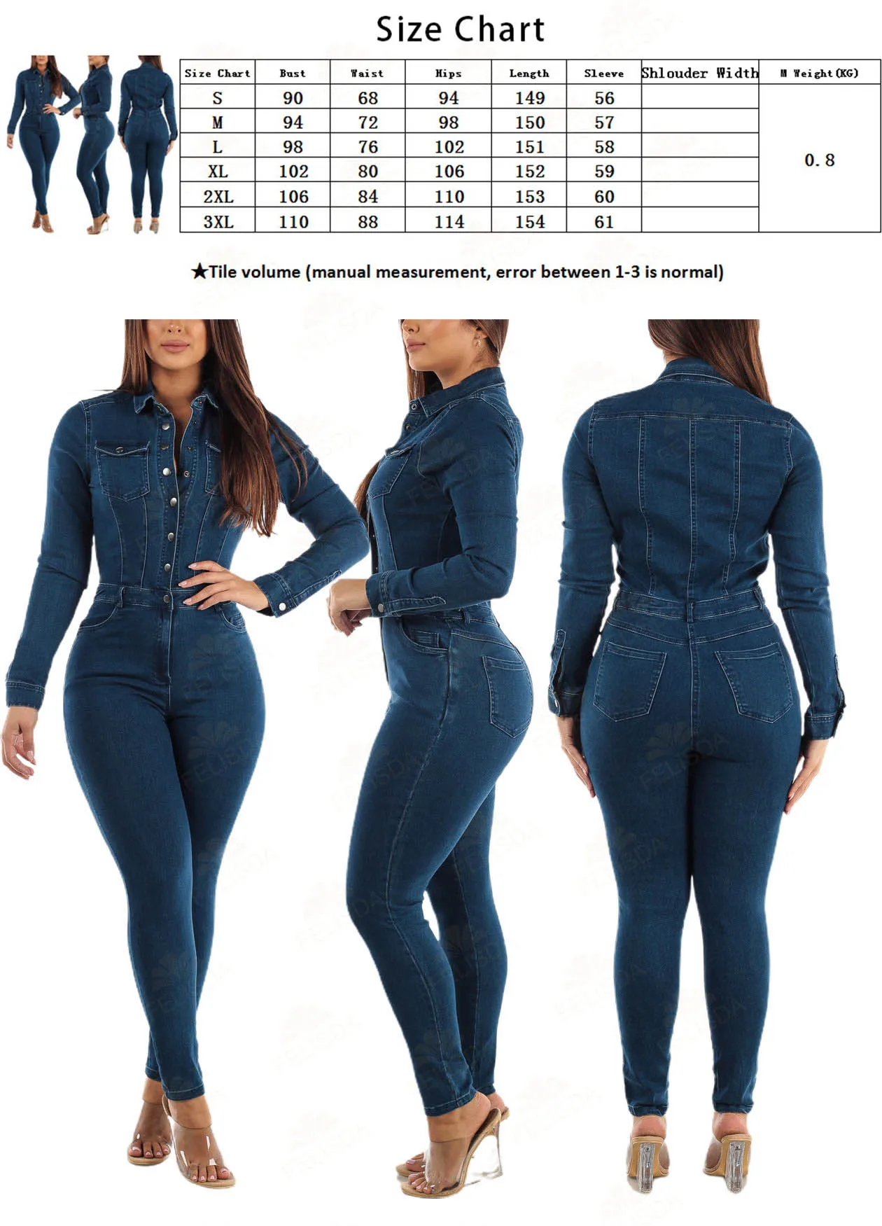 2024 New Arrival Brand Denim Jumpsuits Slim Fit Stretch Pencil Jeans Solid Turn-down Collar Long Sleeve Casual Bodycon Rompers