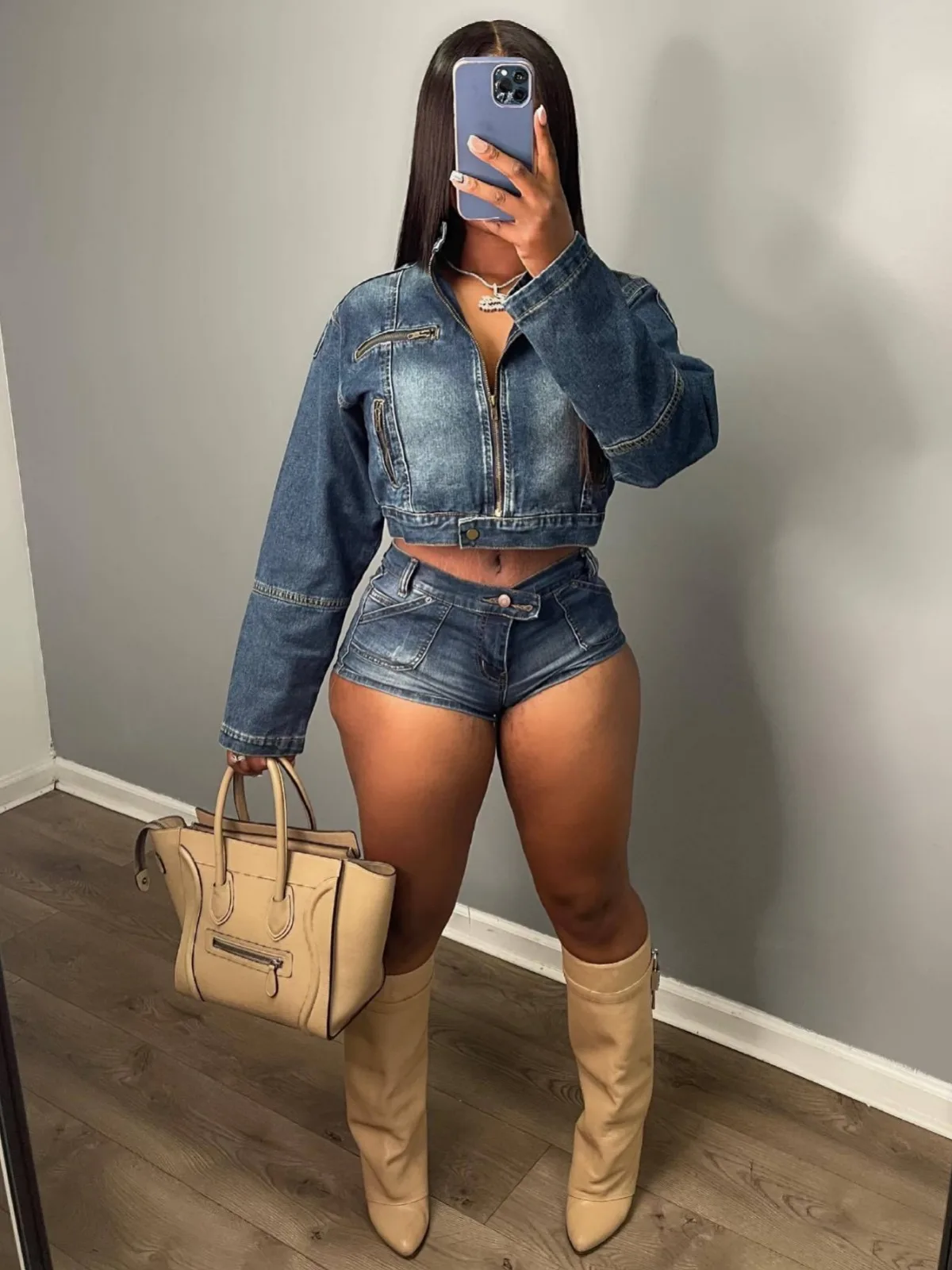 2024 New Arrival Fashion 2 Piece Outfits Zipper Long Sleeve Crop Jean Jacket and Denim Shorts Women Two Piece Denim Sets