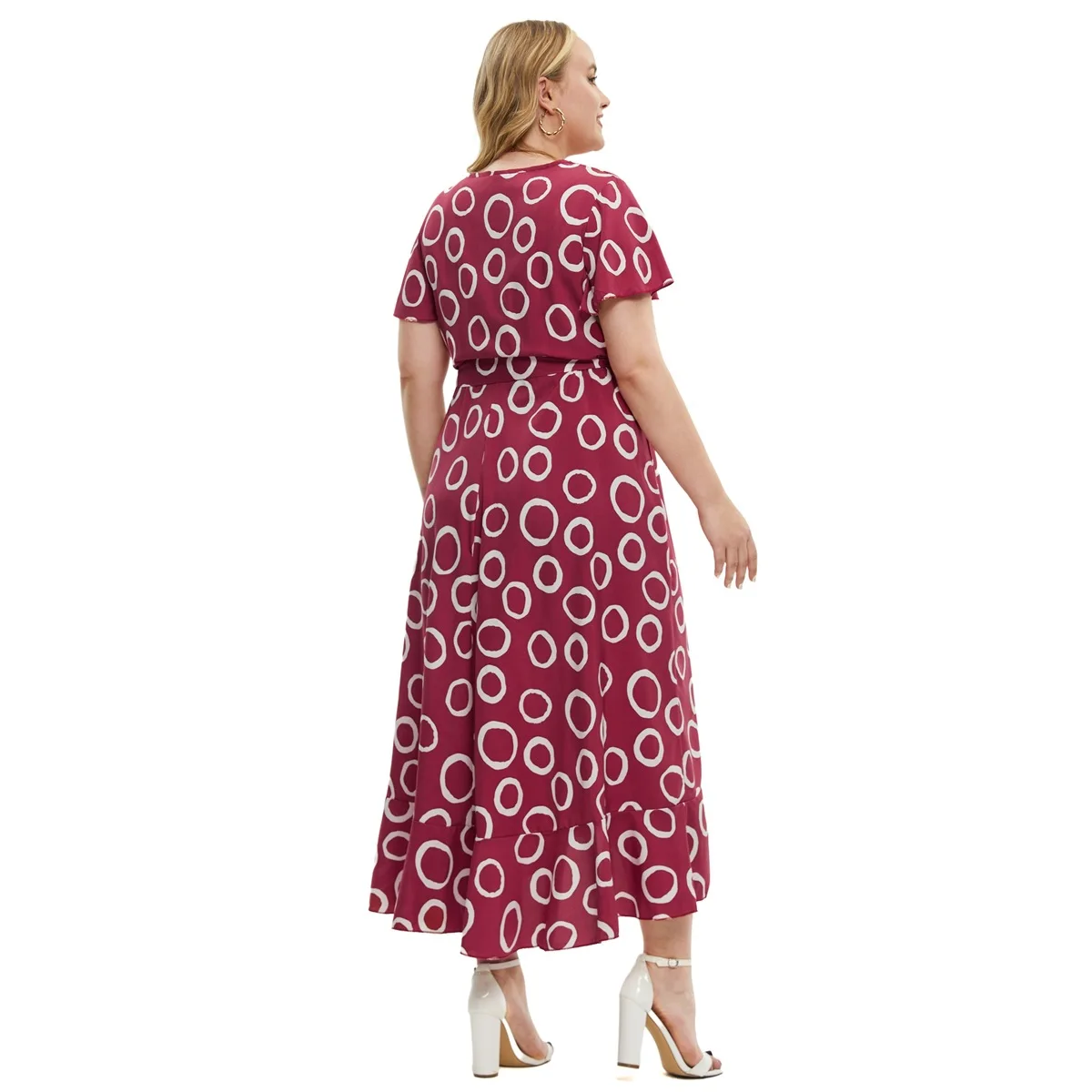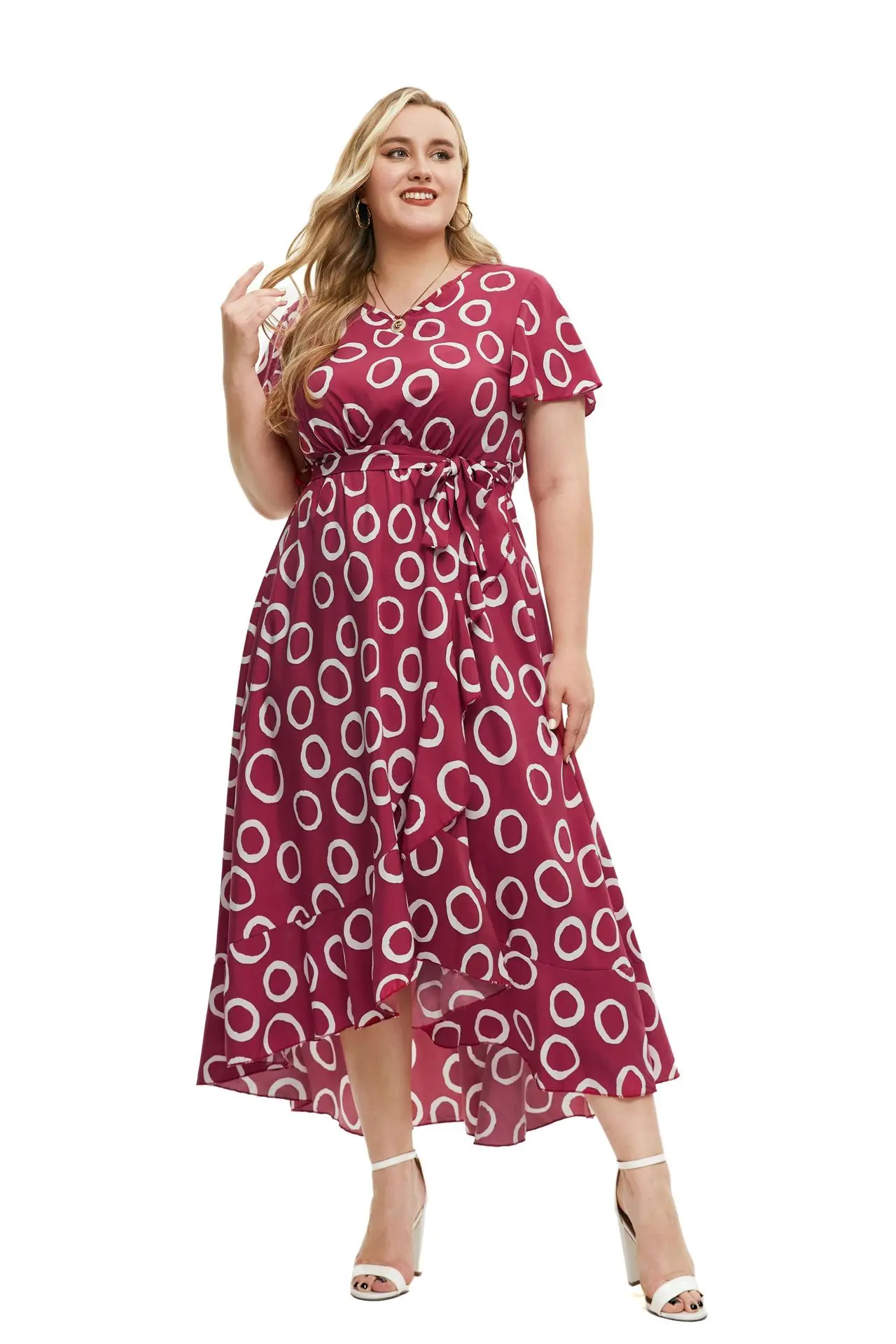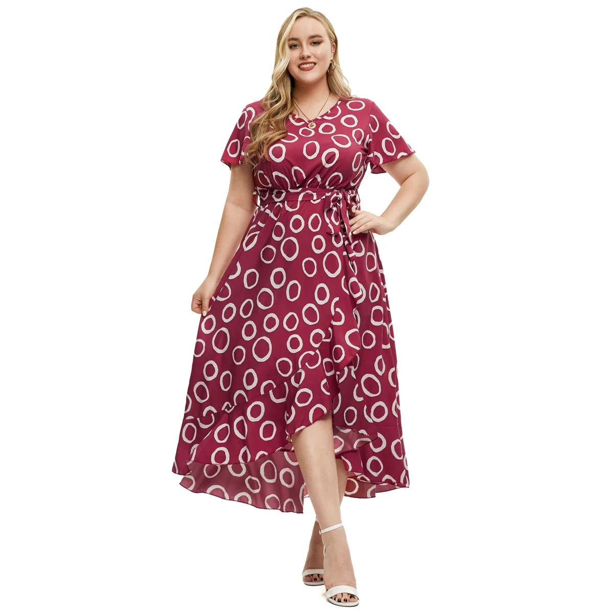 2024 New Arrivals women's v-neck short sleeve printed lace-up slit irregular dress