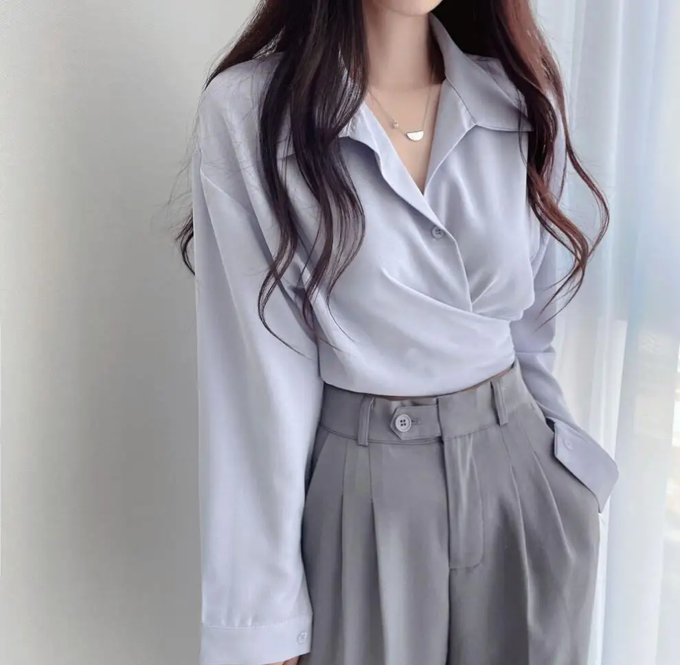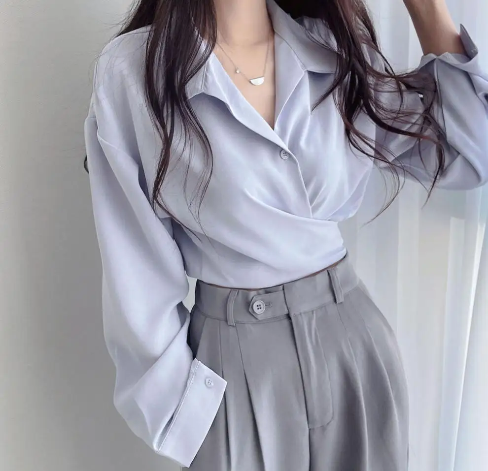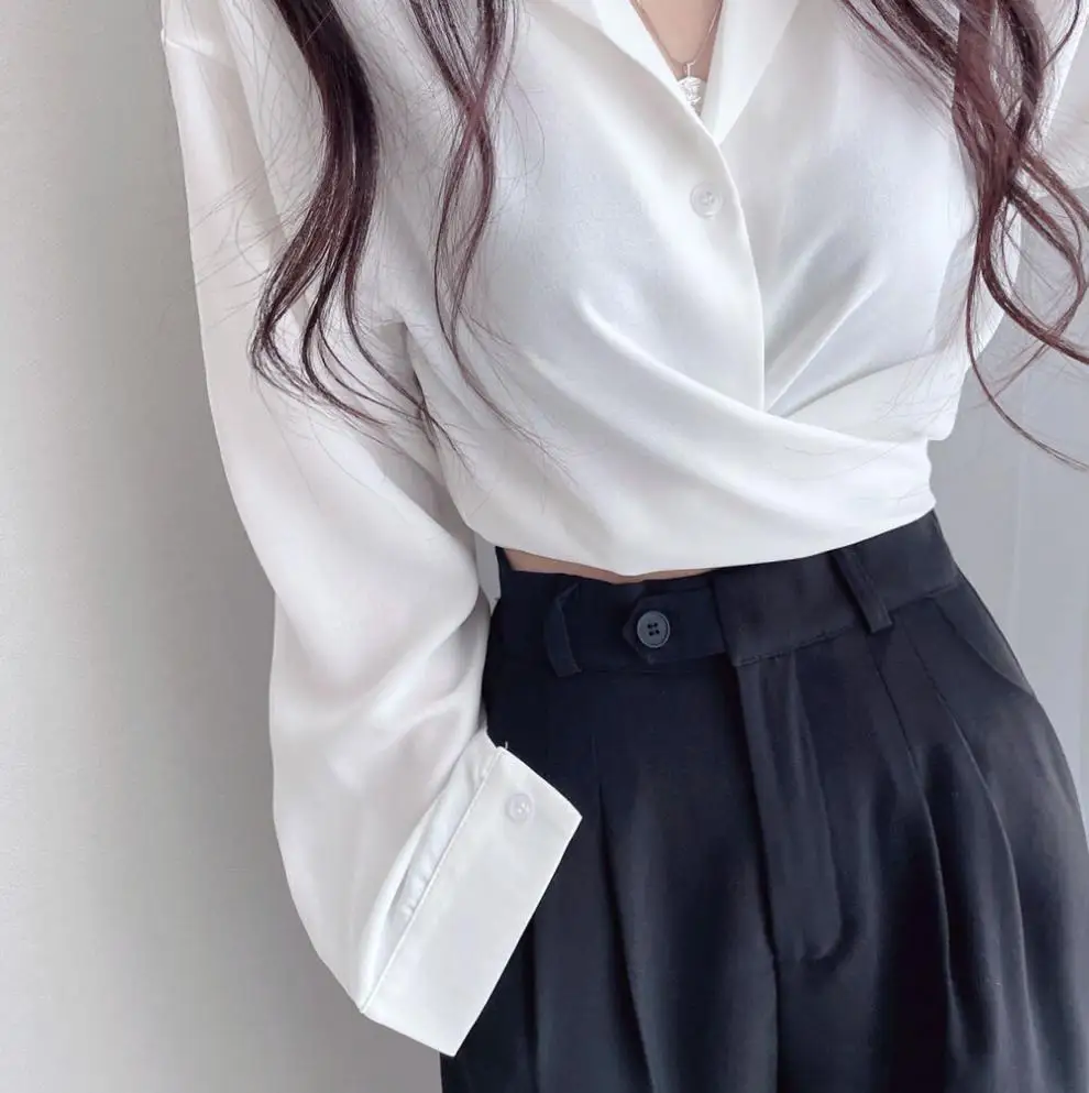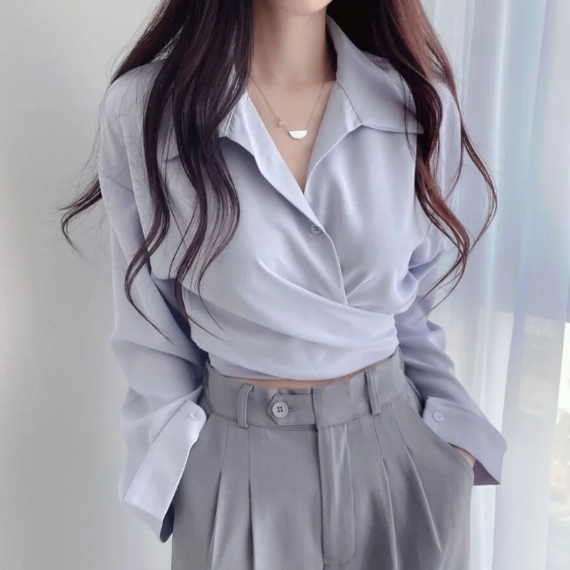 2024 New Autumn Age Reduction Retro Women's Casual Temperament Waist Slimming Lace-up Short Solid Color Shirt