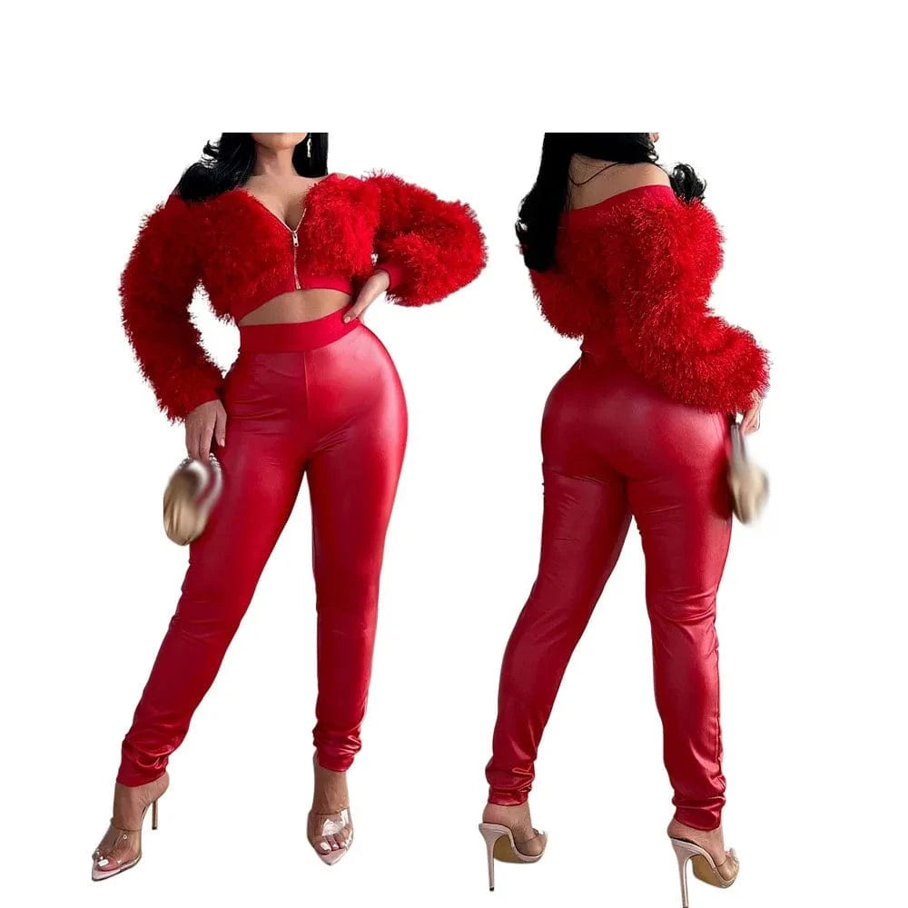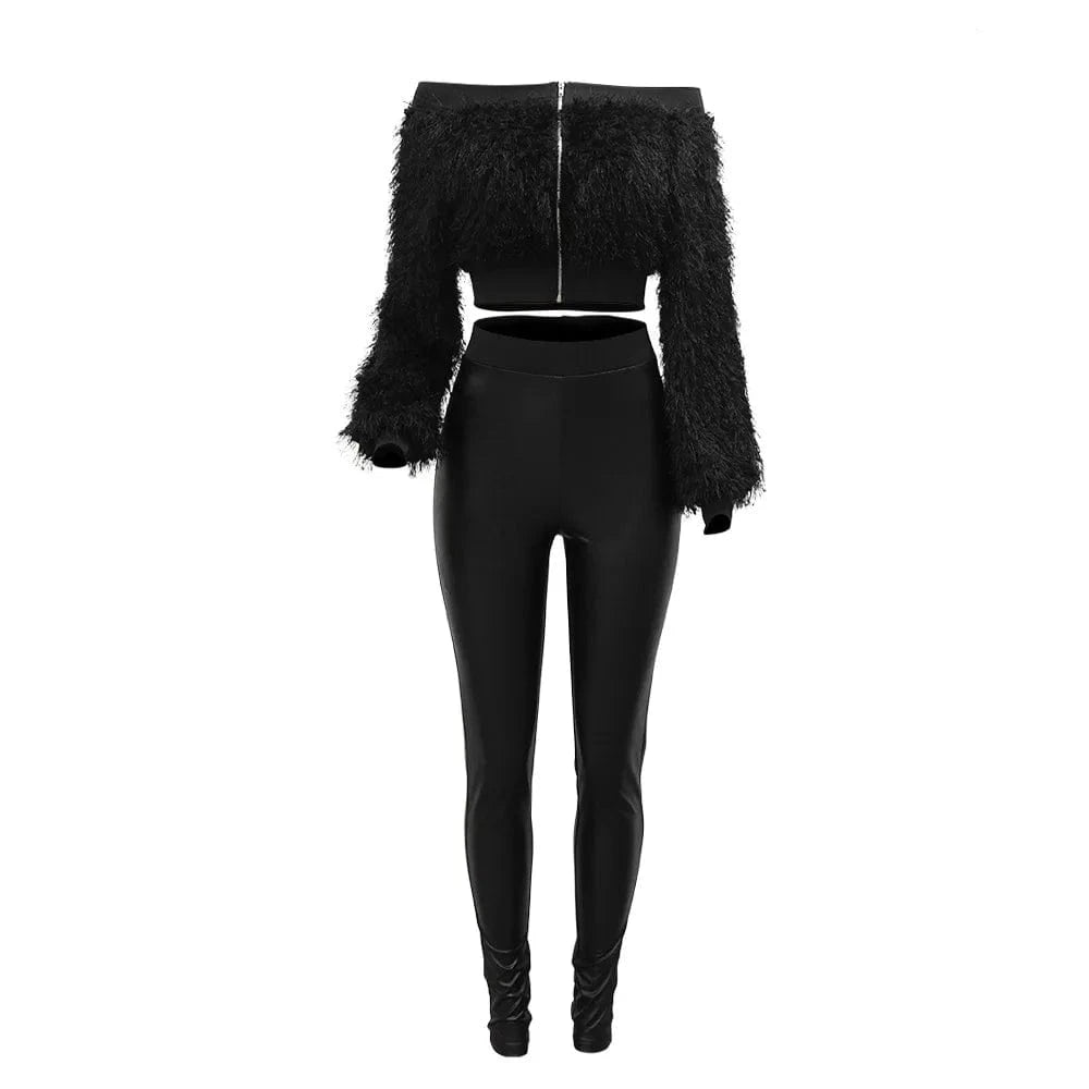 2024 New Fashion Faux Fur Tops 2 Piece Set Spring Women's Clothing Off Shoulder Crop Top+High Waist Pu Pants Set