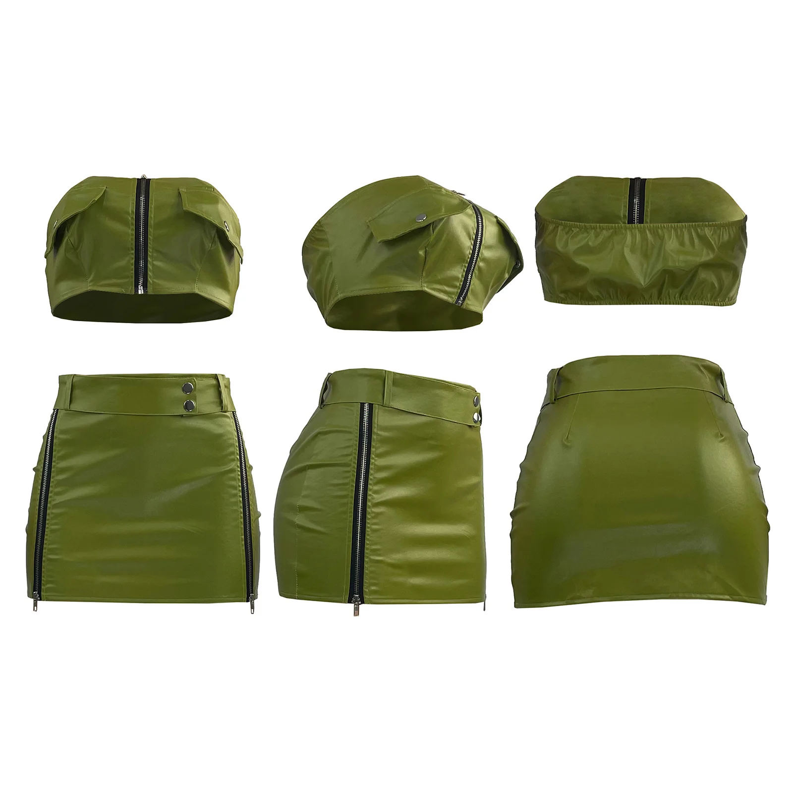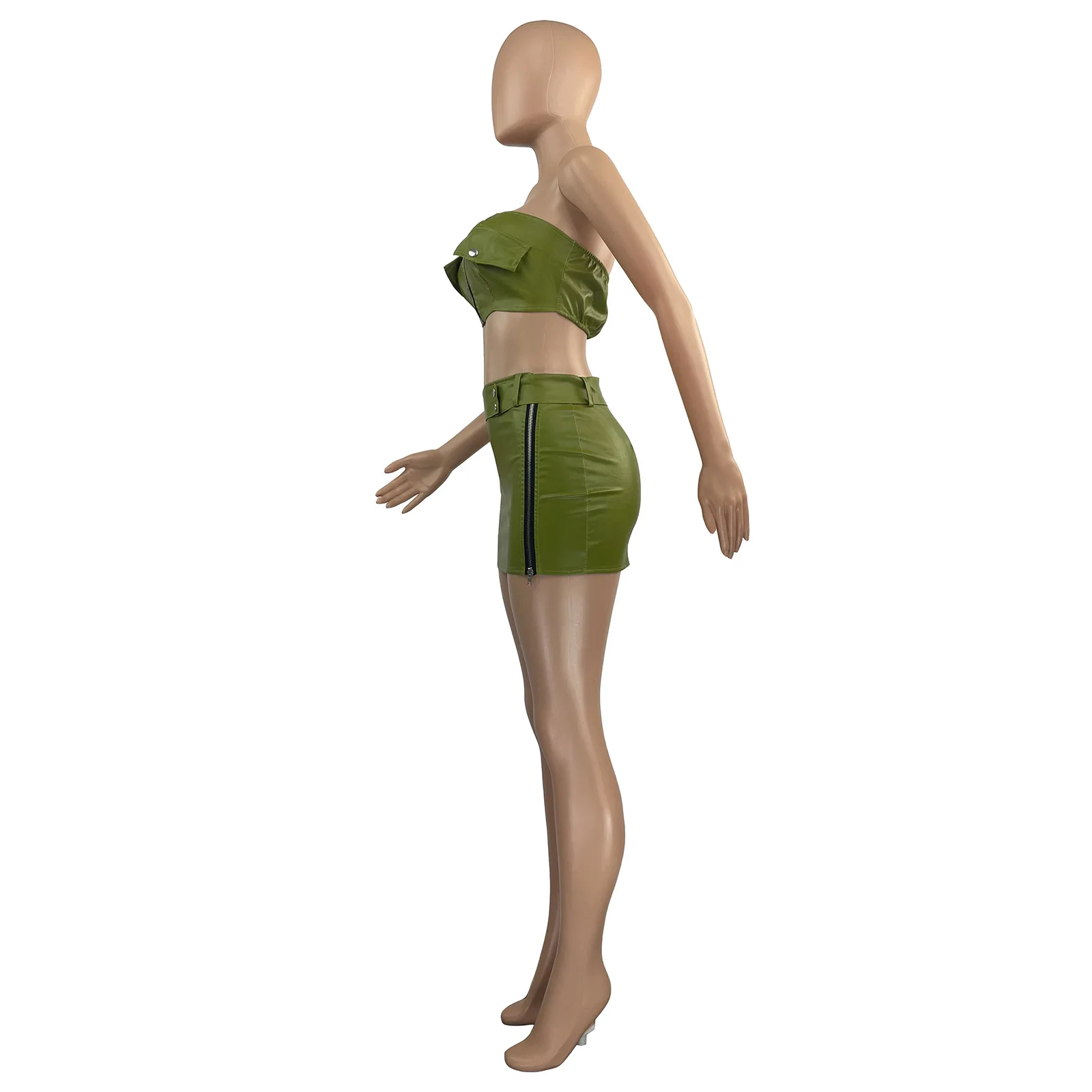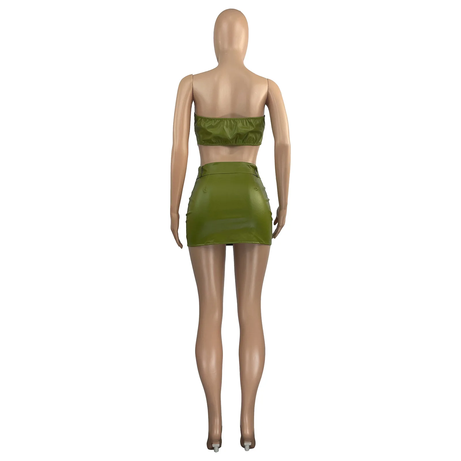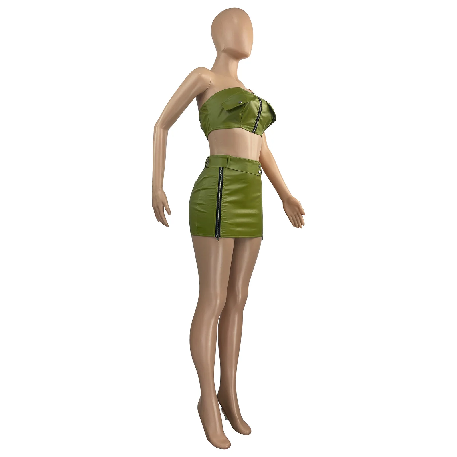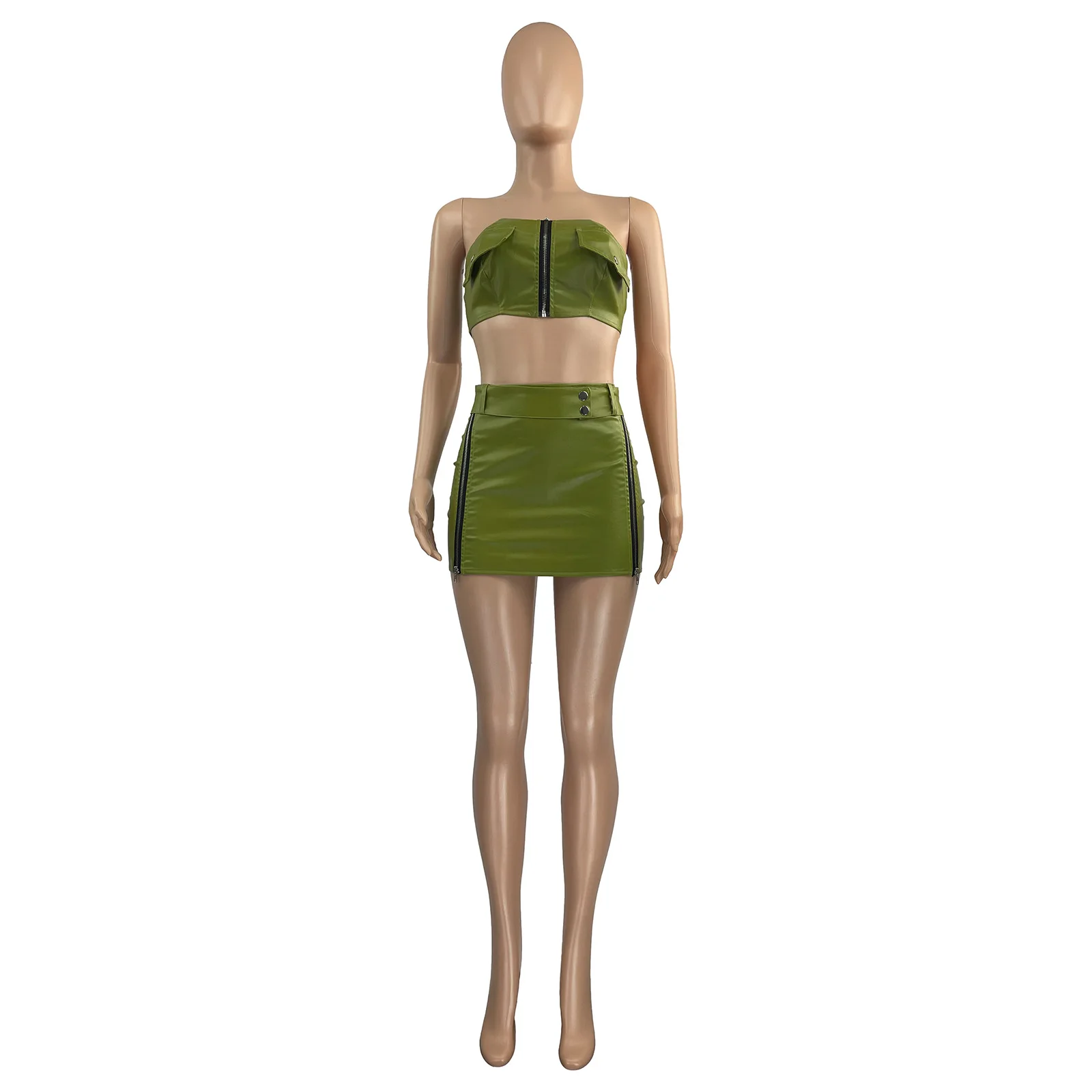2024 New fashion Women Summer Sexy Dress 2 Two Piece Sets Skirt Sleeveless Strapless Crop Zipper Top+mini Skirts Pu Leather Sets