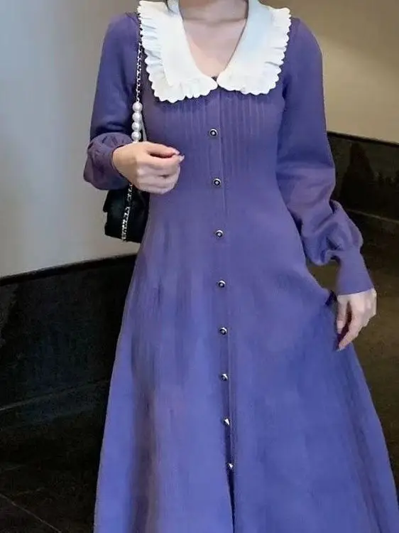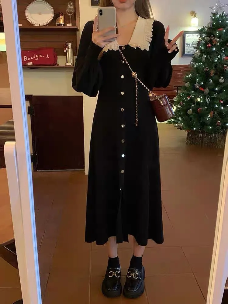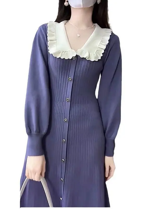 2024 New Gentle Style Retro Lapel Knitted Waist Slimming Dress Niche Lantern Sleeve Long Dress for Women