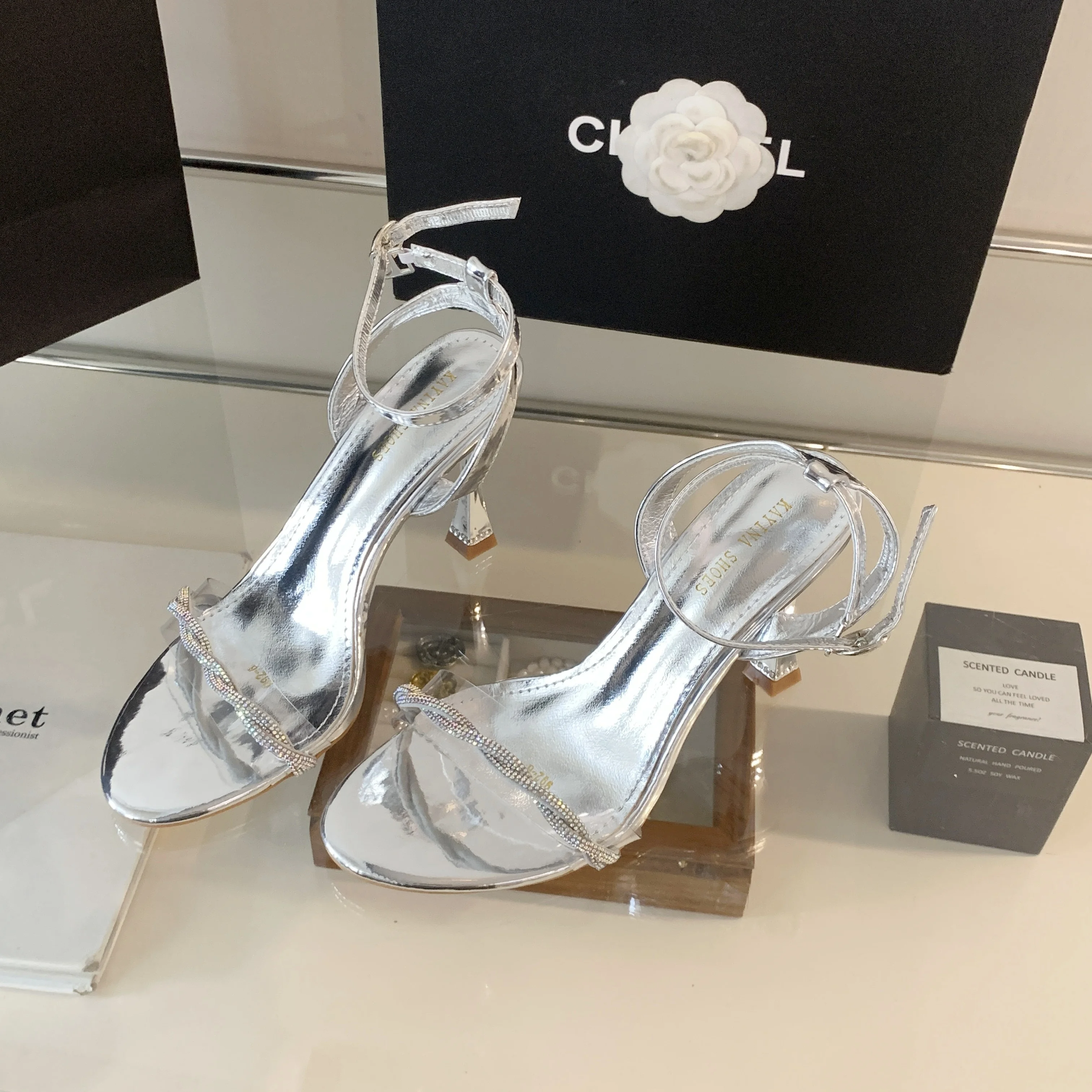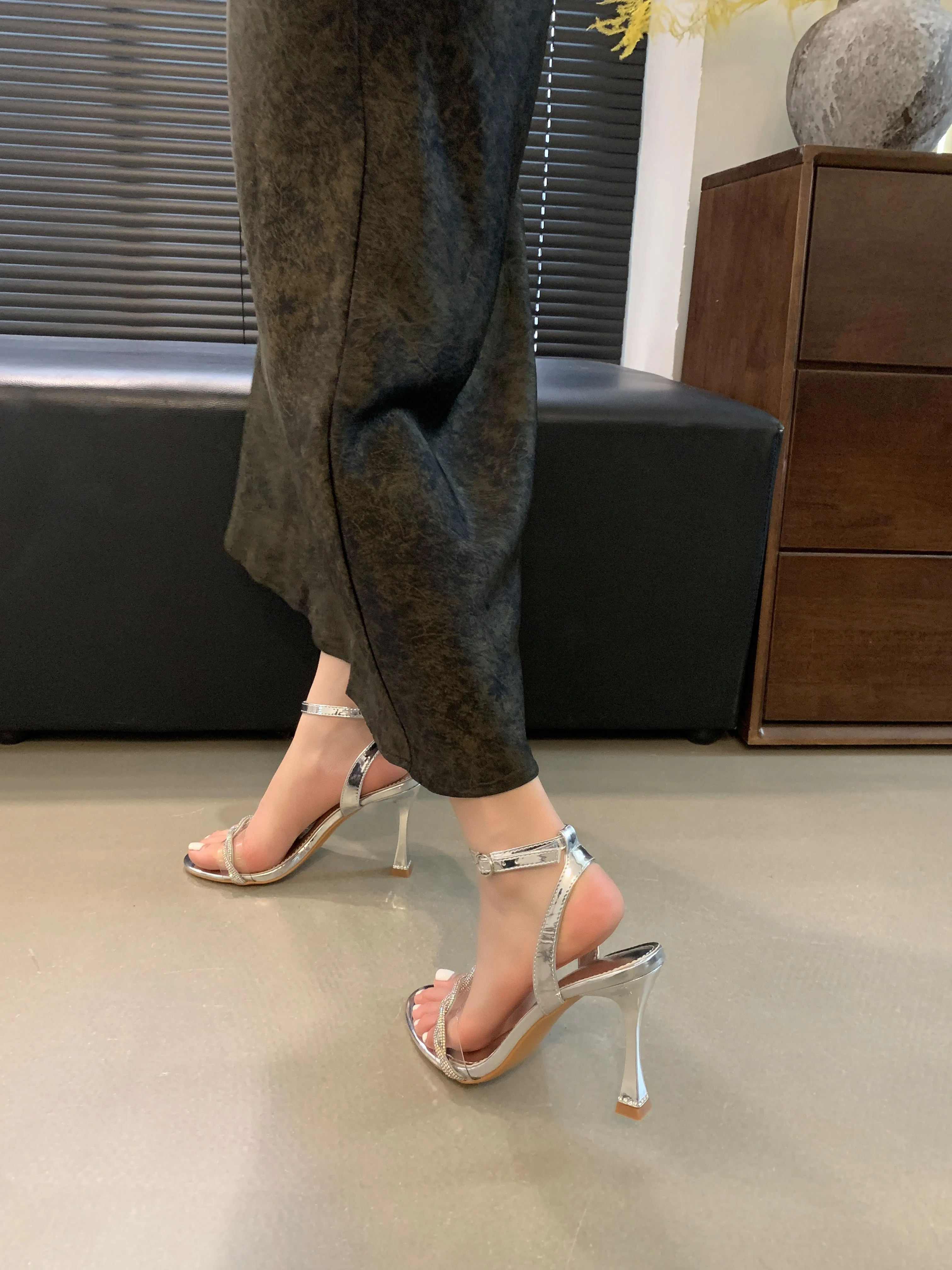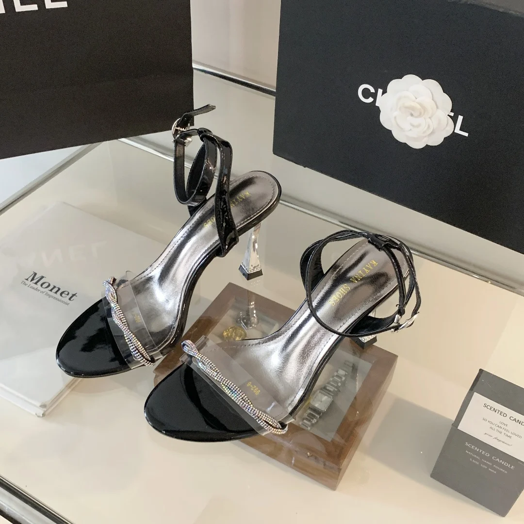 2024 new summer open toe with light luxury fashion rhinestone high heels thin heel black all-match sandals for women
