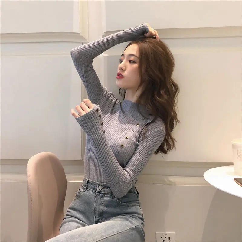 2024 New Winter Button Half High Collar Sweater Women's Undercoat Korean Pullover Slim Fit Knitwear