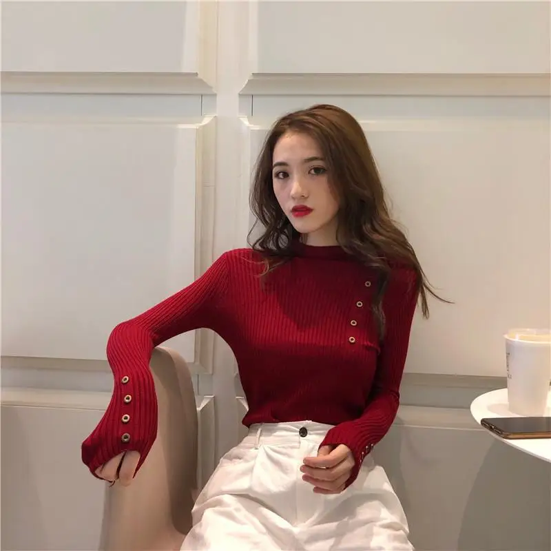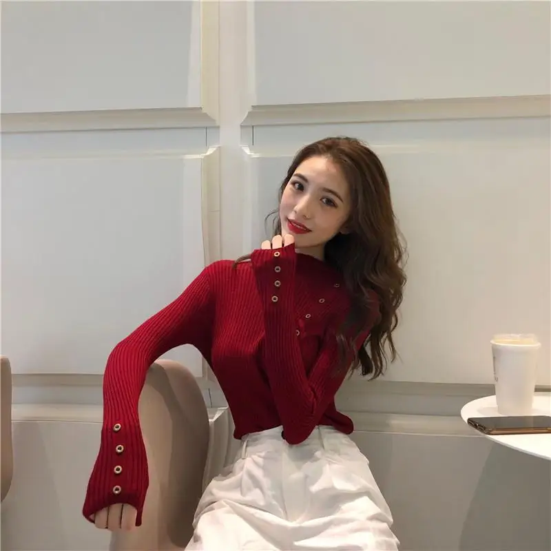 2024 New Winter New Half High Collar Sweater Women's Button Design Knitwear Top Cotton Pullover Sweater