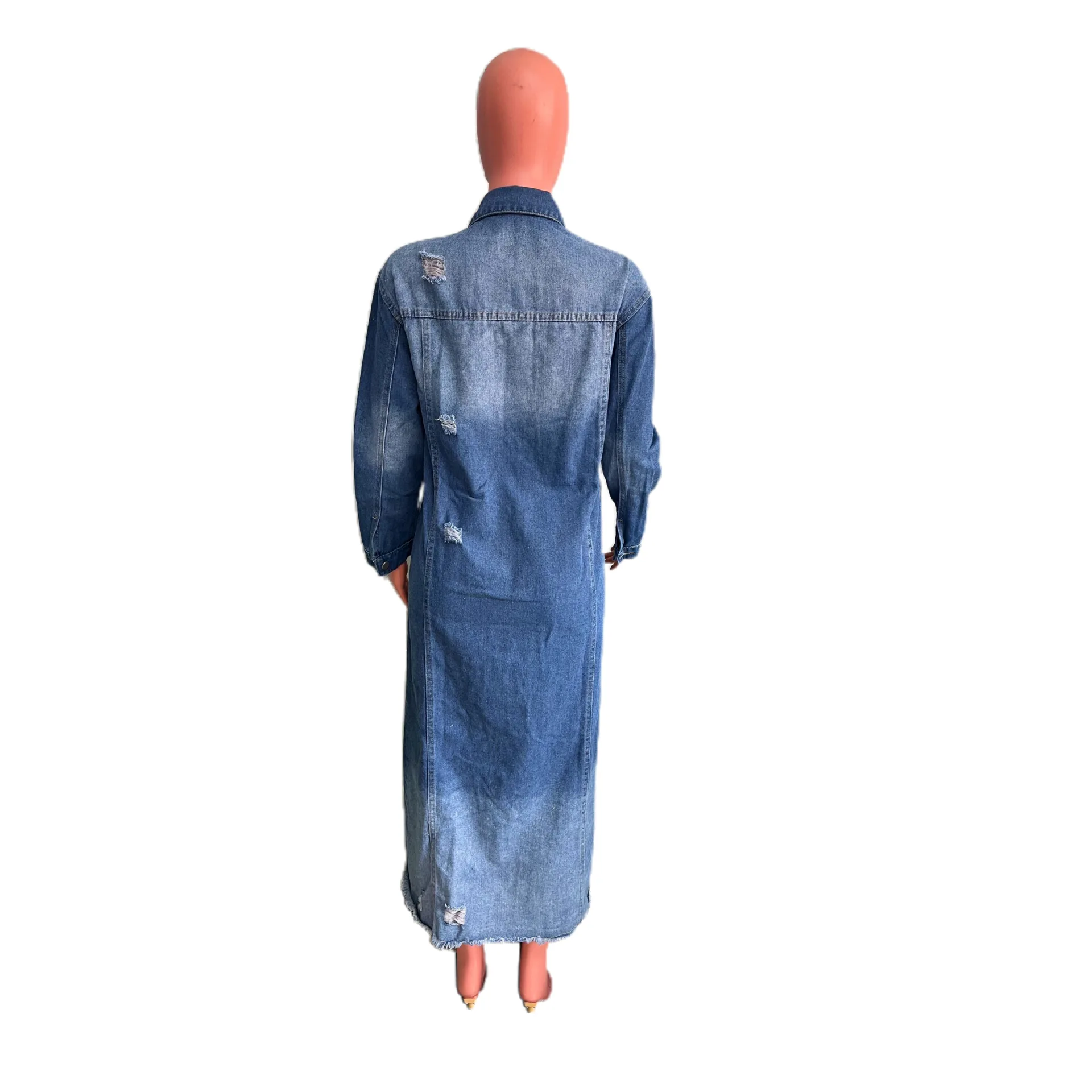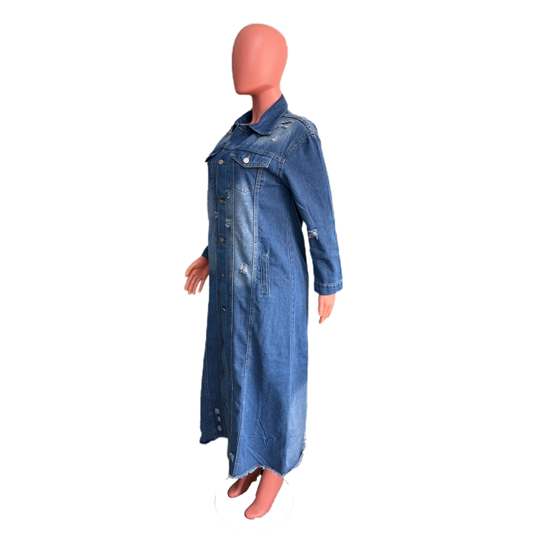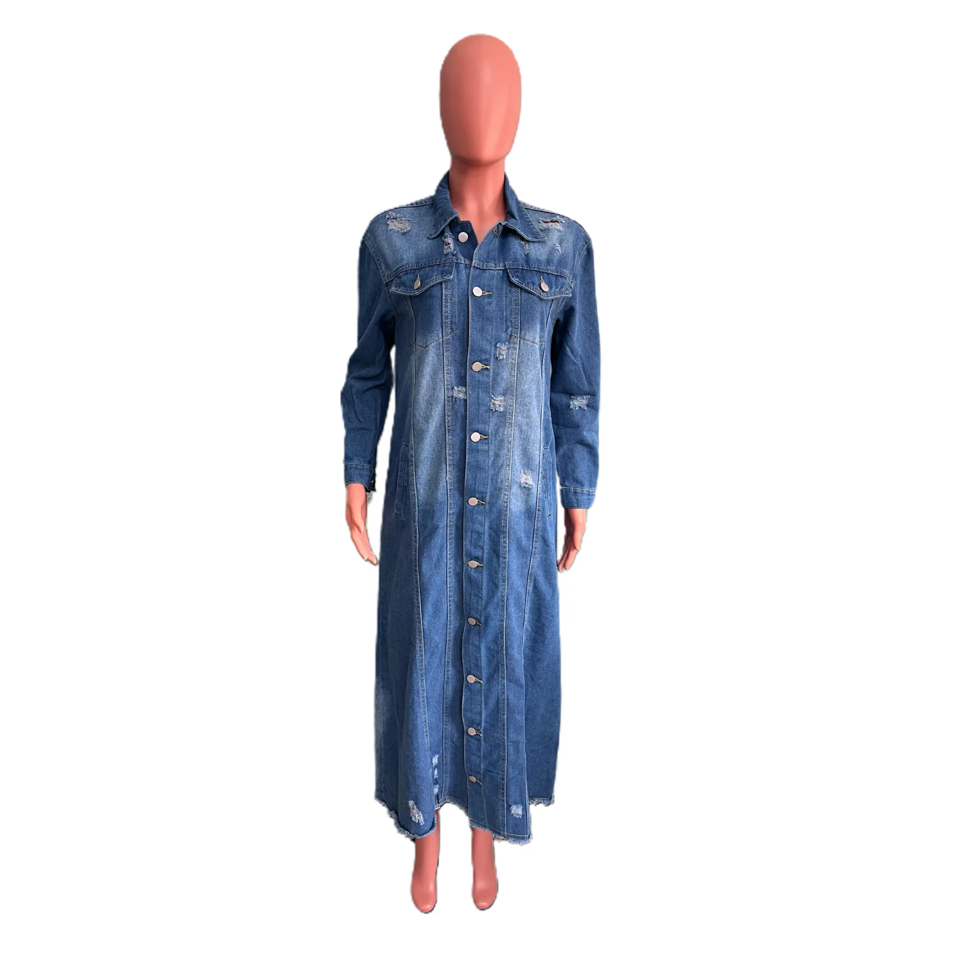 2024 New Winter Ripped Denim Cardigan Coat Turndown Collar Long Jacket Fashion Ladies Long Denim Coat