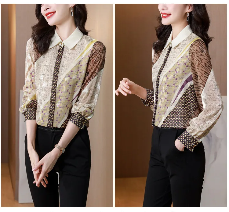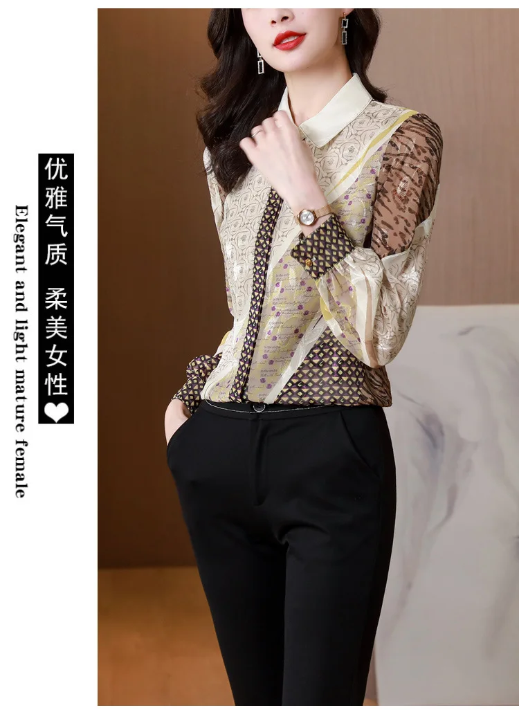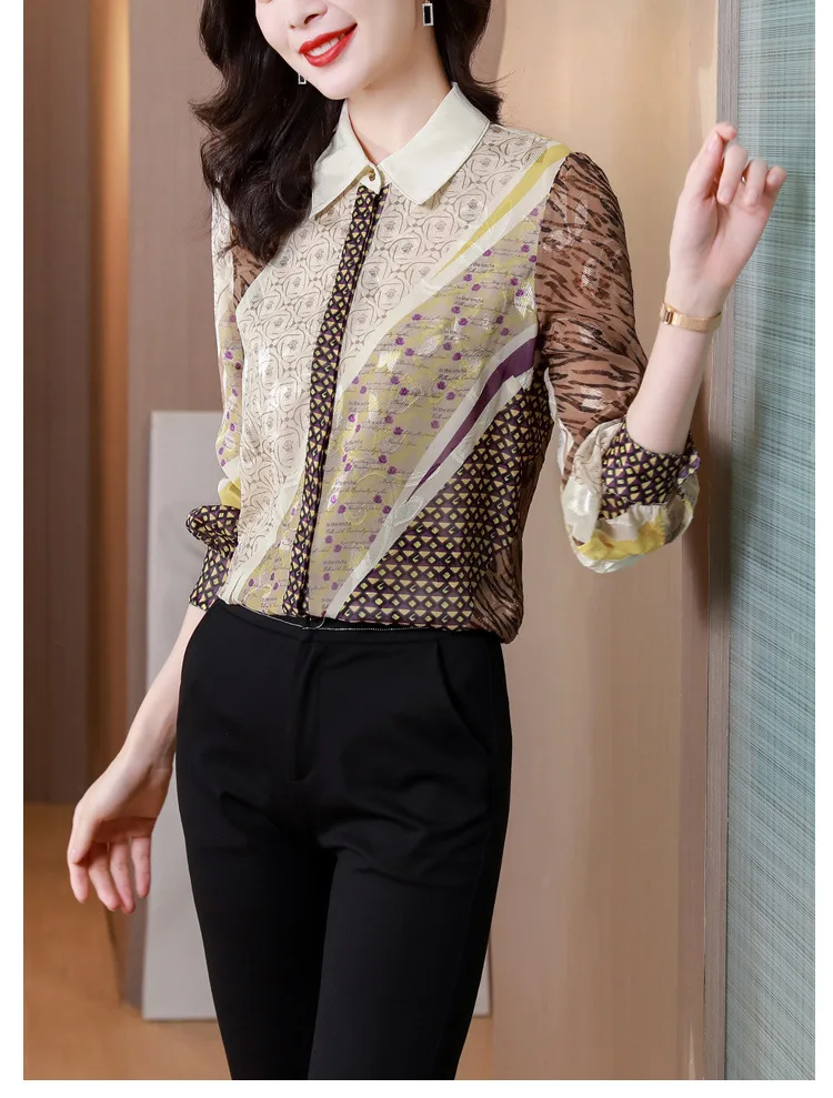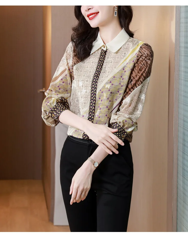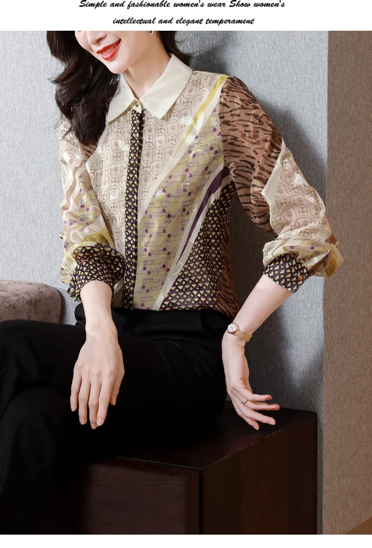 2024 New Women's Long Sleeve Shirts Letter Printing Turn Down Collar Buttoned Up Workwear Office Chiffon Blouses Shirt Fall