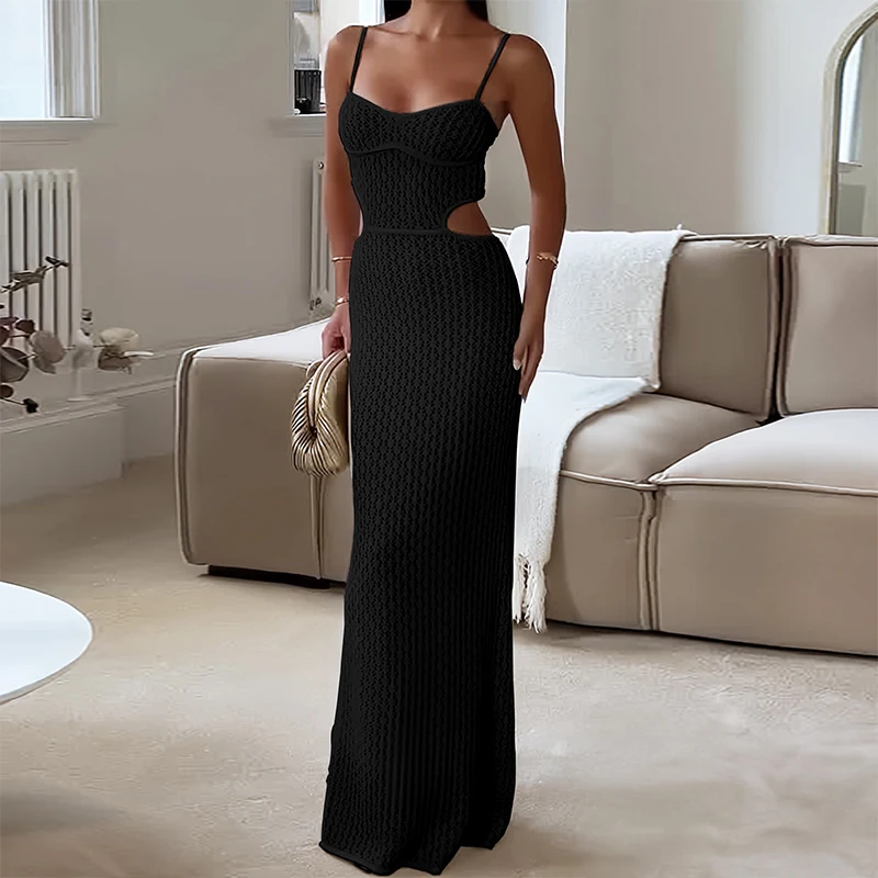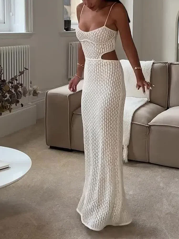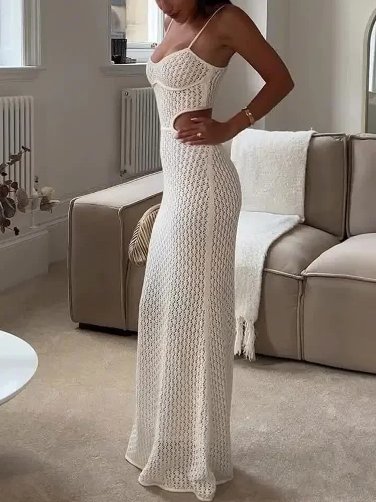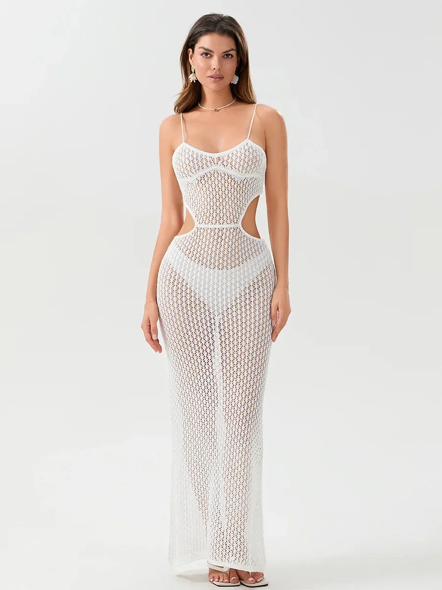 2024 Sexy See-through V Neck Cut Out Knit Beach Maxi Dress Summer Women's Holiday Elegant Outfit Swimsuit Cover Up Tunic A3094