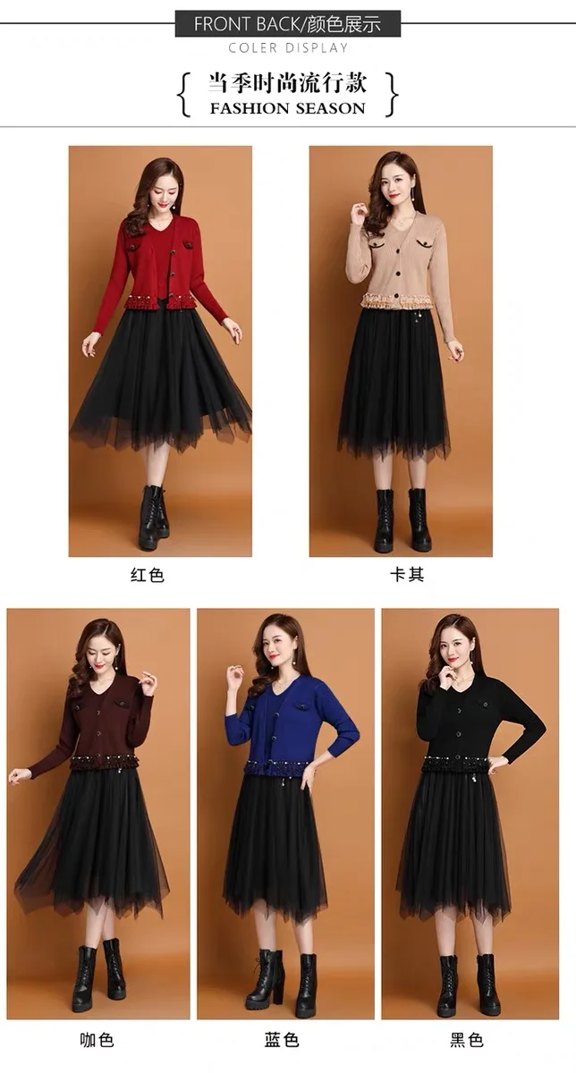 2024 Spring and Autumn high quality button design lace solid color loose women V-neck mid-length two-piece suit dress