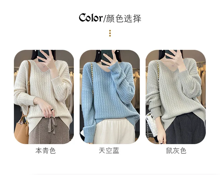 2024 Spring and Autumn high-quality fashion women's v neck long-sleeved loose solid-color jacquard knit pullover sweater