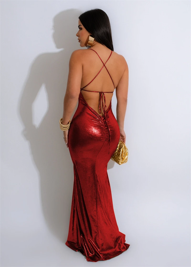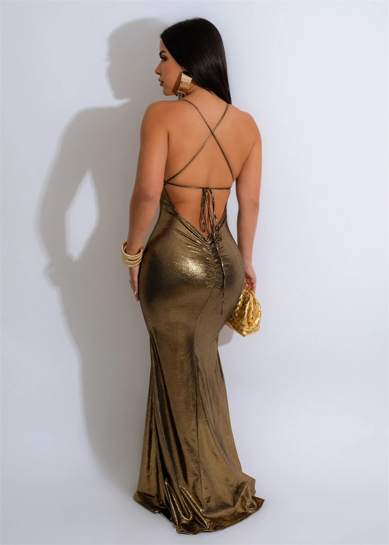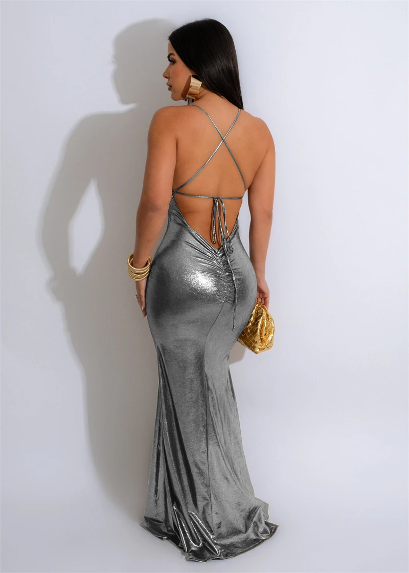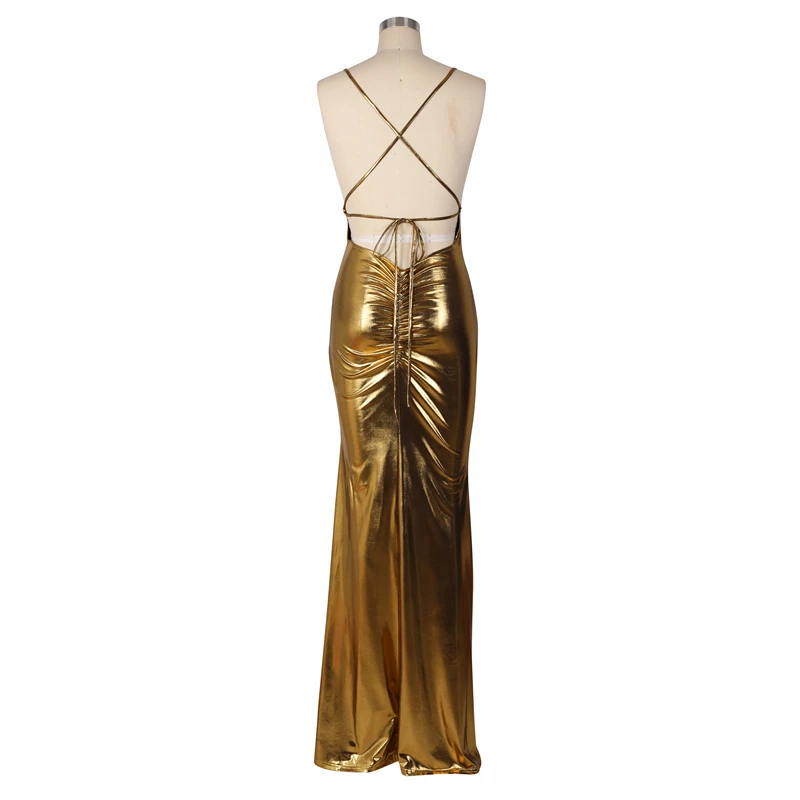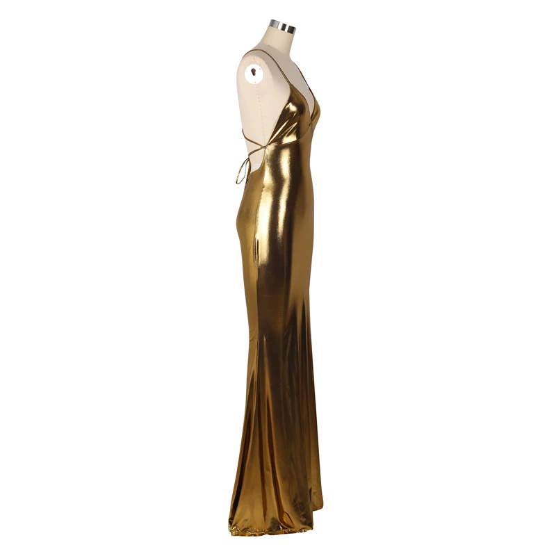 2024 summer custom women knit gold silver sexy bandage shiny metallic fabric clubwear nightclub backless maxi long evening dress