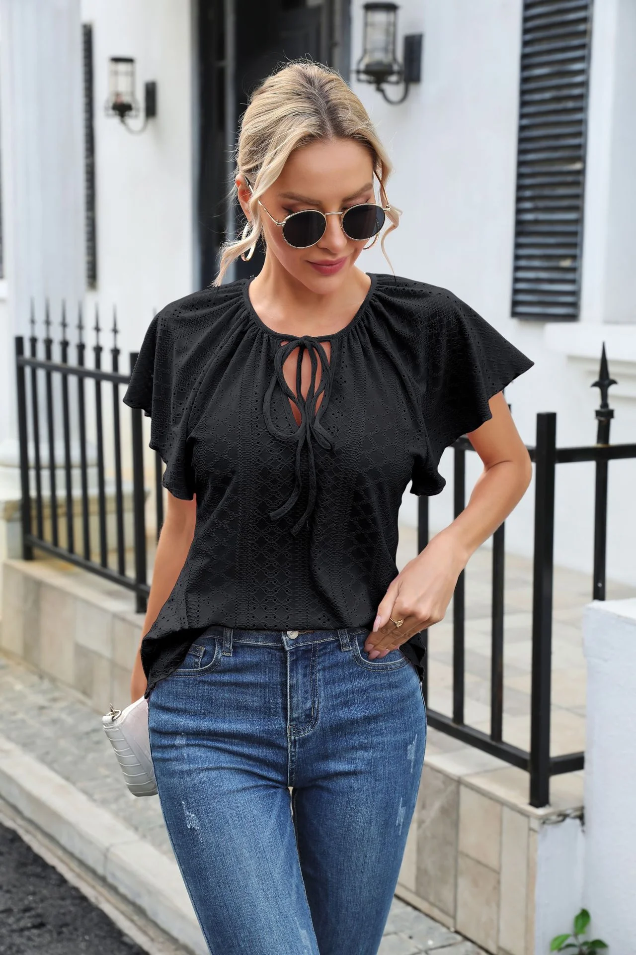 2024 Summer Fashionable Women Shirts Solid Color Women's Hollow Jacquard Ruffle Edge Raglan Sleeve Lace Short Sleeve Shirt