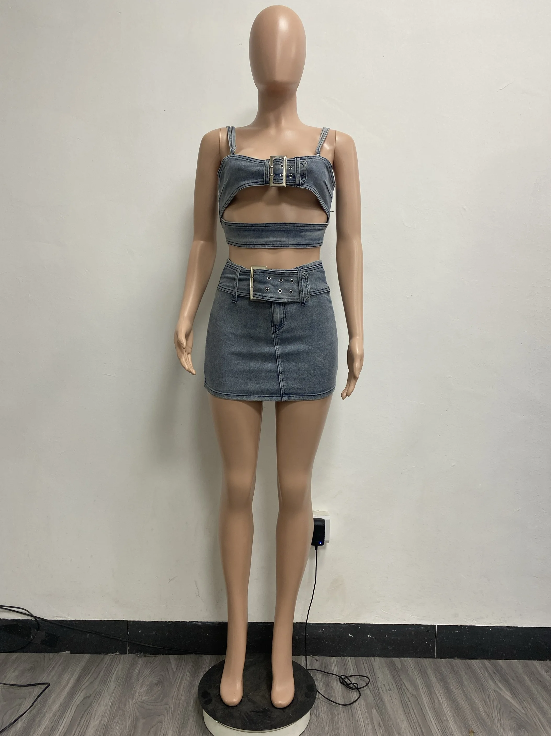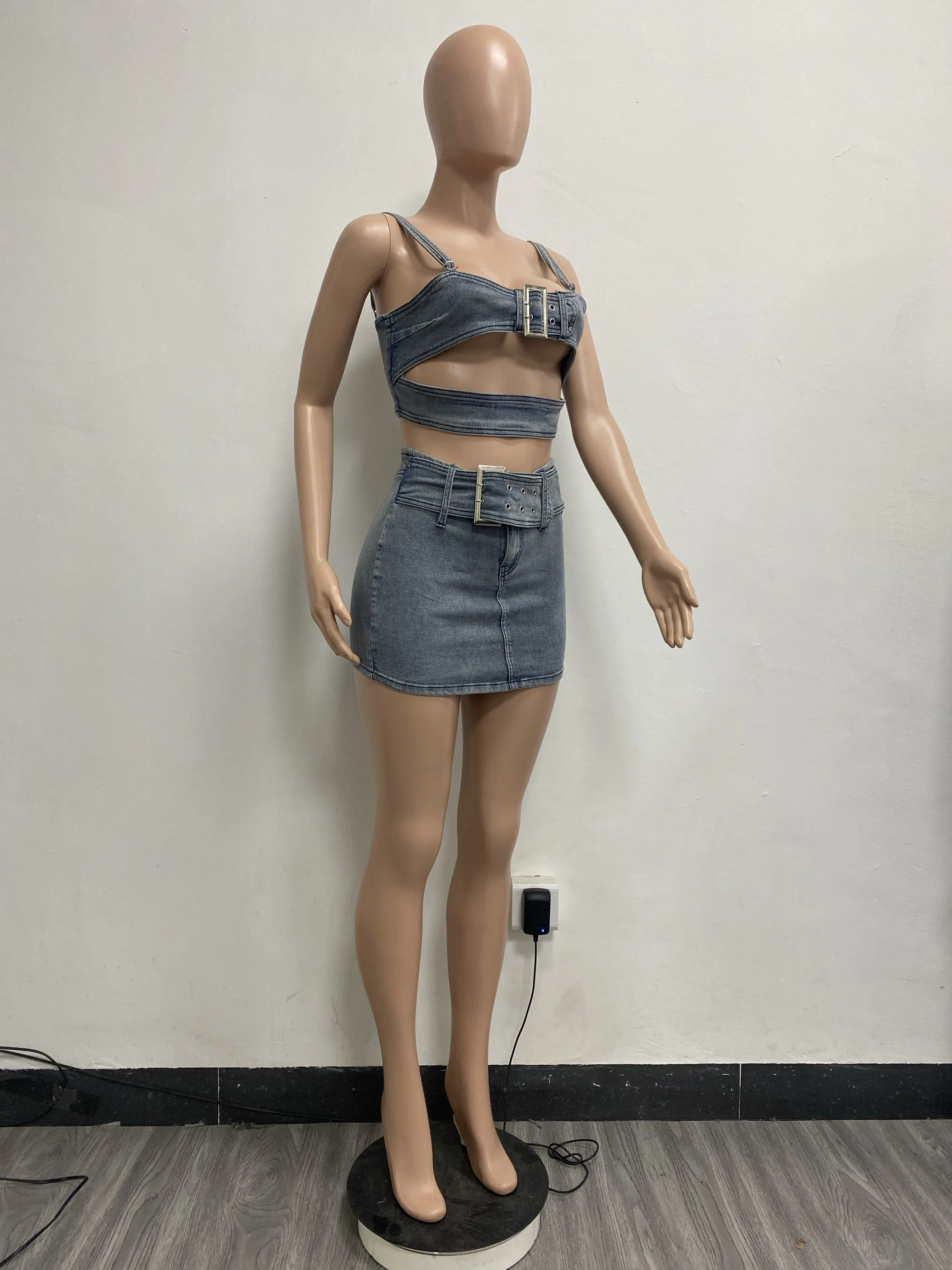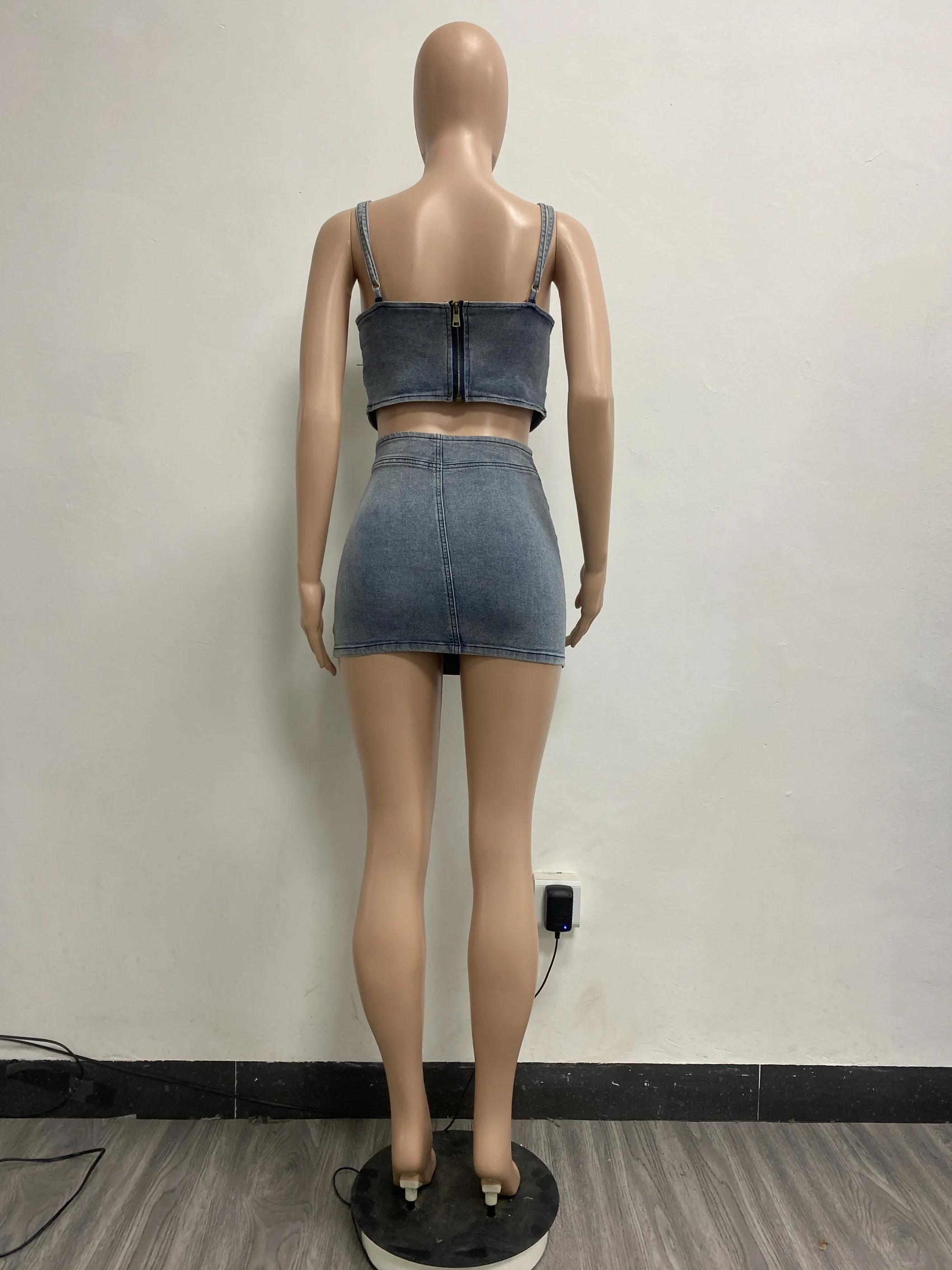 2024 summer new arrivals S-2XL sleeveless denim jeans 2 piece skirt and top set for women