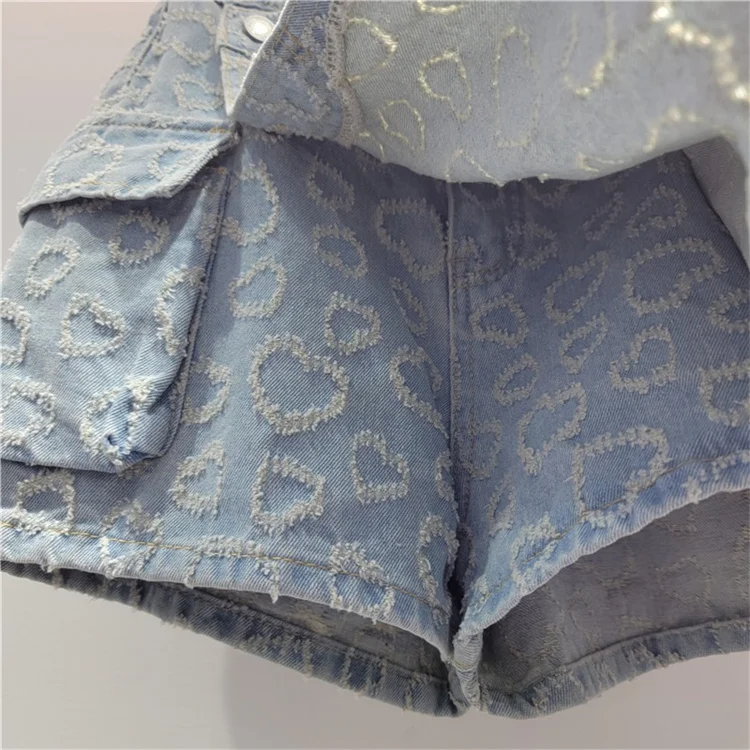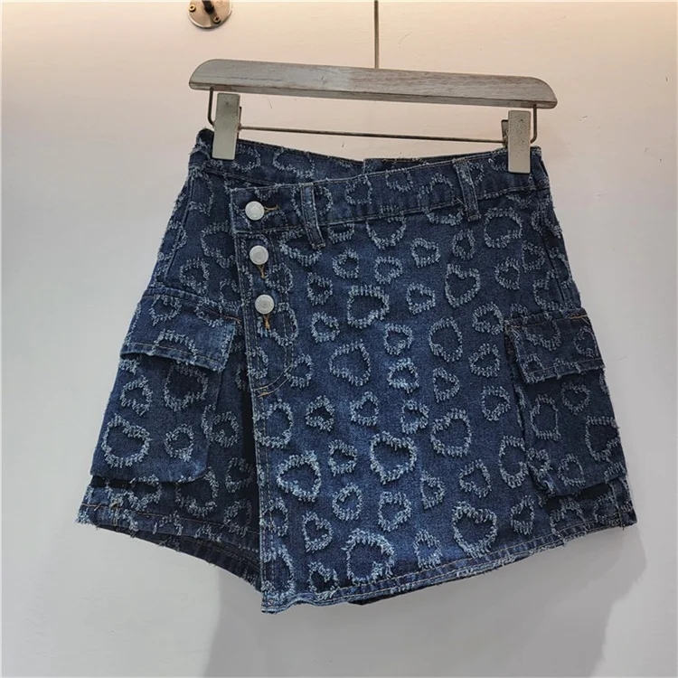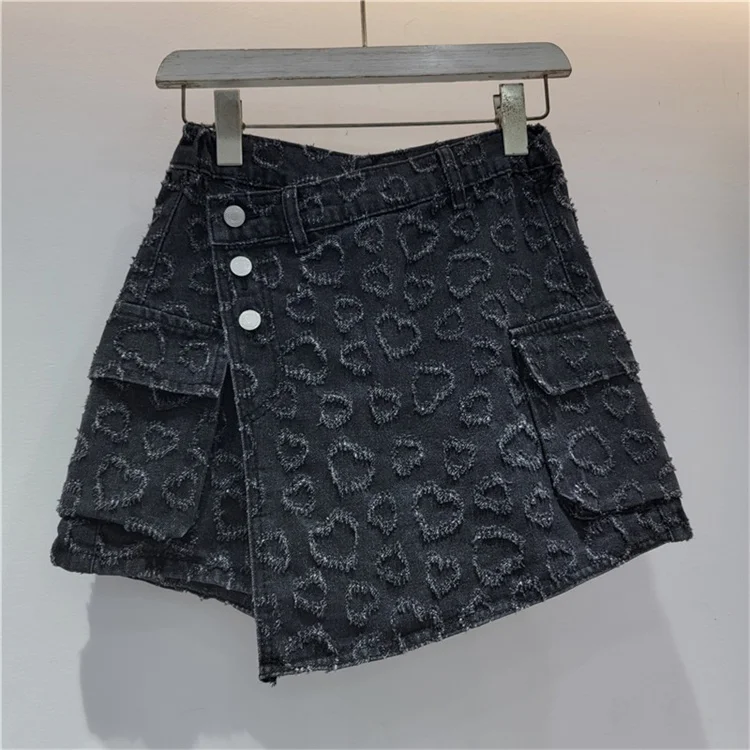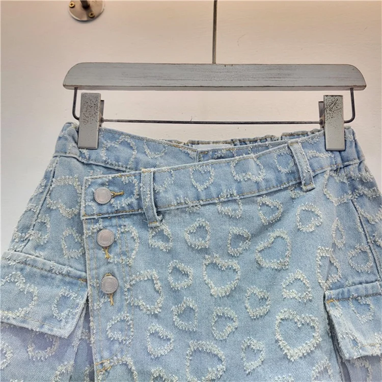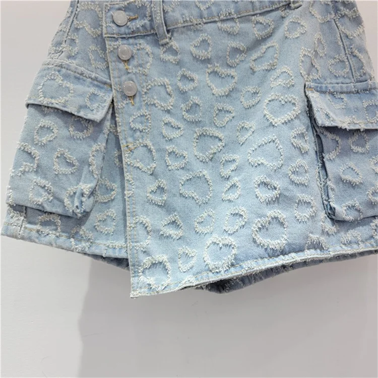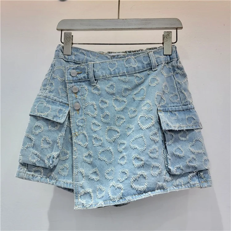 2024 Summer New Fashion Women Denim Skirt Heart Jacquard Pockets Patchwork A-line High Waist Cargo Mini Skirt