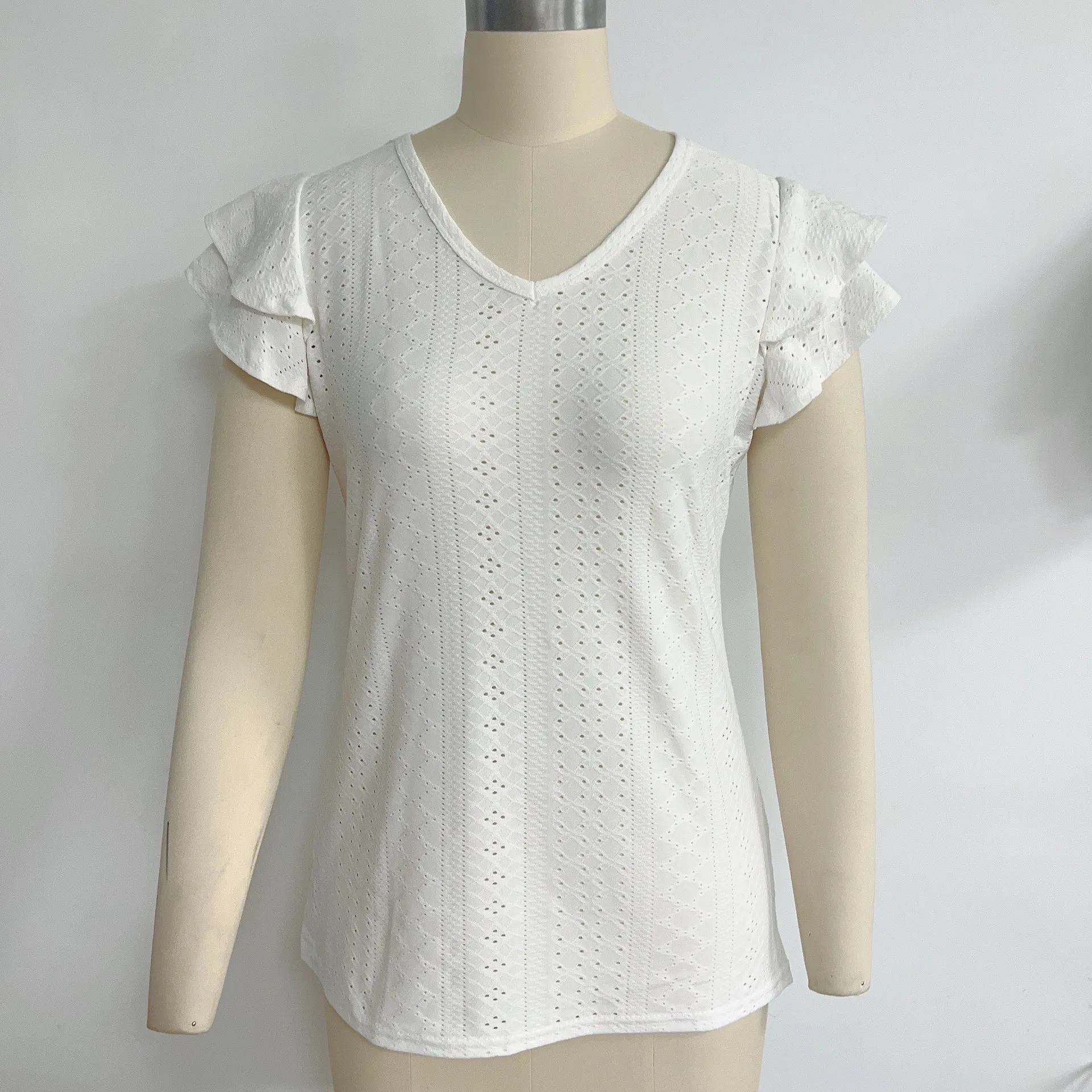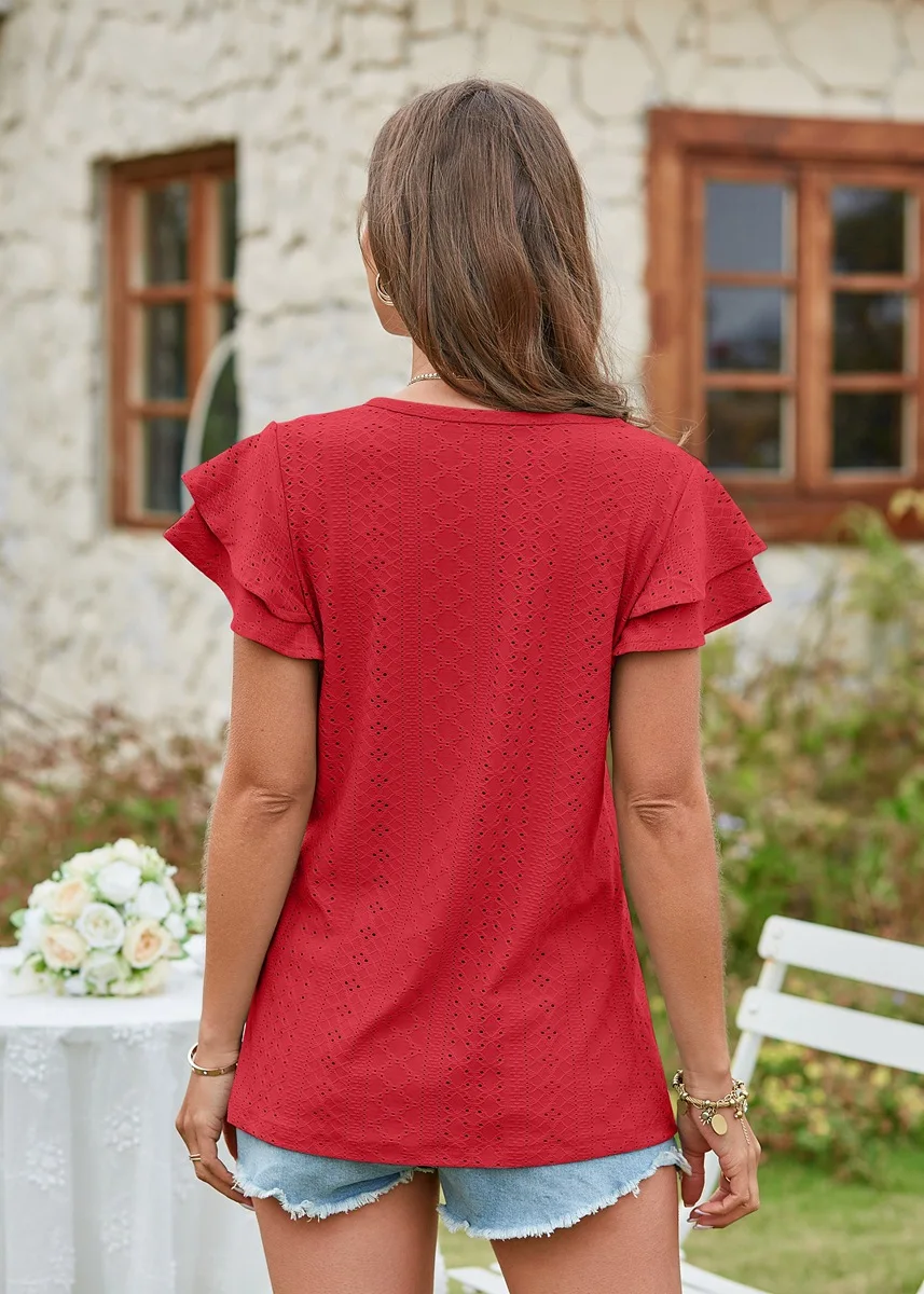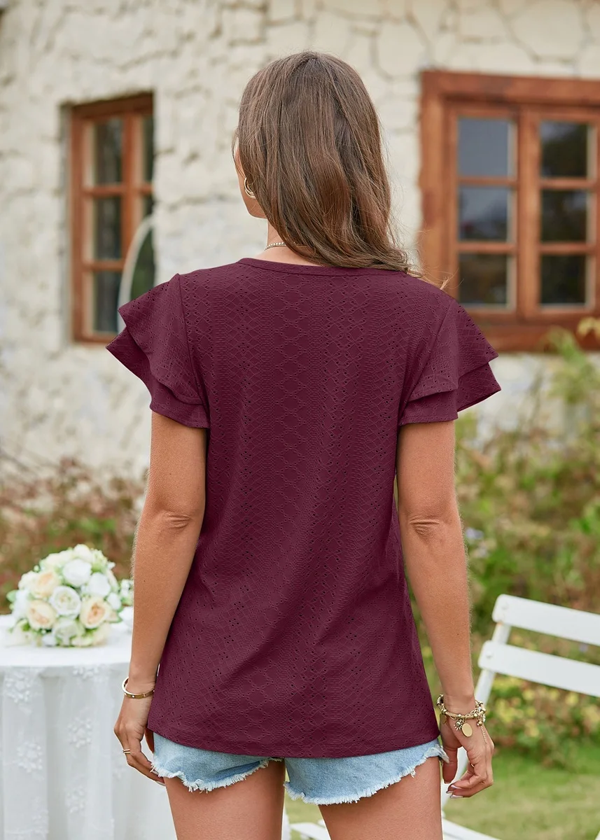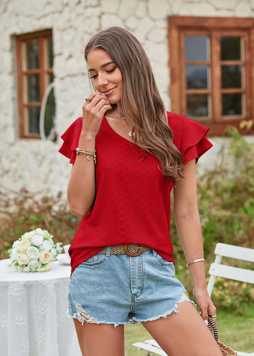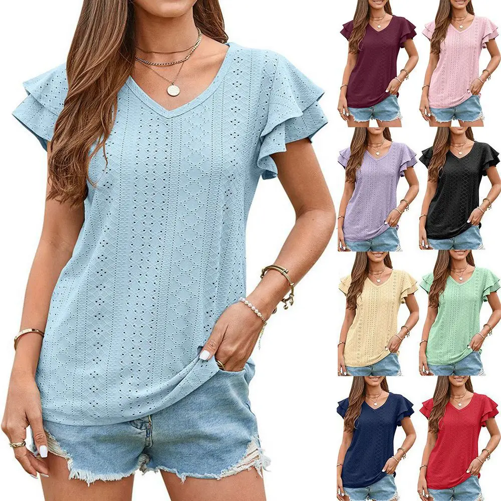 2024 Summer New Women's Fashion T-shirt with hollowed out lotus leaf sleeves for comfortable and casual women's top