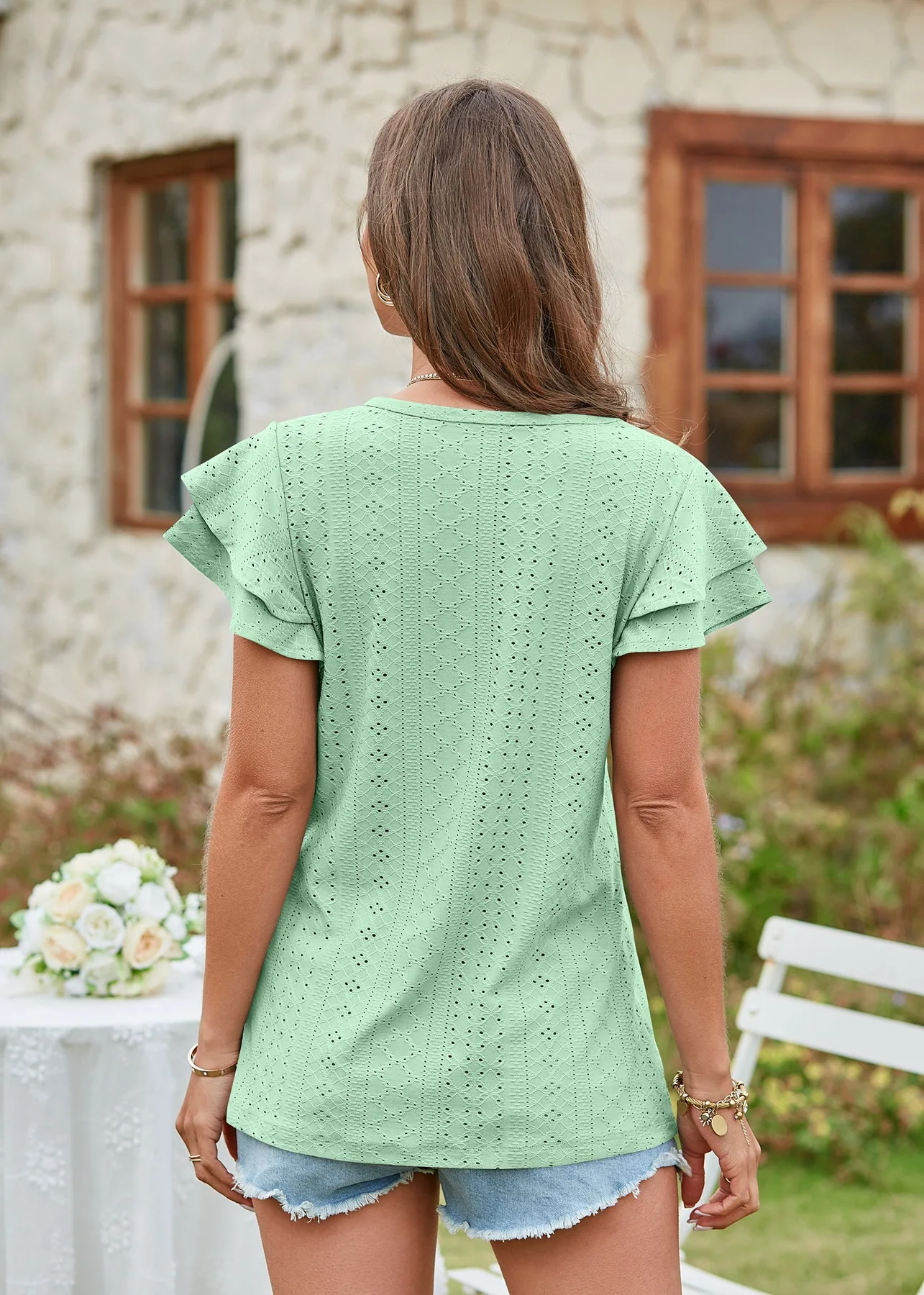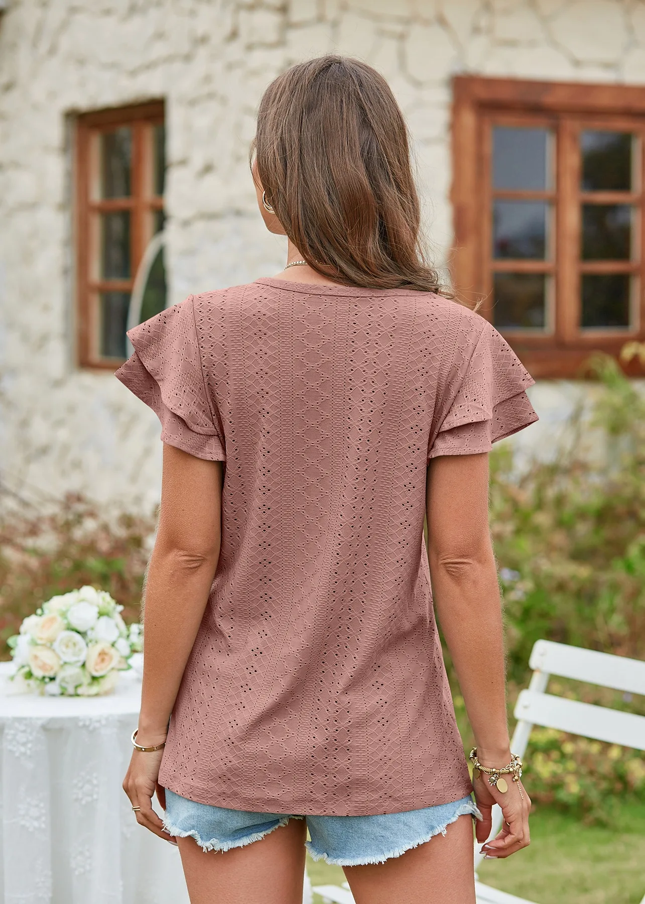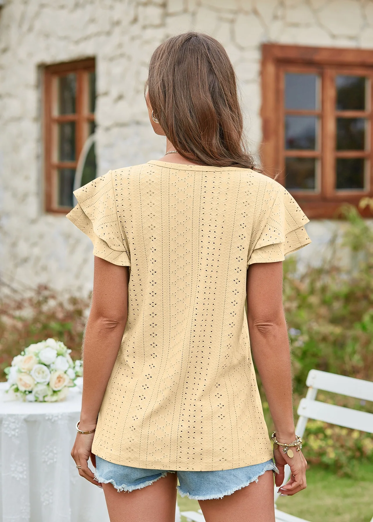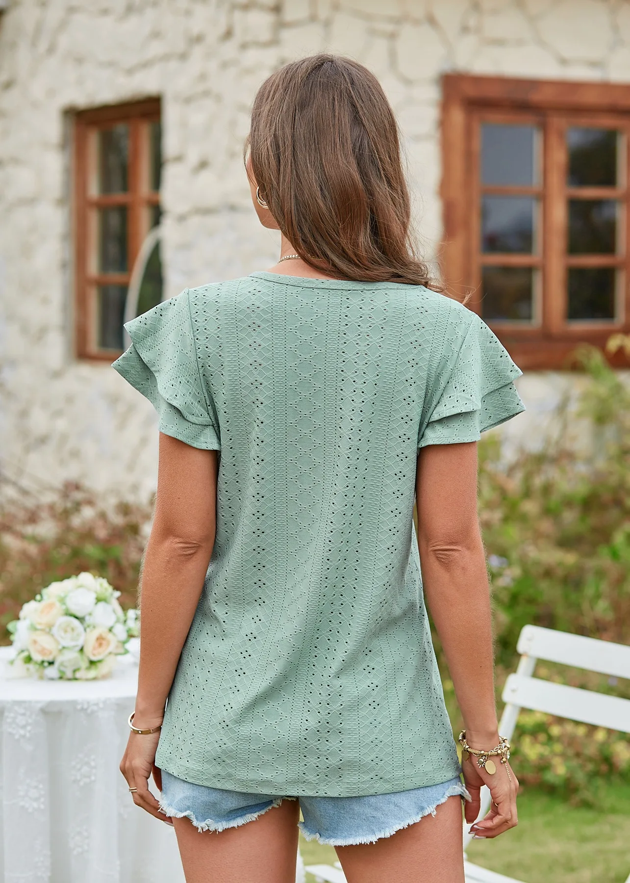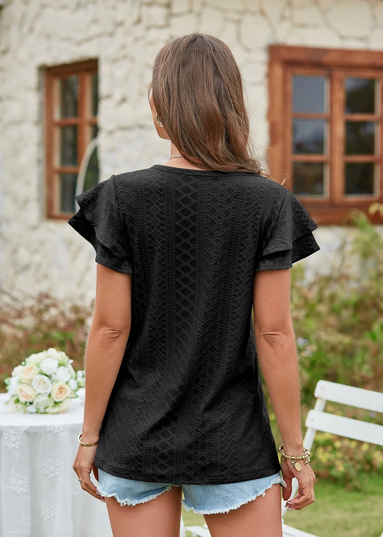 2024 Summer New Women's Fashion T-shirt with hollowed out lotus leaf sleeves for comfortable and casual women's top