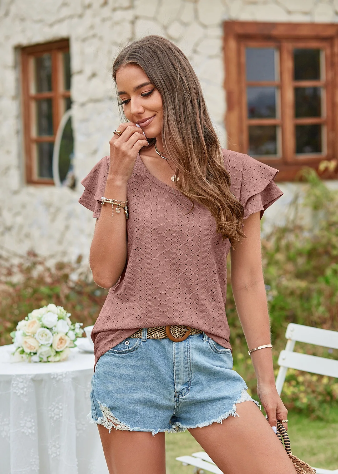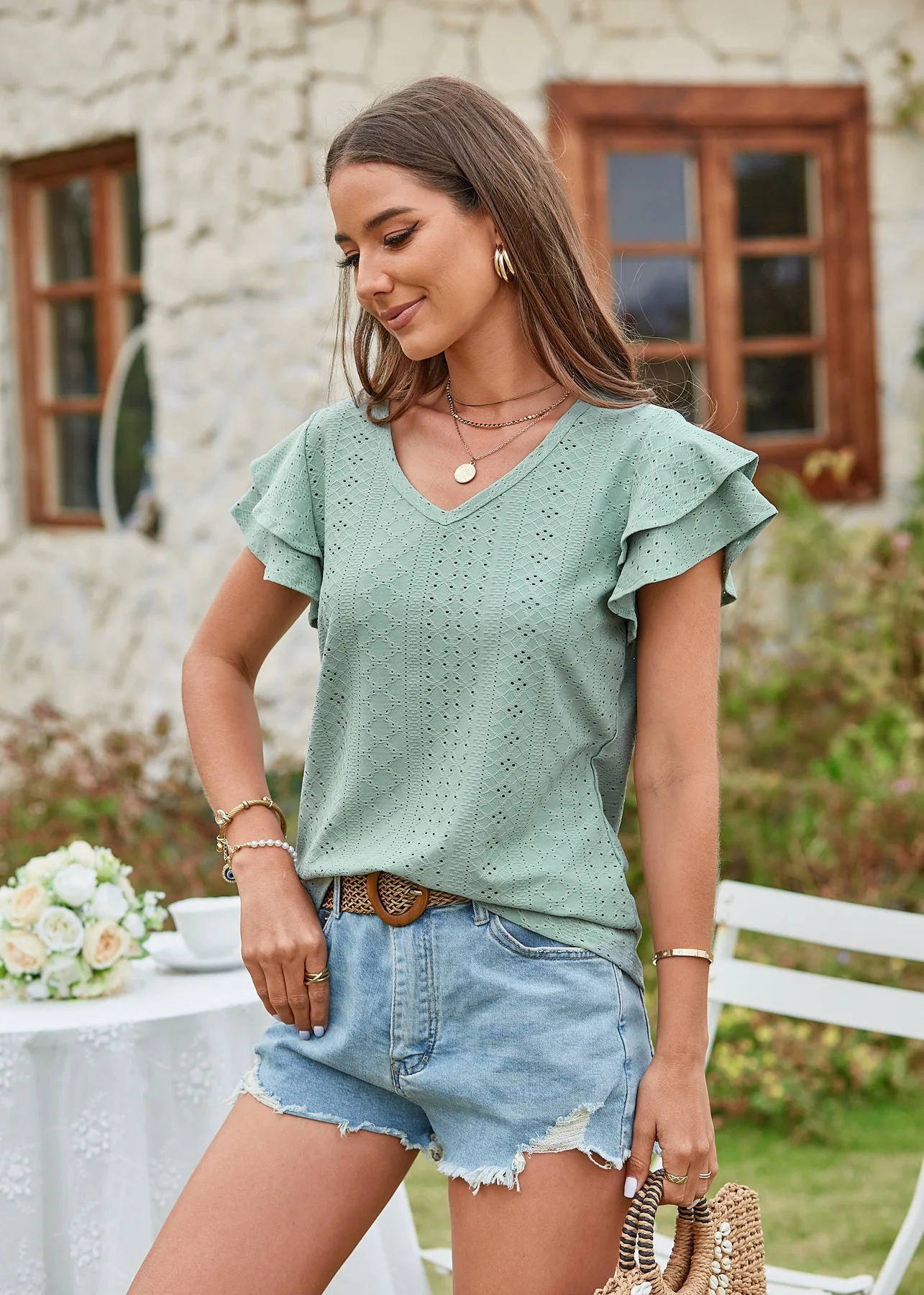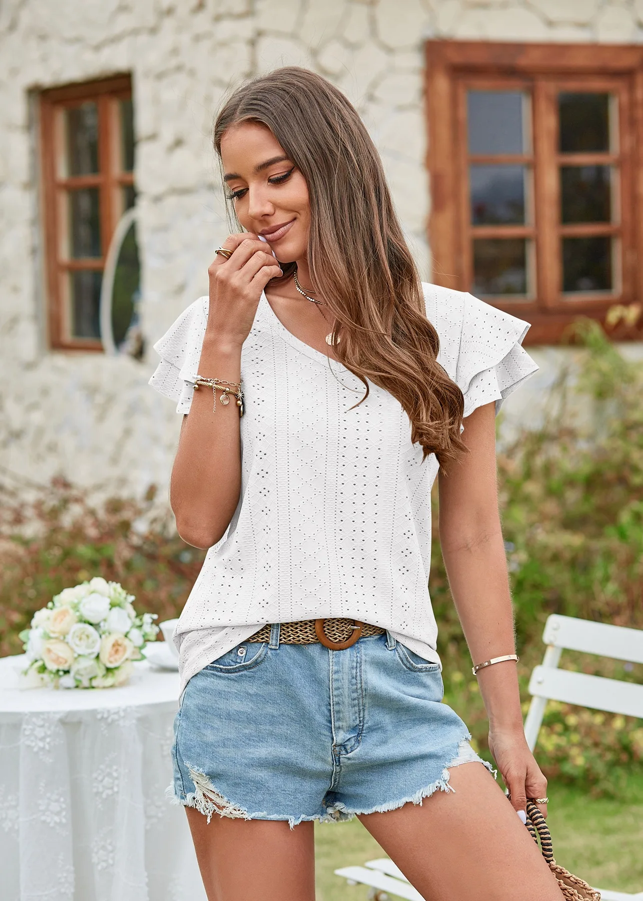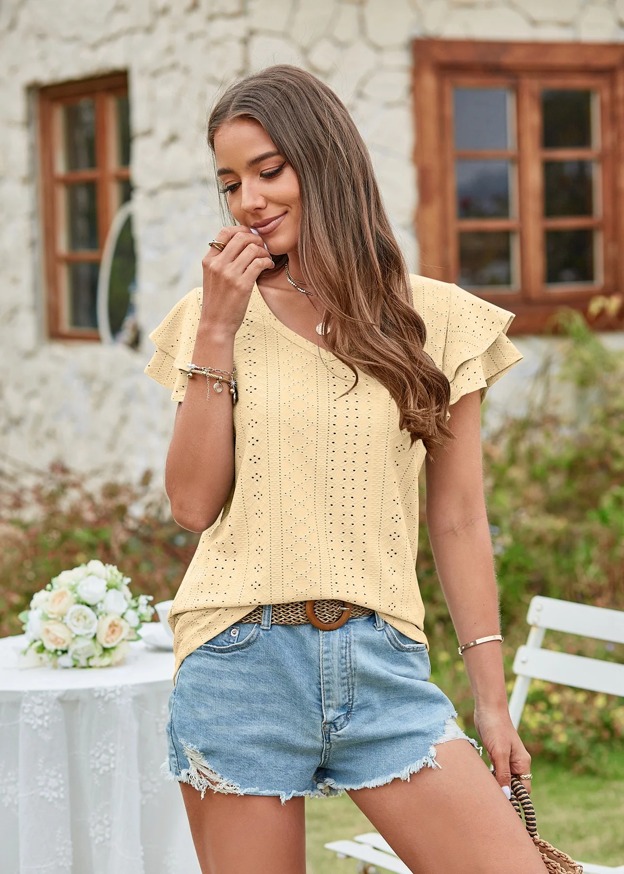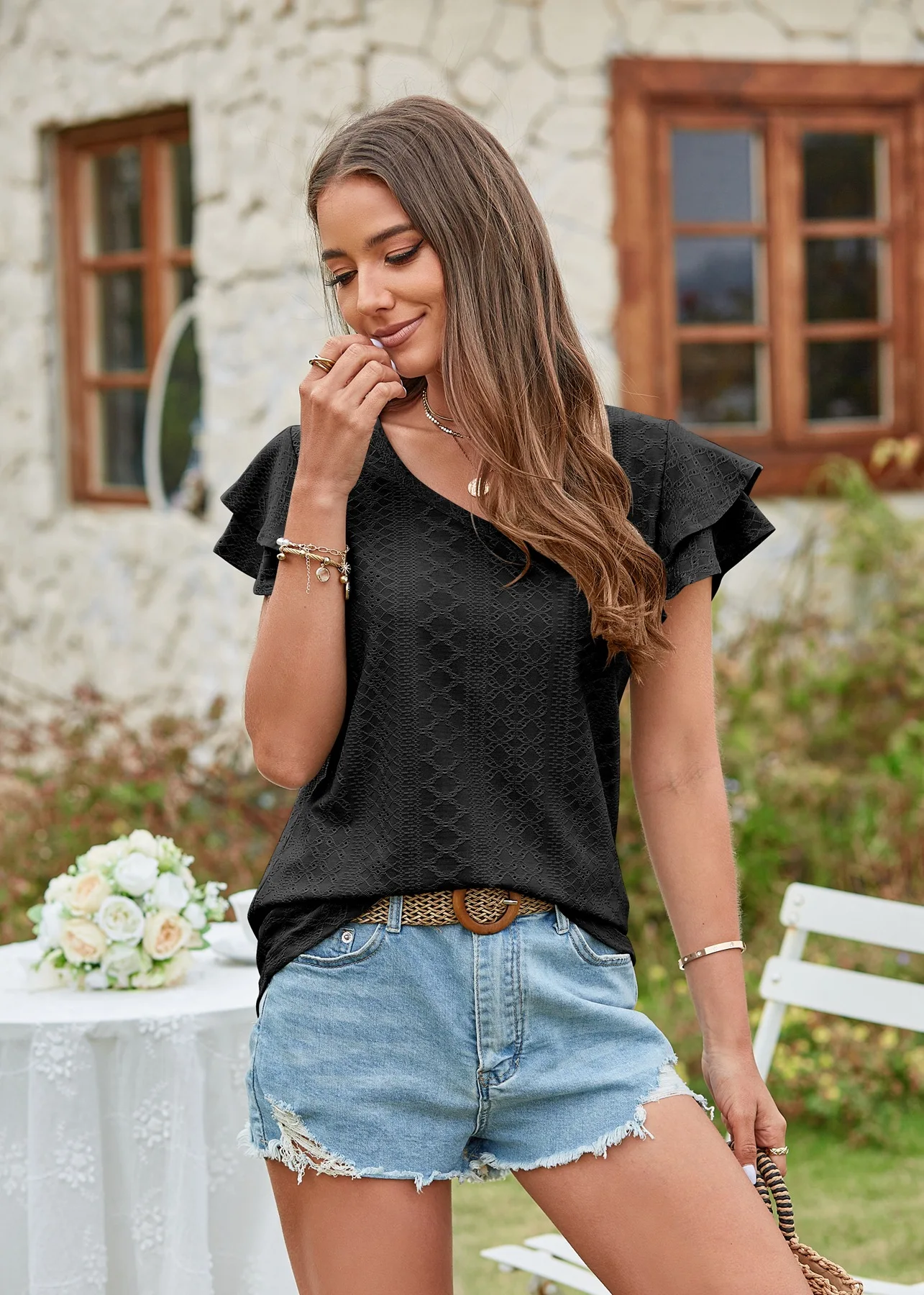 2024 Summer New Women's Fashion T-shirt with hollowed out lotus leaf sleeves for comfortable and casual women's top
