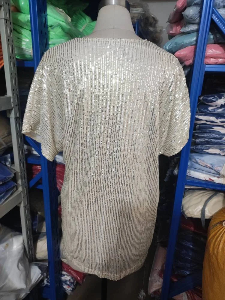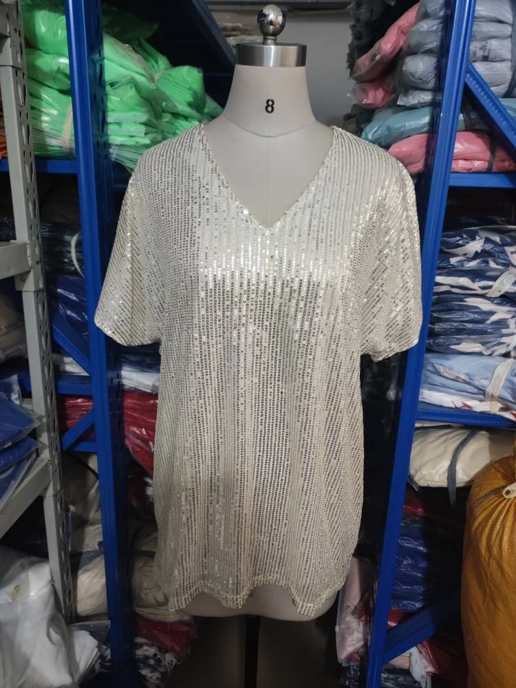 2024 Summer Women Shirts Tops Solid Color V-Neck Women's Sequin Short Sleeve Fashion Loose Fitting Casual Blouse