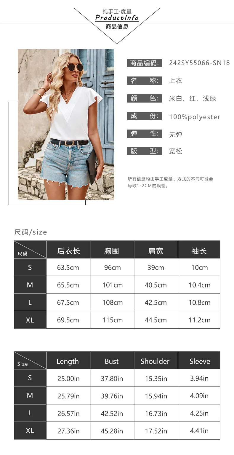 2024 Summer Women's causal Ruffle Short Sleeve plain Ladies Blouse V Neck T shirt For Ladies