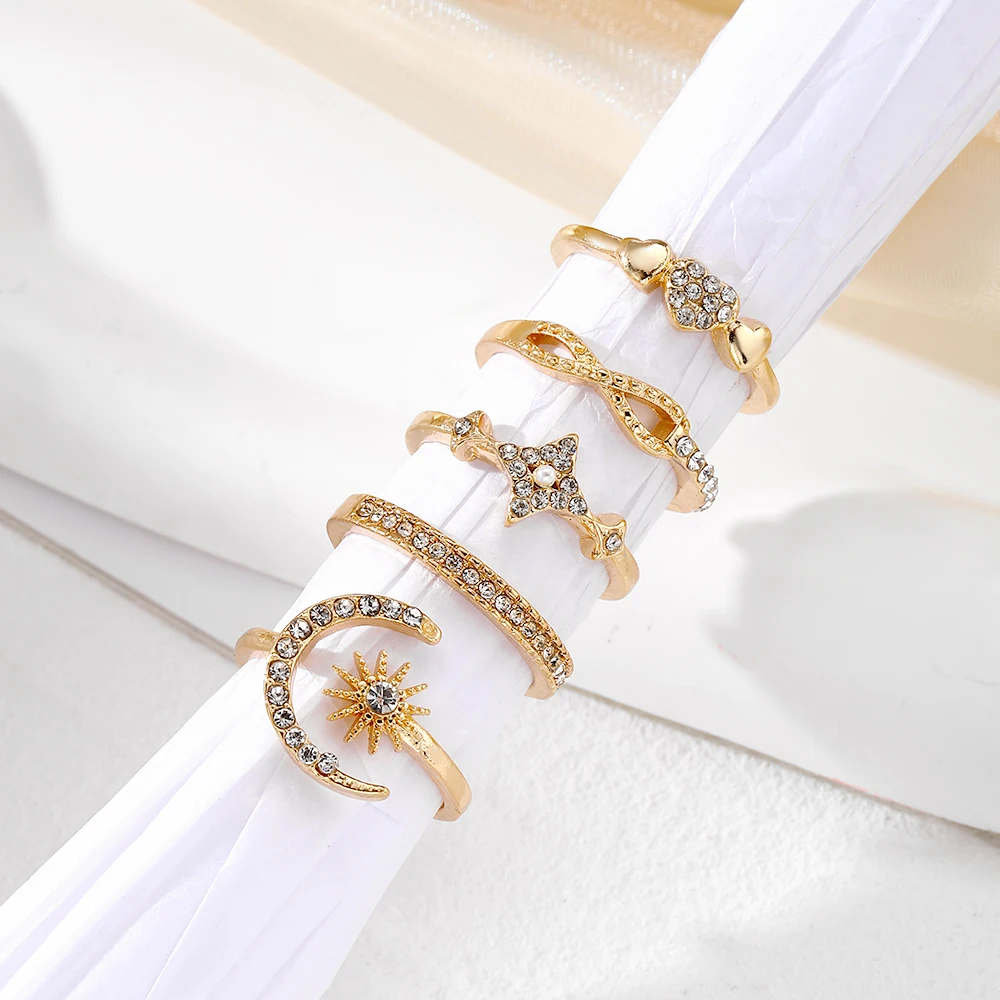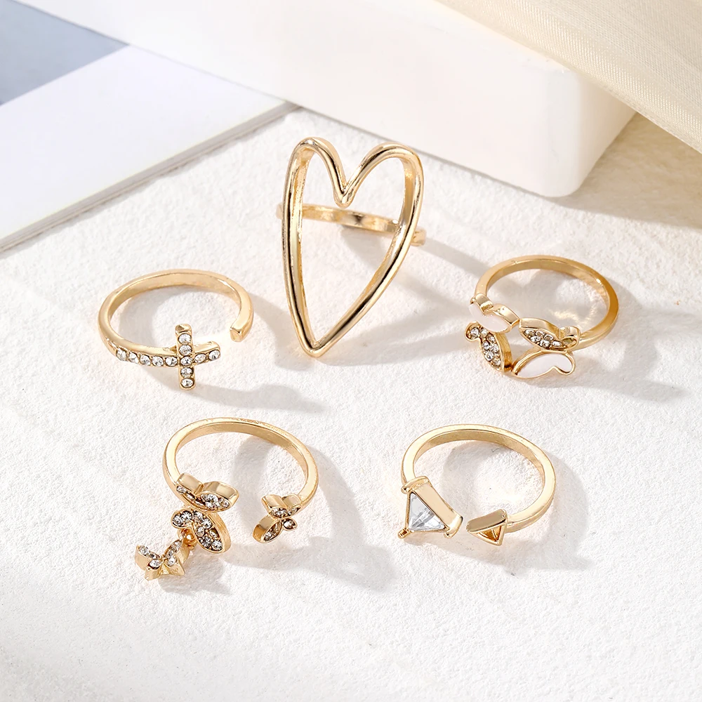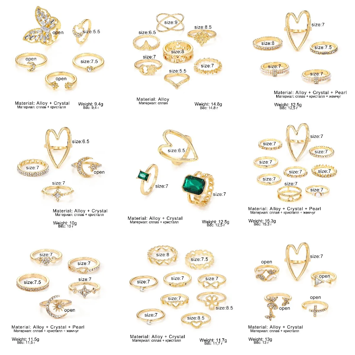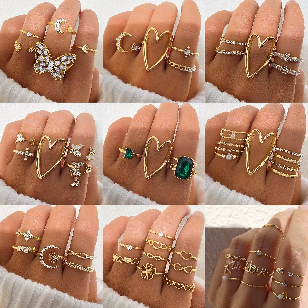 2024 Trendy Geometric Crystal Heart Rings Set Gold Moon Butterfly Green Stone diamond Knuckle Finger Ring Women Jewelry Gift