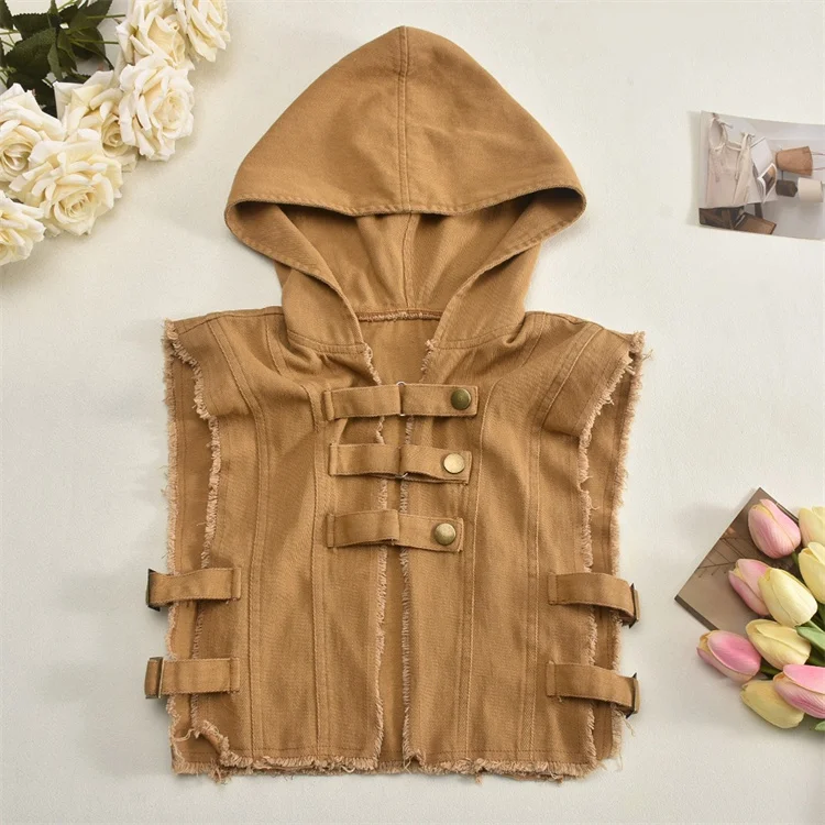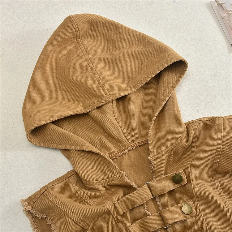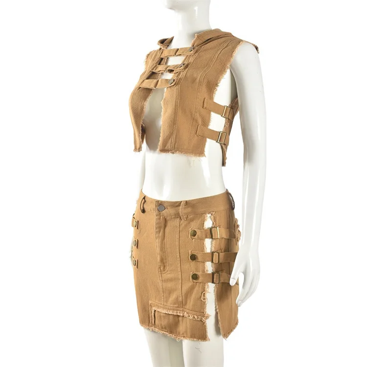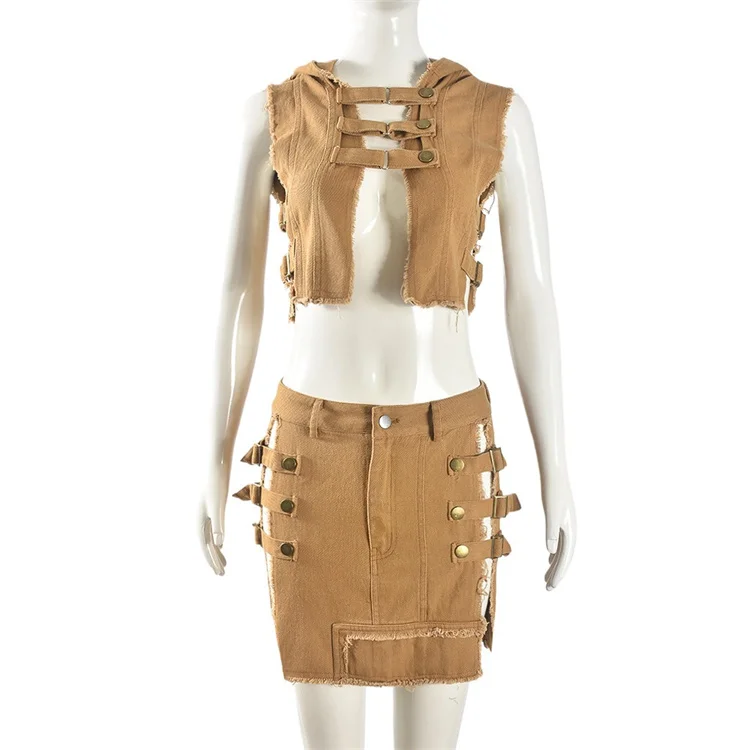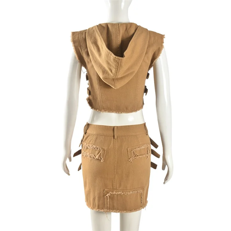 2024 Washed Denim 2 Piece Set Women Fashion Hooded Crop Tank Tops and Tassels Mini Skirts Suits