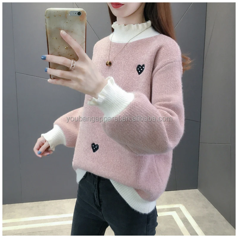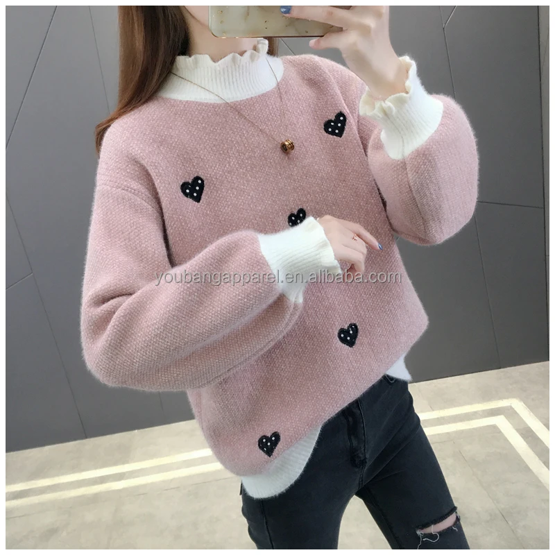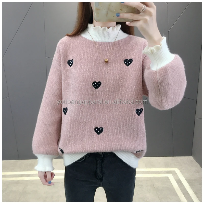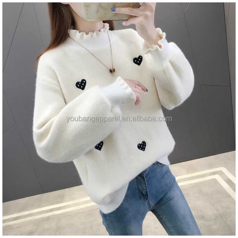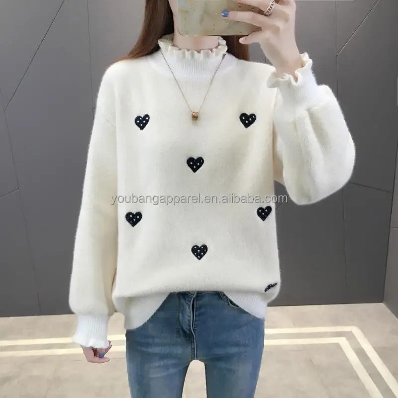 2024 Winter New arrival Lovely girls middle high neck long sleeve loose fit heart shape embroidery chenille Sweater