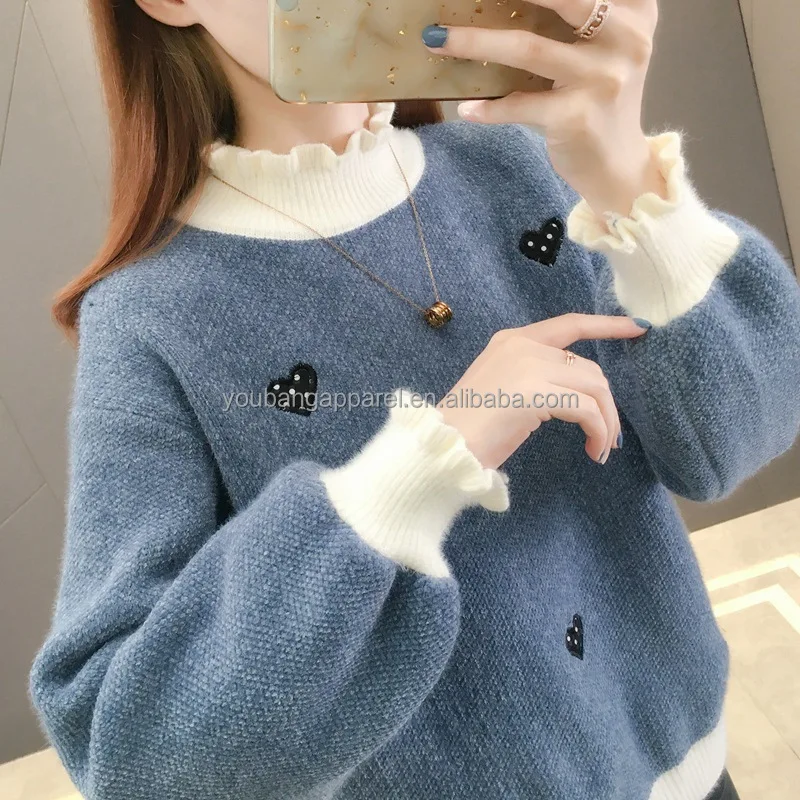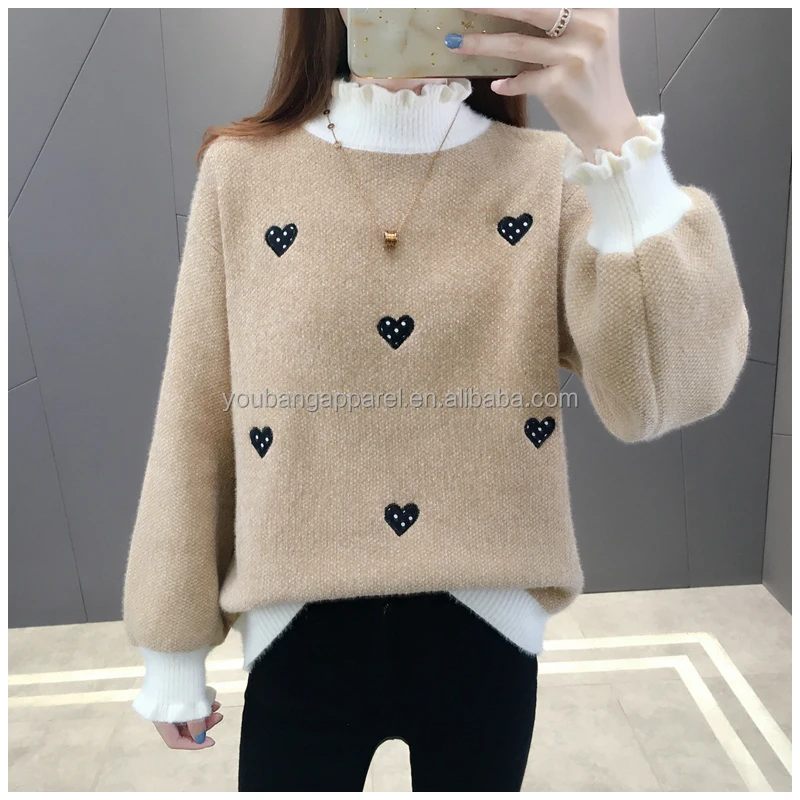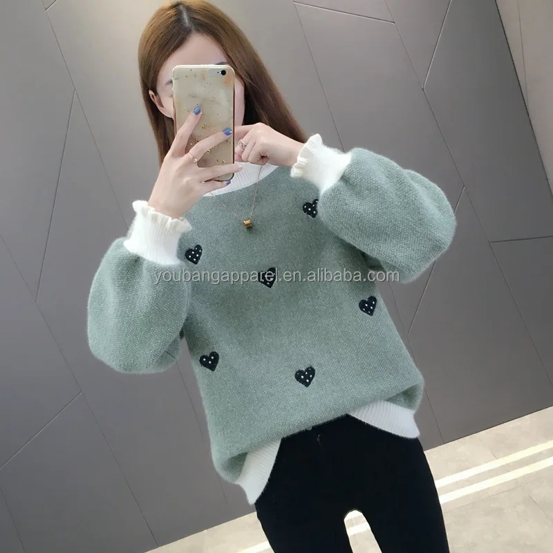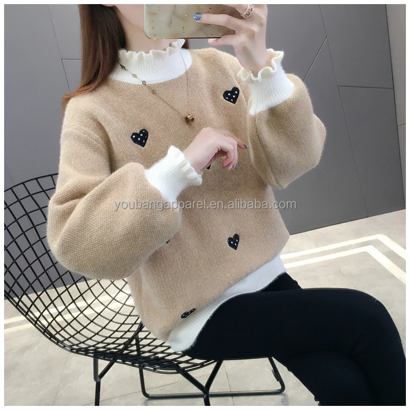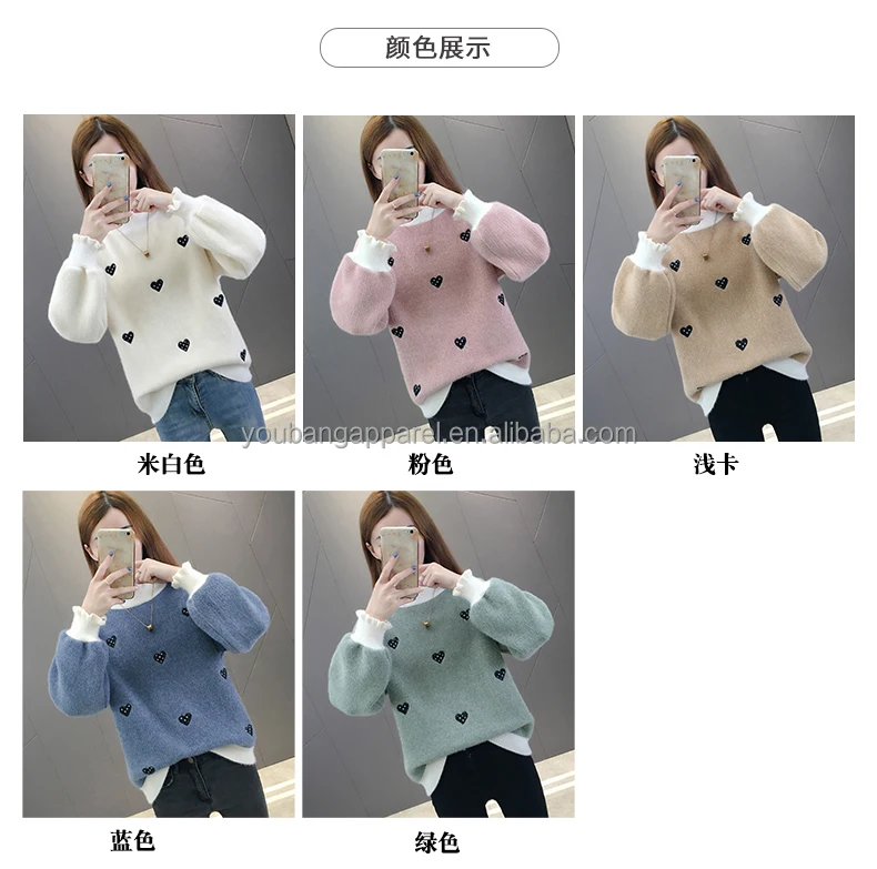 2024 Winter New arrival Lovely girls middle high neck long sleeve loose fit heart shape embroidery chenille Sweater