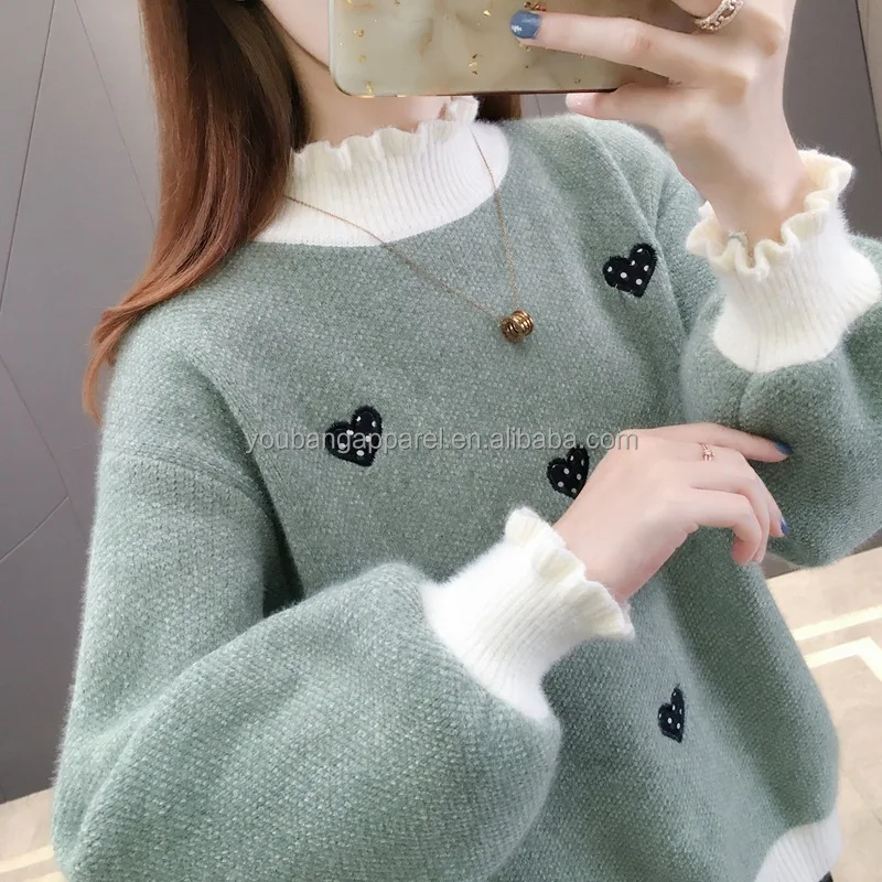 2024 Lovely girls middle high neck long sleeve loose fit heart shape embroidery chenille Sweater