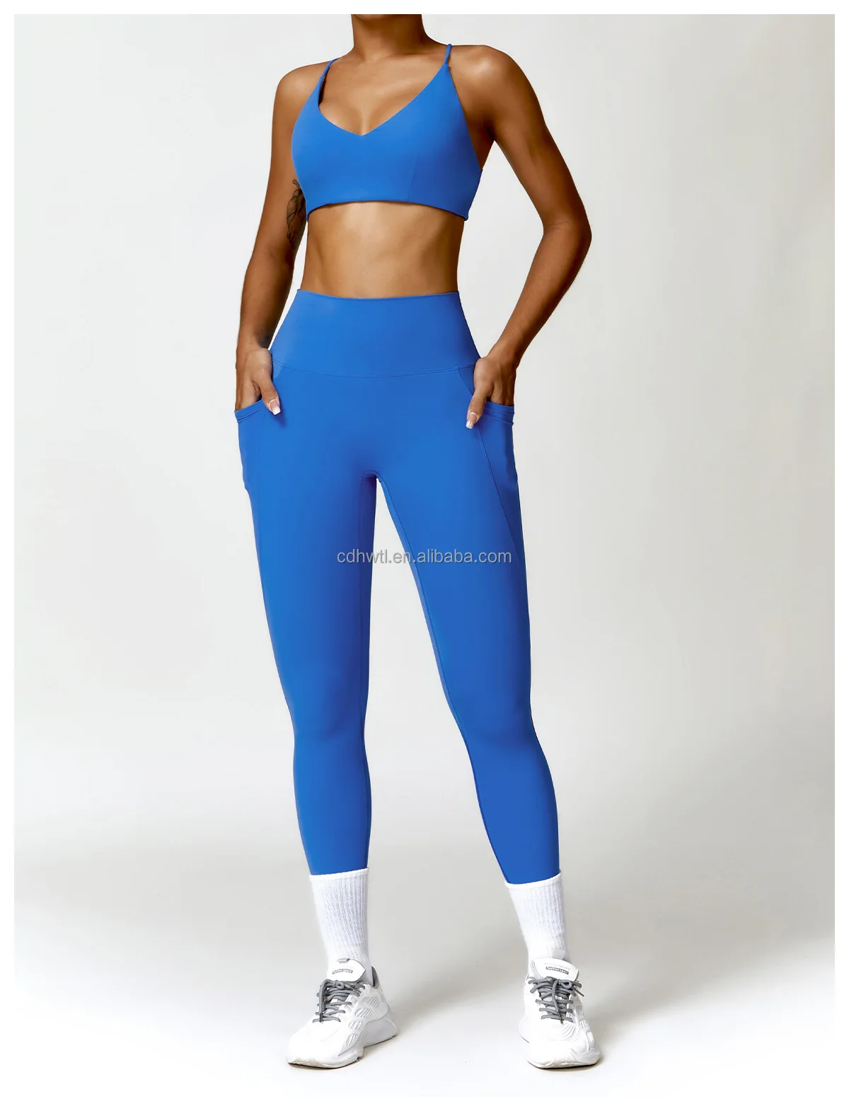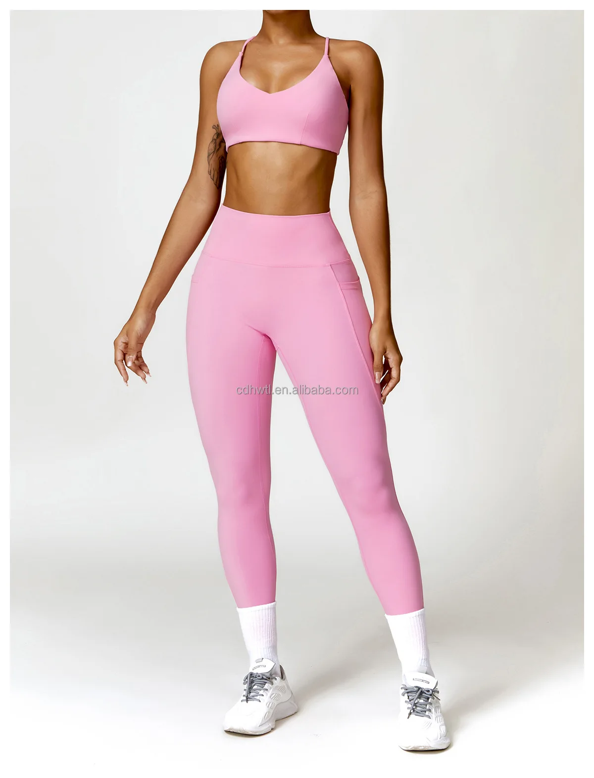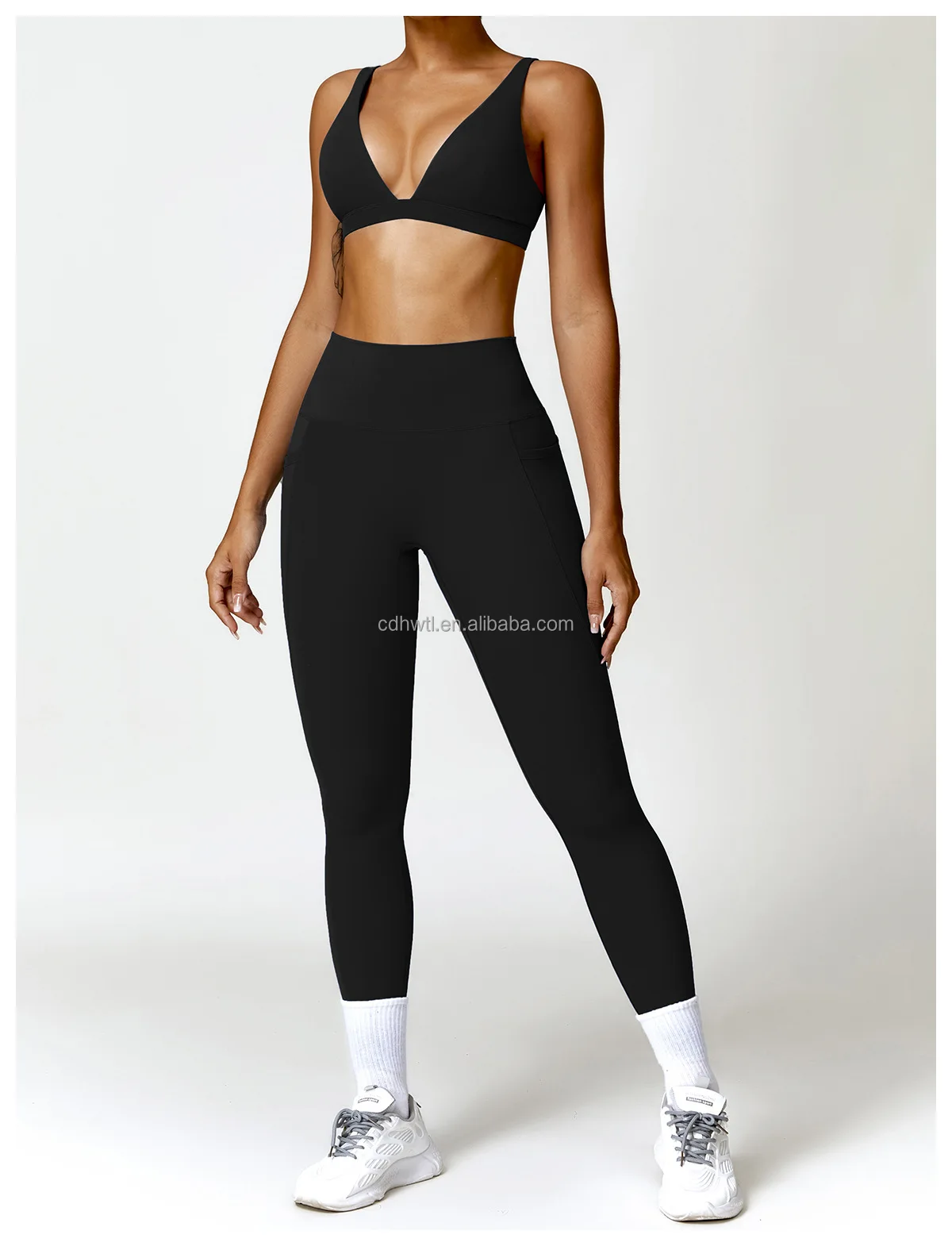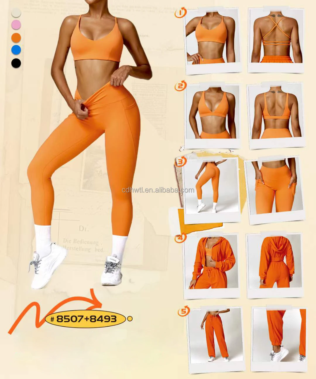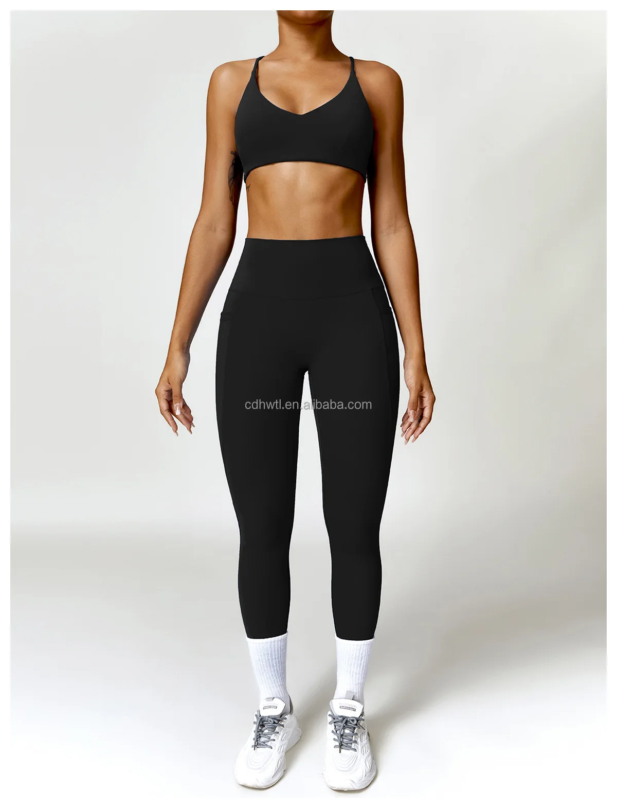 2024 Workout Long Sleeved Hoodies Jacket Jogger pants Sexy Strap Bra Women leggings with pockets Sportswear Fitness Gym Sets