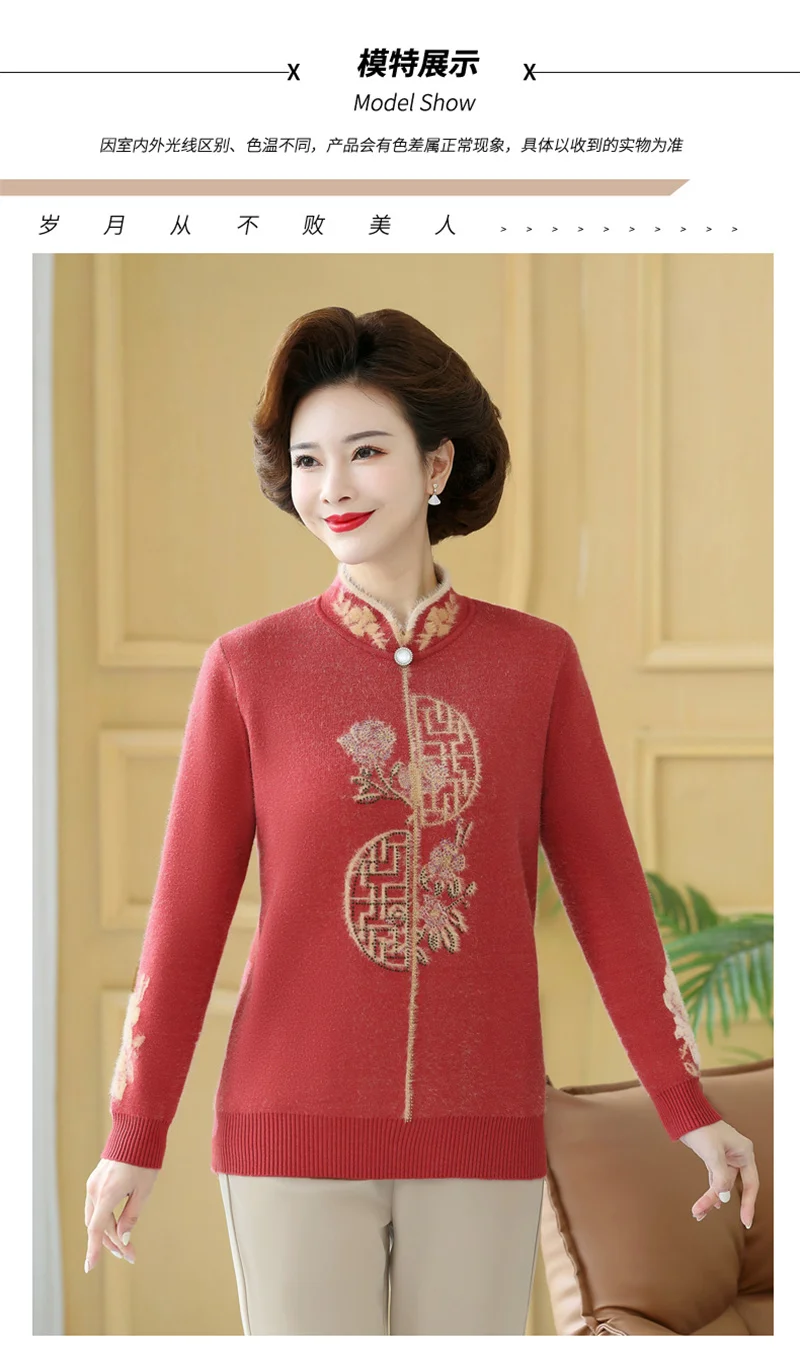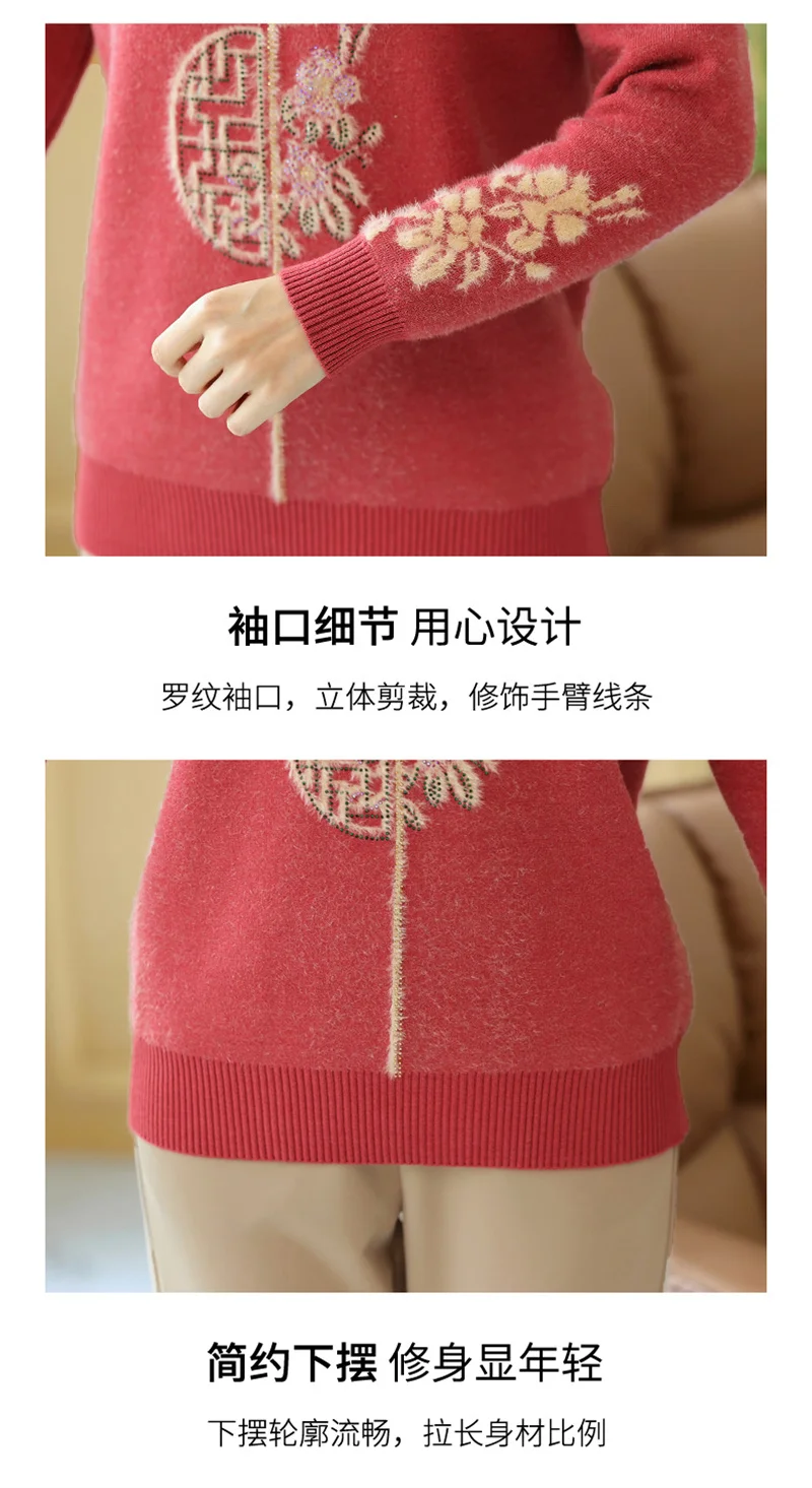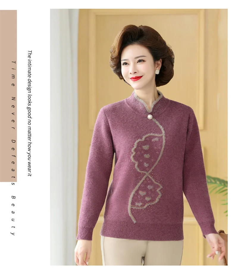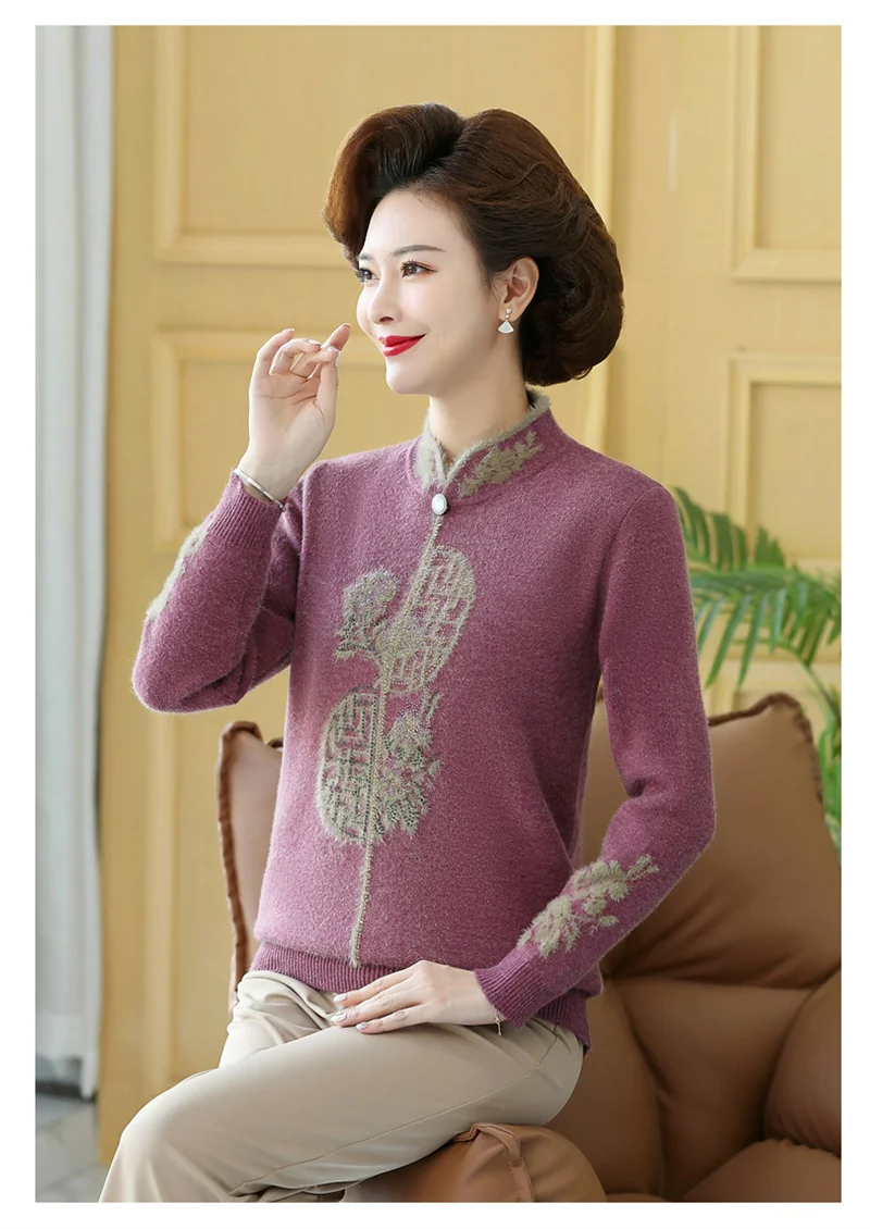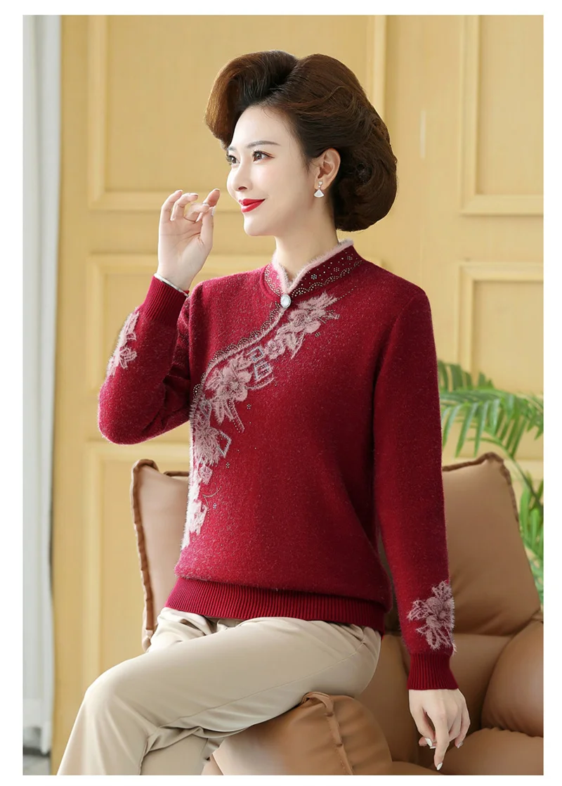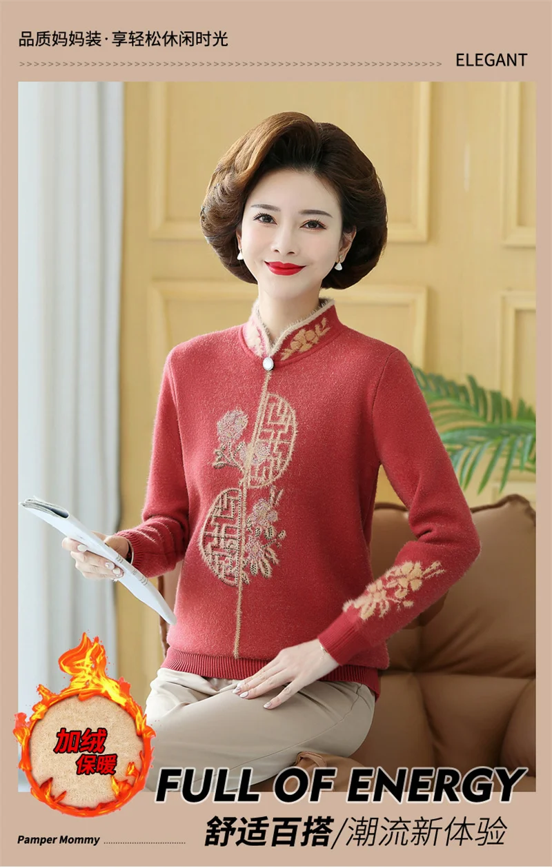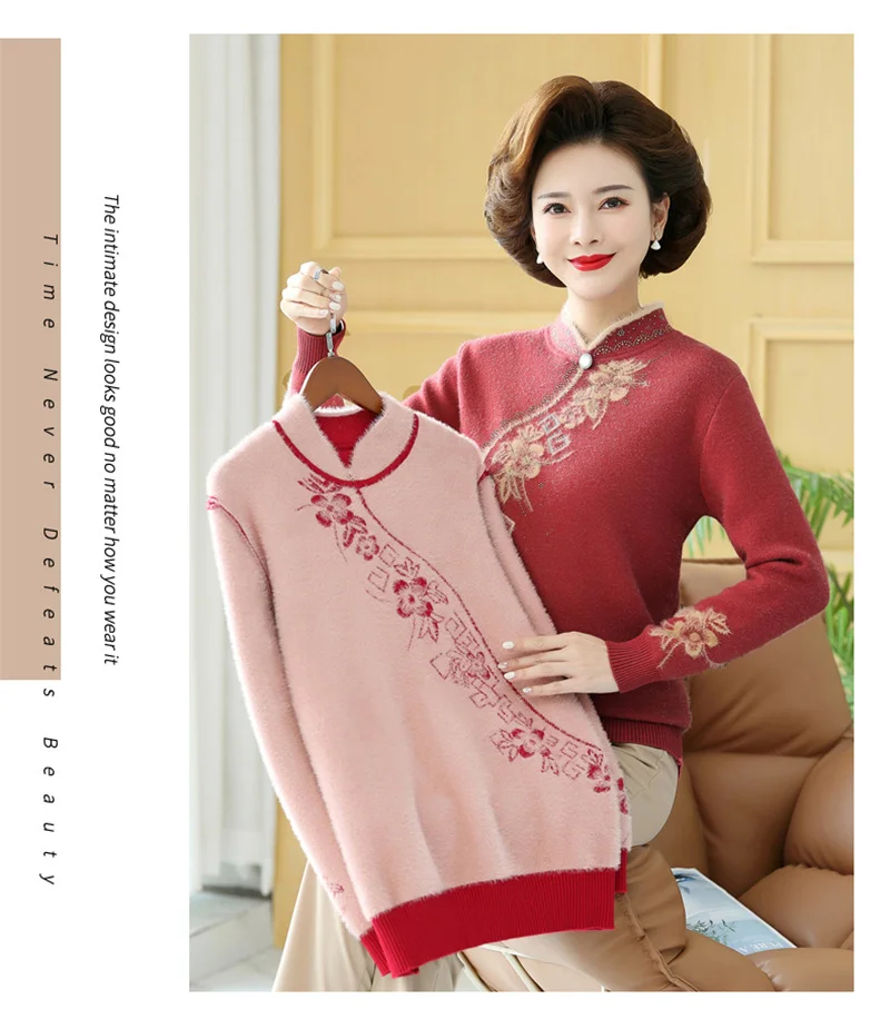 2025 Autumn New Mom's Velvet And Warm Knitted Embroidered Bottom Shirts Imitation Mink Fleece Winter Inner Plsh Thick Pullover