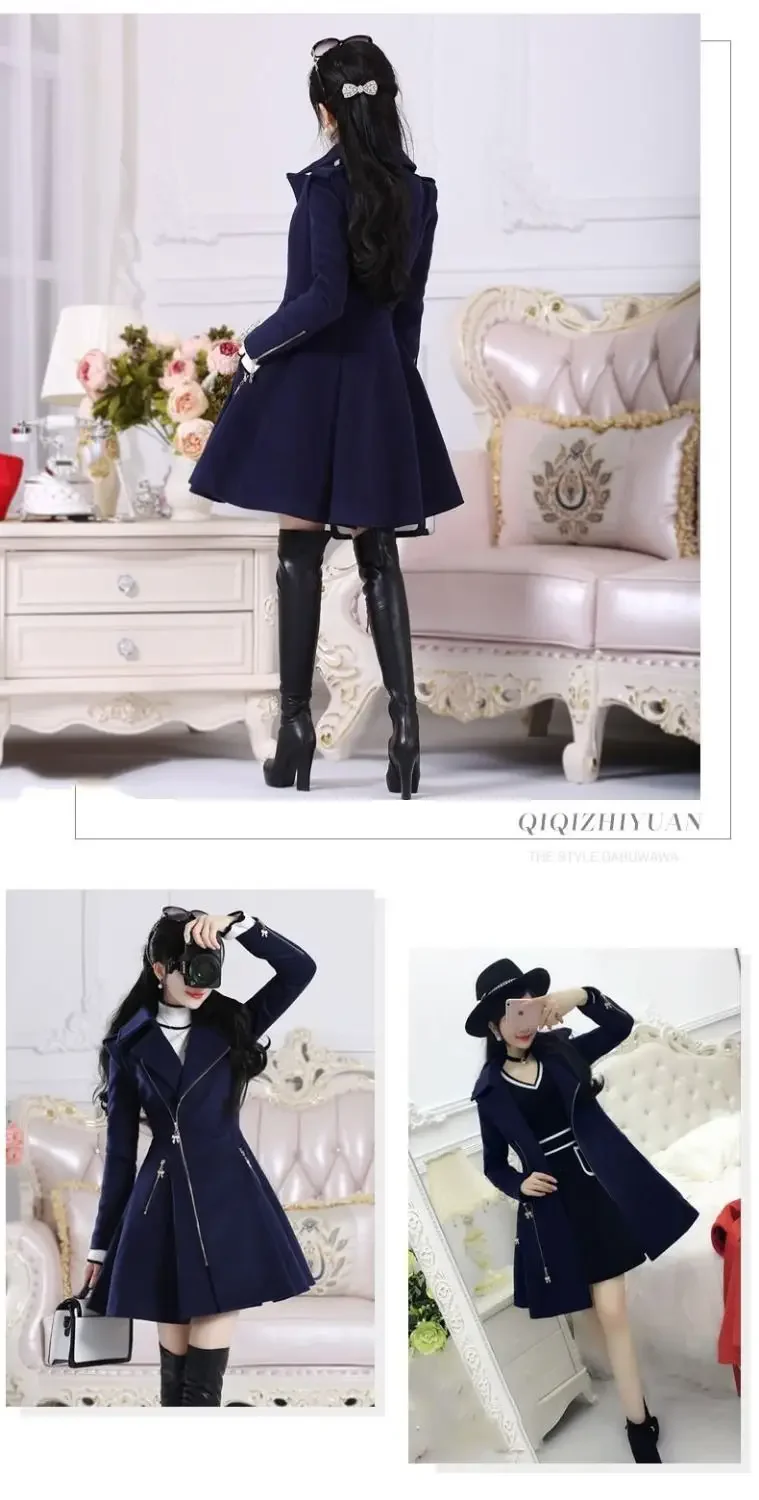 2025 Autumn Winter Clothing Deep Blue Zippered Long Sleeved Woolen Coat Jacket Women, Medium Length Slim Fit Thickened