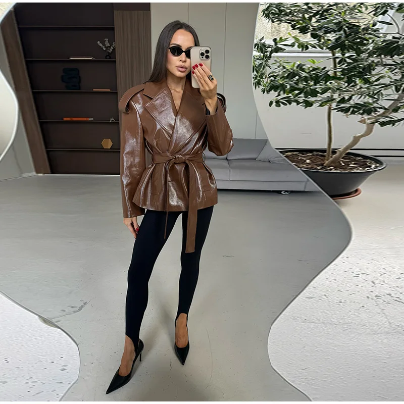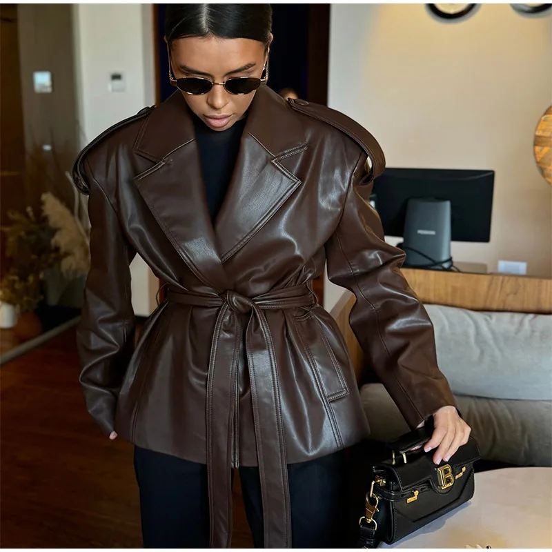 2025 Autumn Women's Jacket Vintage Laple Brown PU Leather Belt Pockets Jackets Female Fashion New Winter Loose Lady Streetwears