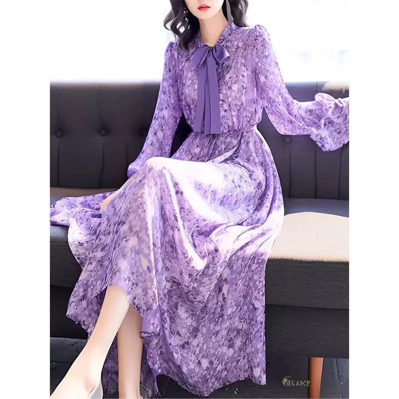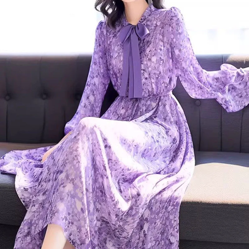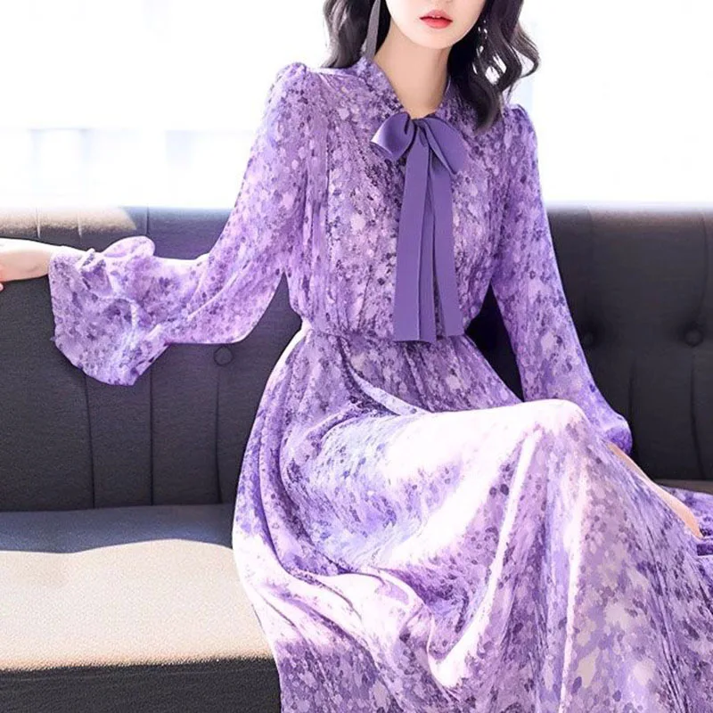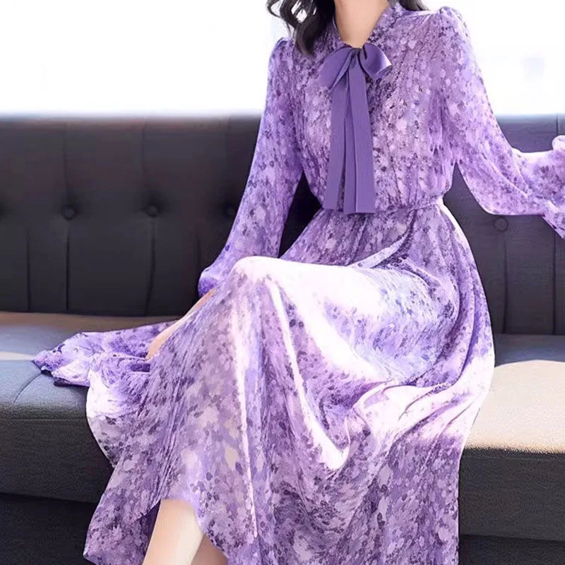 2025 new Summer women's chiffon dress high-end bow floral long sleeve fashion Female dresses Elegant Luxury Party Vestidos Y2K