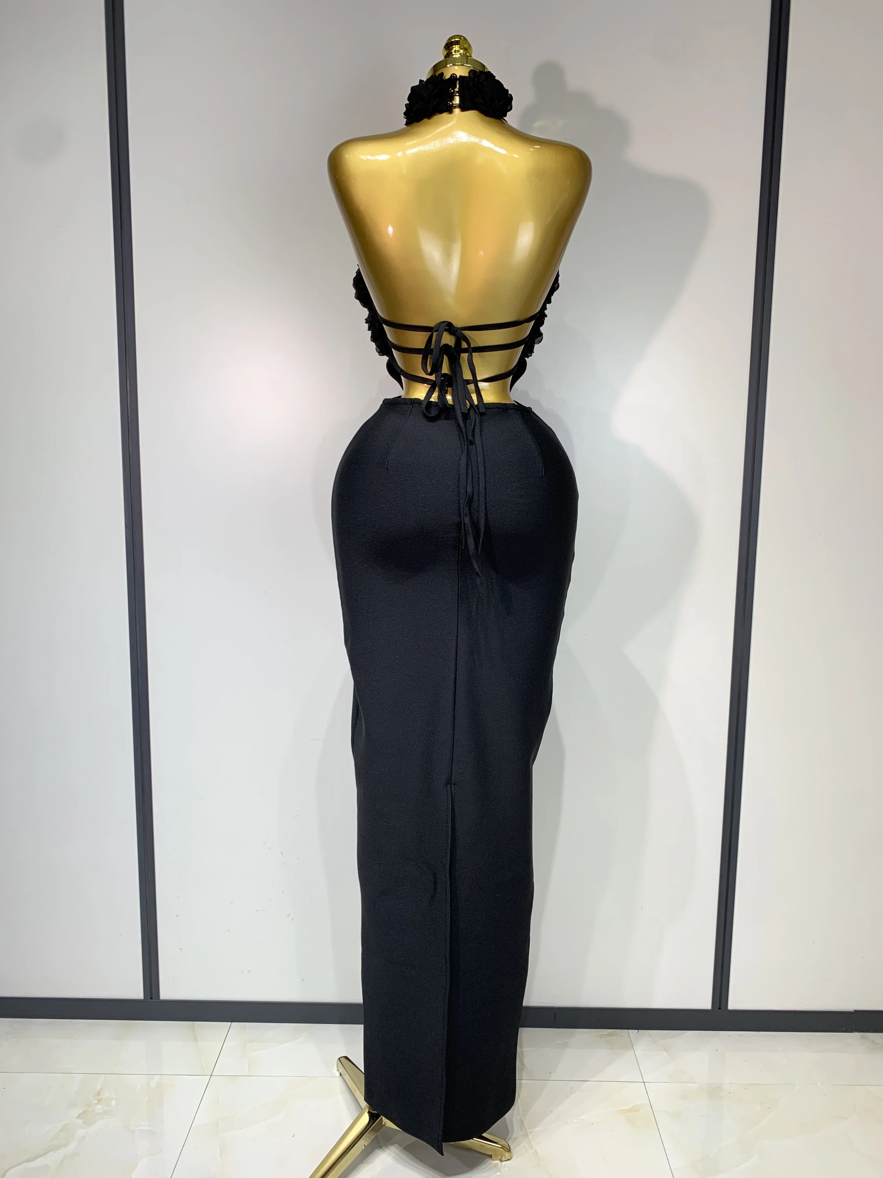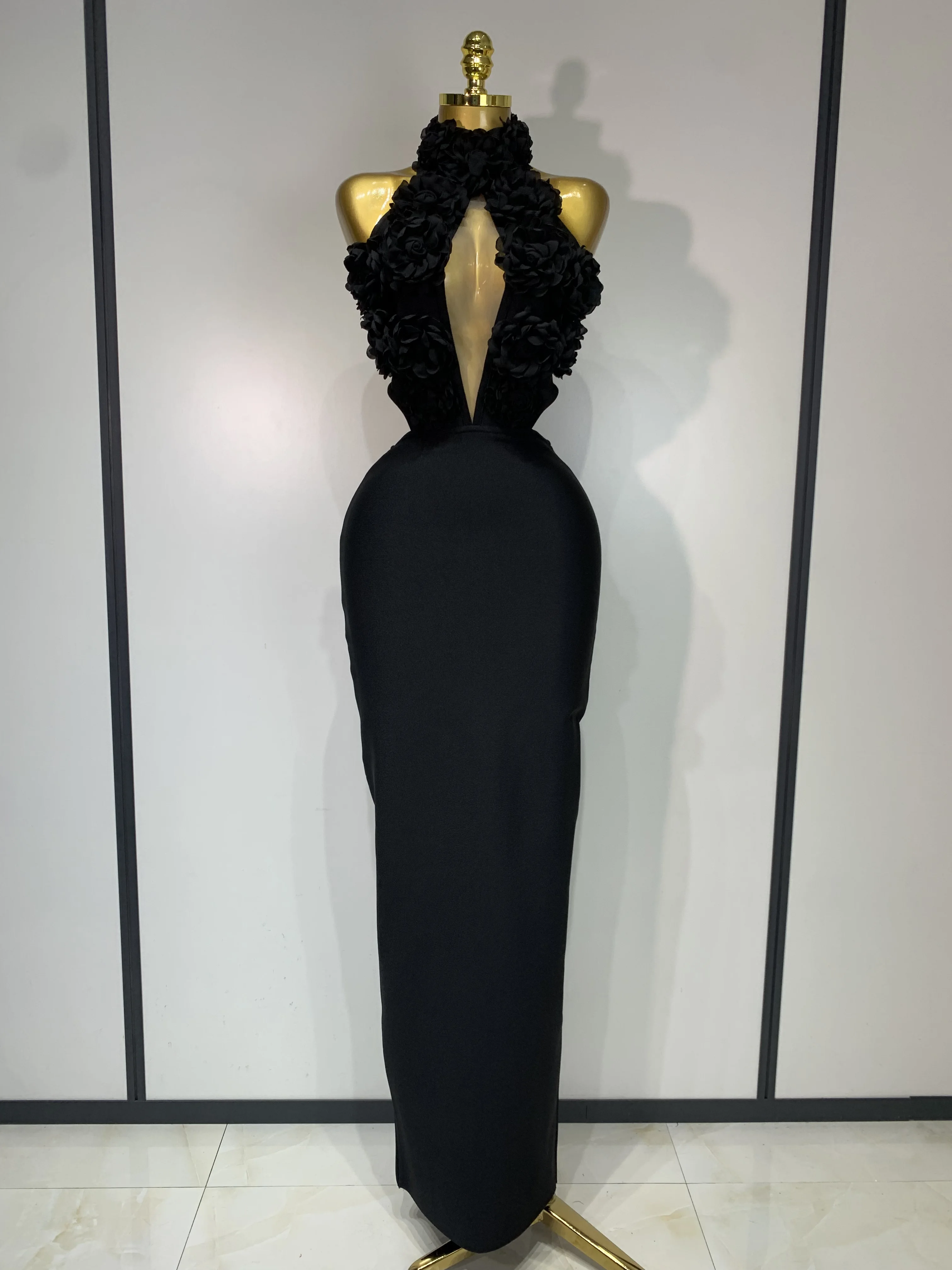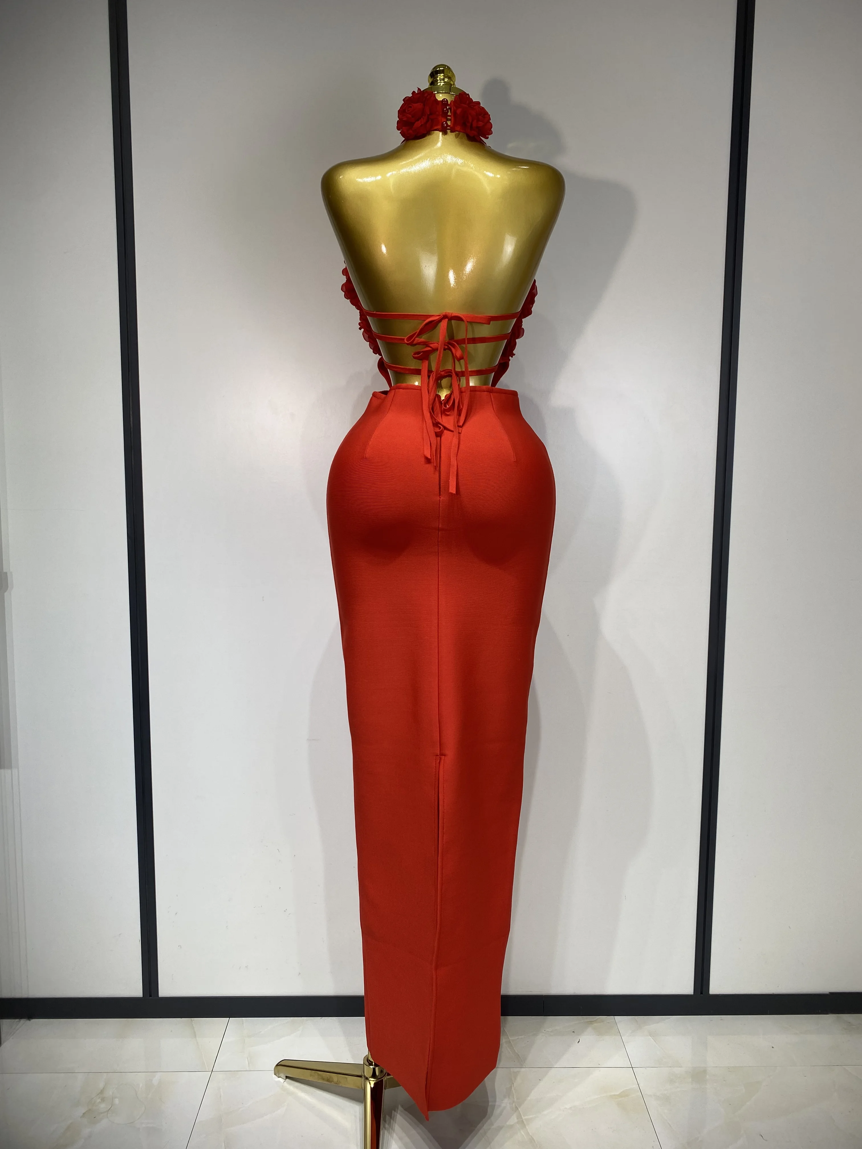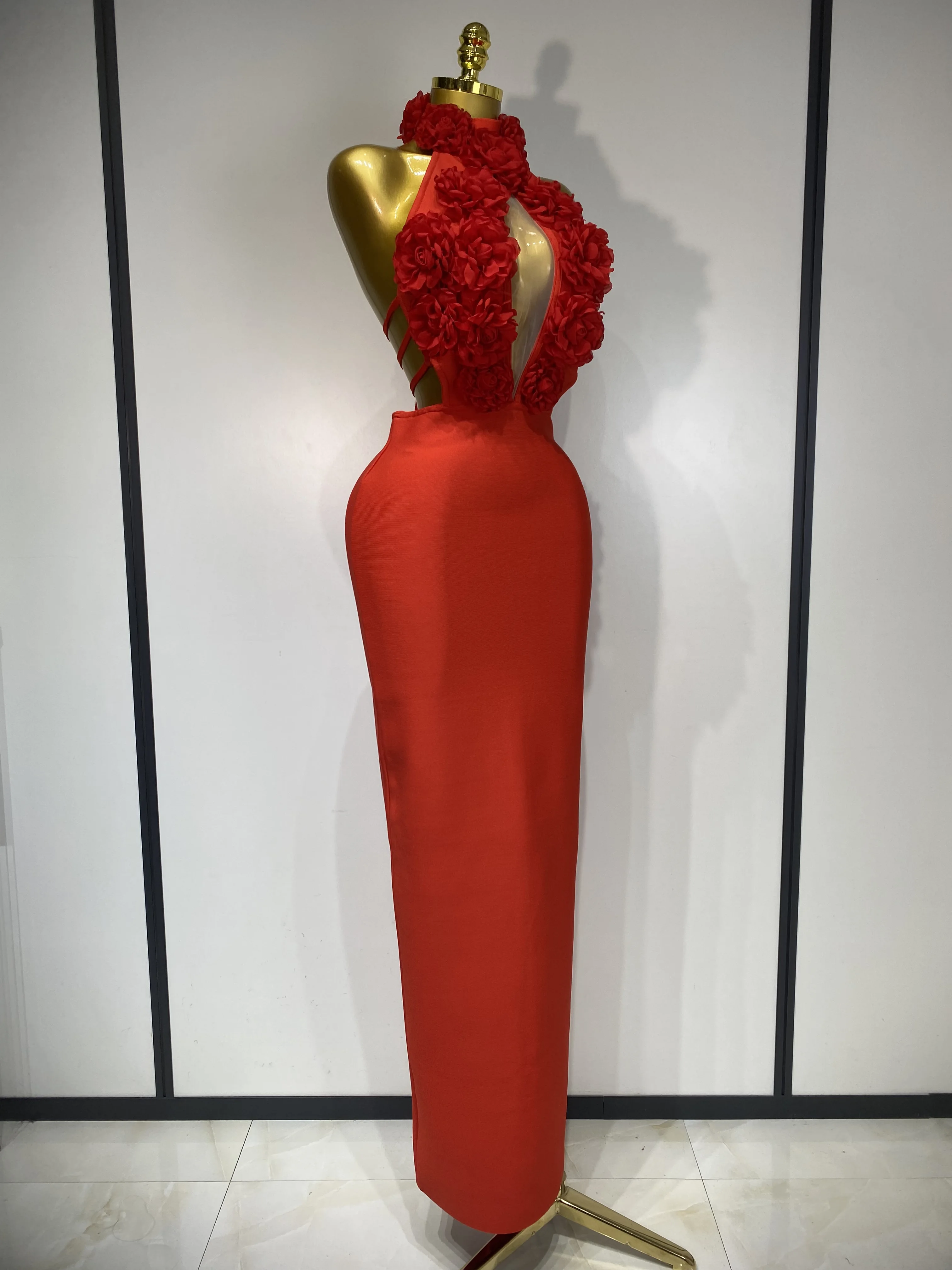 2025 New Women Sexy Halter Hollow Out Flowers Bodycon Bandage Dress Red Backless Elegant Party Luxury Birthday Wedding Dresses