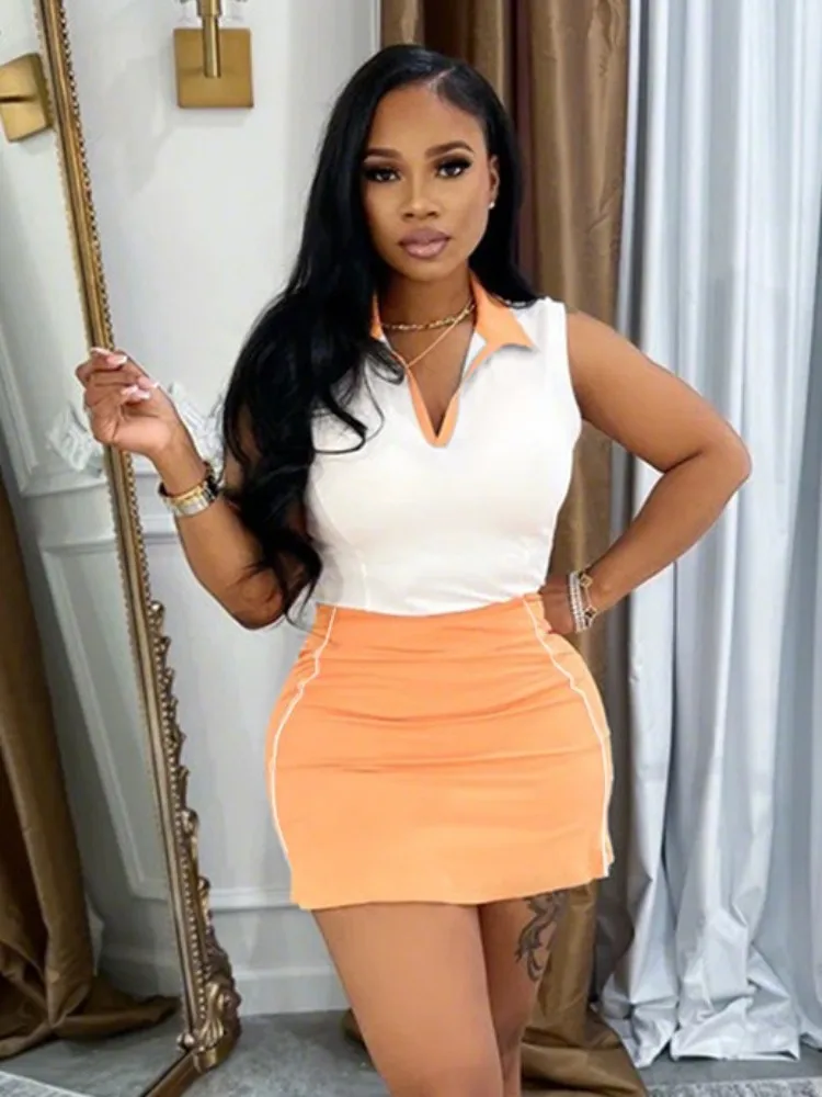 2025 Summer Women's Contrast Patchwork Lapel Sleeveless Bodycon Sporty Mini Dress Holiday Casual Comfort Streetwear S-XXL
