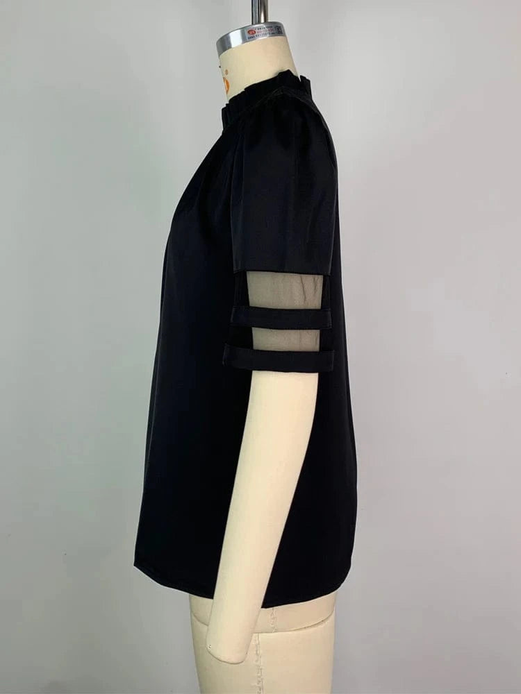 2025 Summer Women's Solid Black Tops Pleated Round Neck Mesh Patchwork Short Sleeve T-shirt Female Casual Shirts