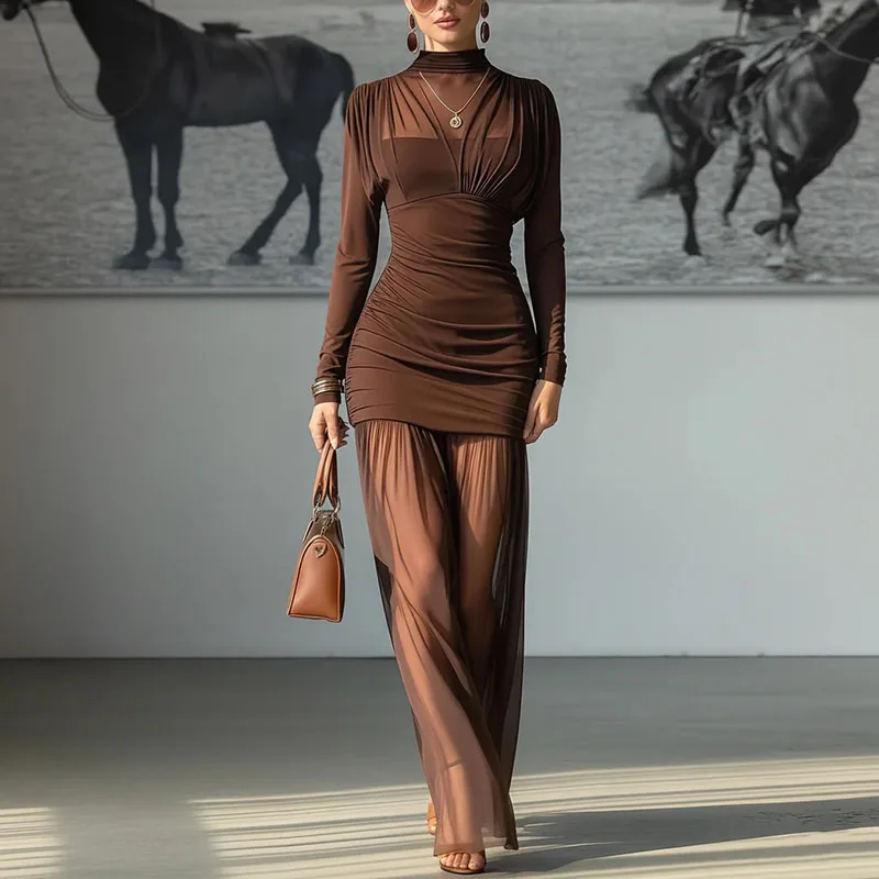 2026 Spring Turtleneck Splicing Chiffon Long Dress Woman Sexy Hollow Slim Pleated Dress New Long Sleeve Mesh Elegant Party Dress