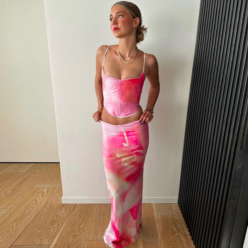2629 Tie Dye Print Crop Top Bandage Corset High Waist Crop Top Tube Skirt Women'S Sets 2023 Summer Evening Casual Party Clothes