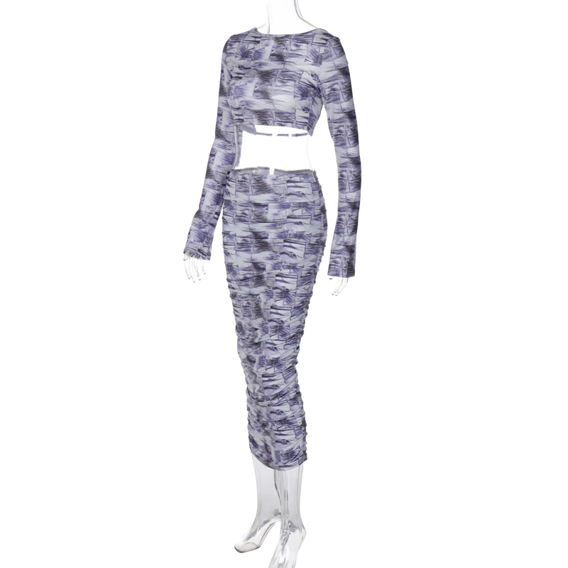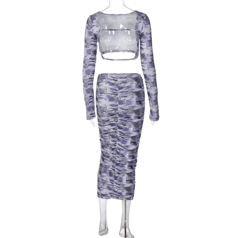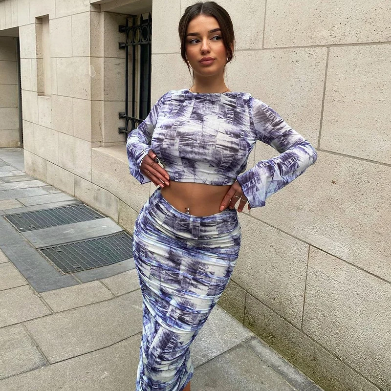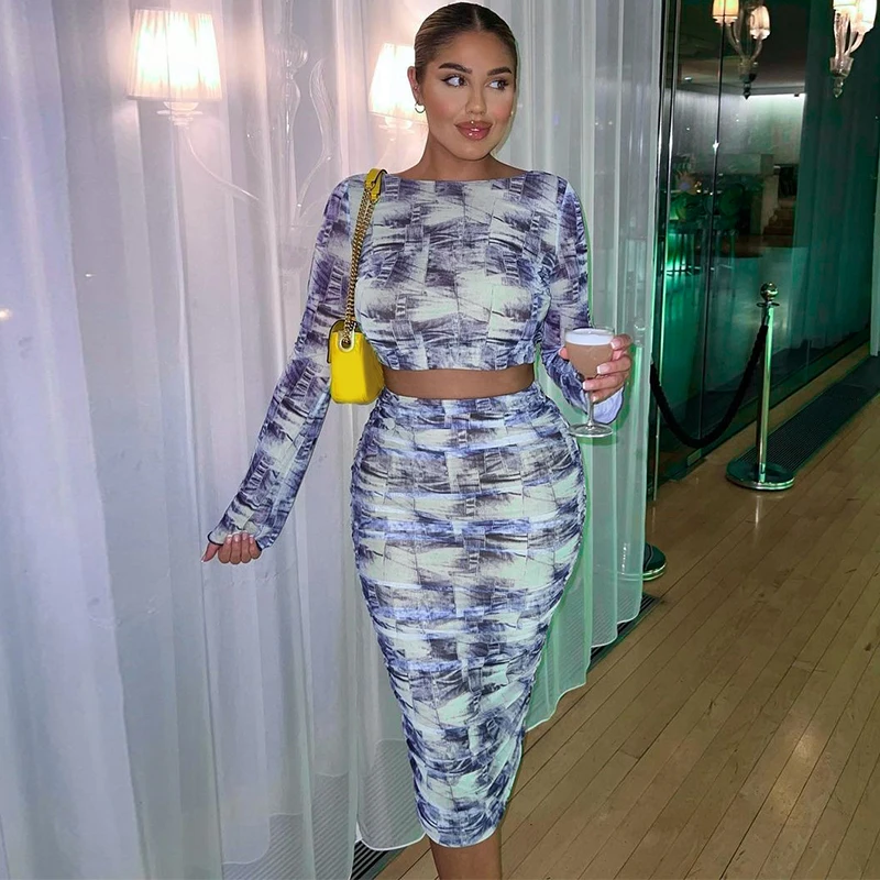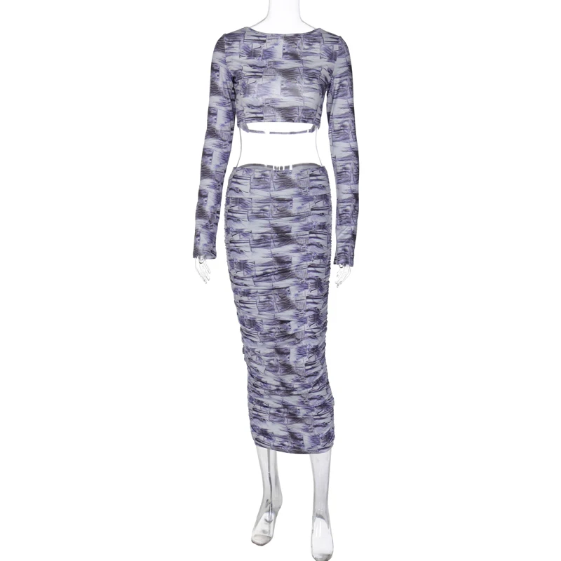 2949 O Neck Tie Dye Print Backless High Waist Crop Top Tube Ruched Skirt Women'S Sets Summer Autumn Casual Vacation Clothes