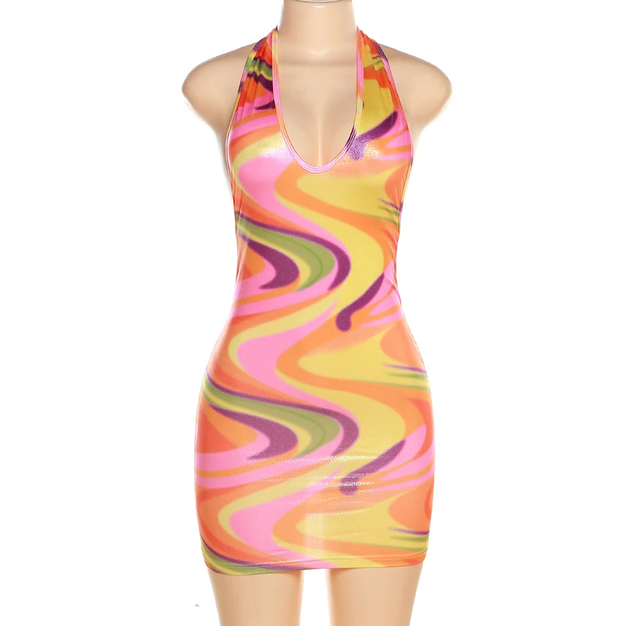 29591 Summer Dress Colorful Print Open Back Vestido Bodycon Dresses Women Sexy