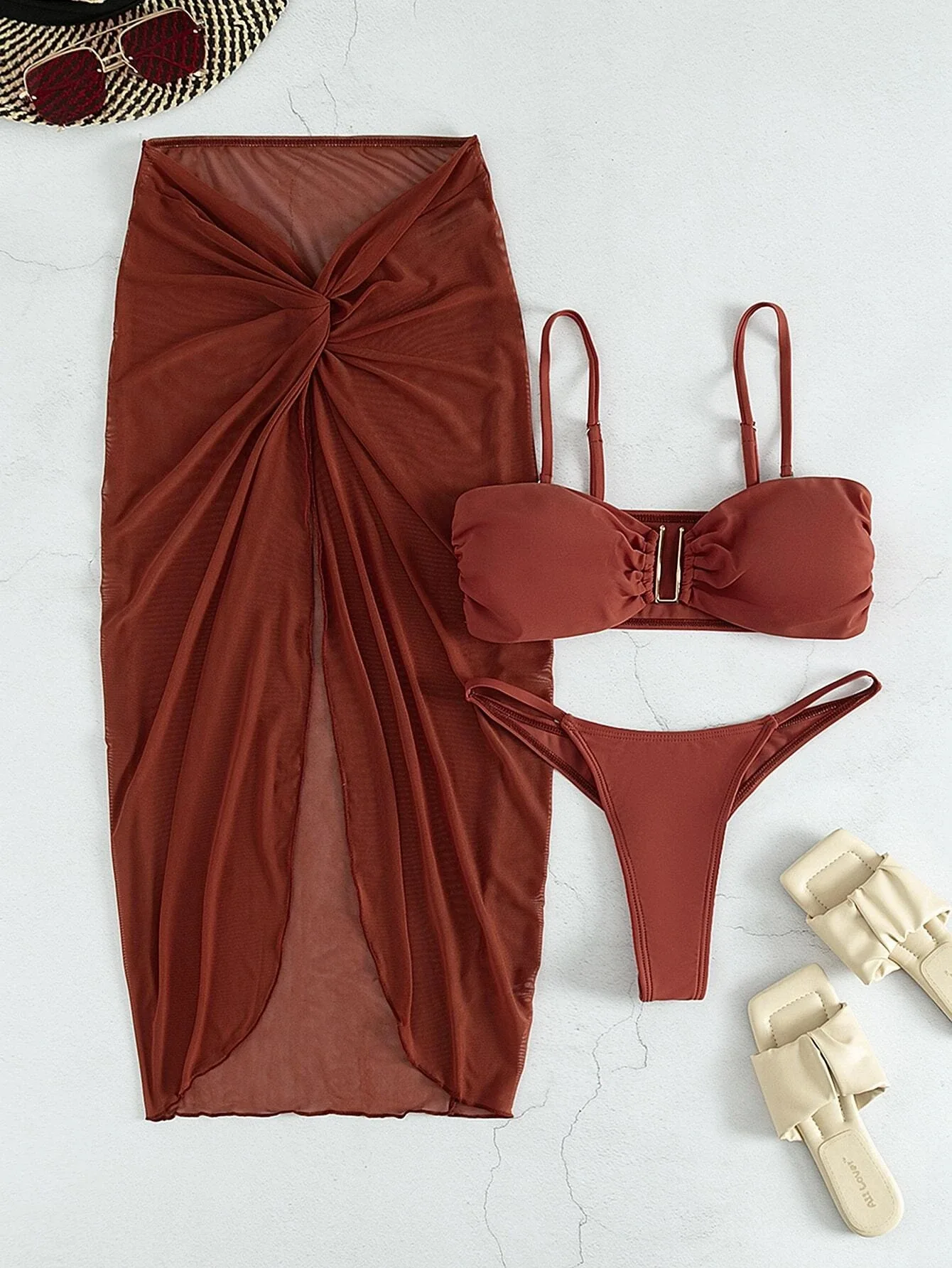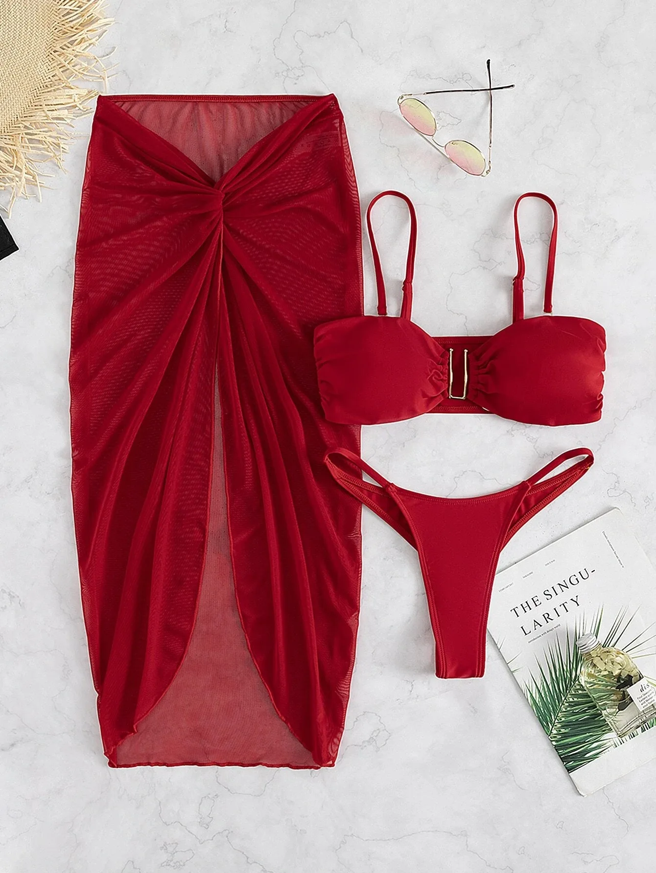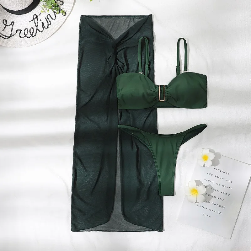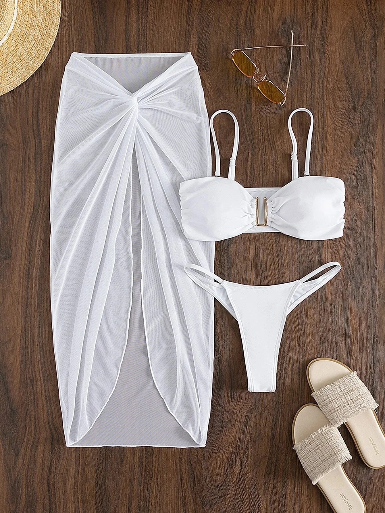 3 PCS With Sarong Micro Thong Halter Bikini Set Female Buckle Swimsuit Women Swimwear Three-piece Bather Bathing Suit Swim