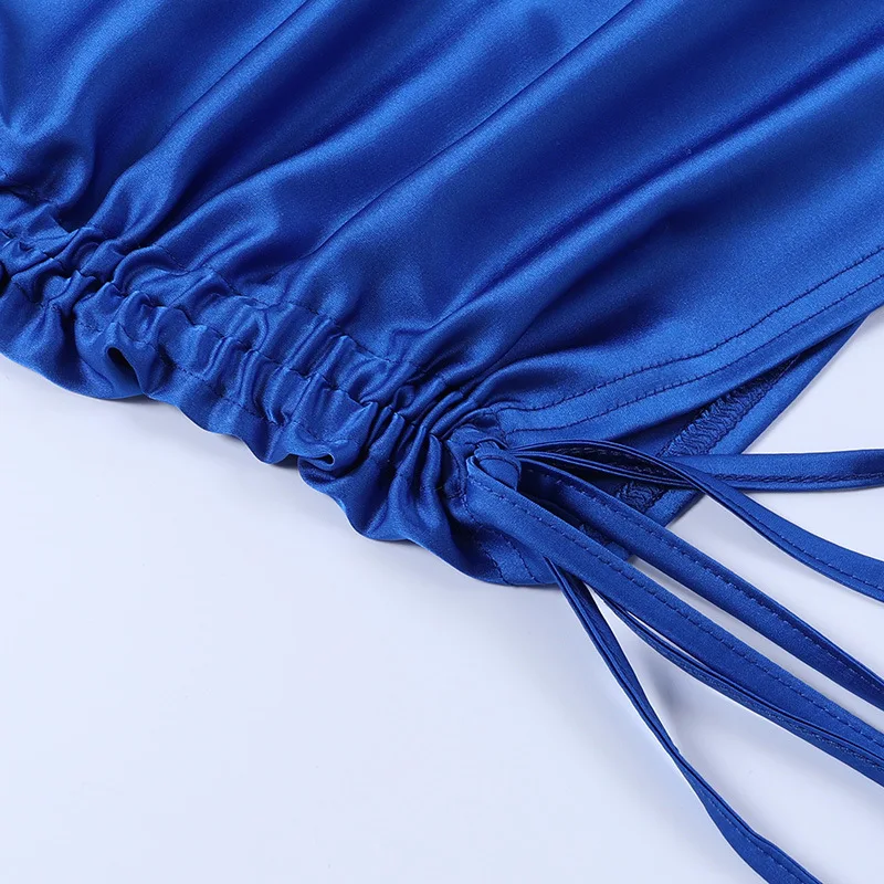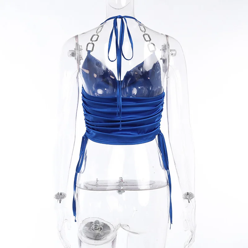 30% COTTON 70% POLYESTER Fashion Satin Chain Halter Drawstring Ruched Trendy Crop Tops For Women Spring New Style