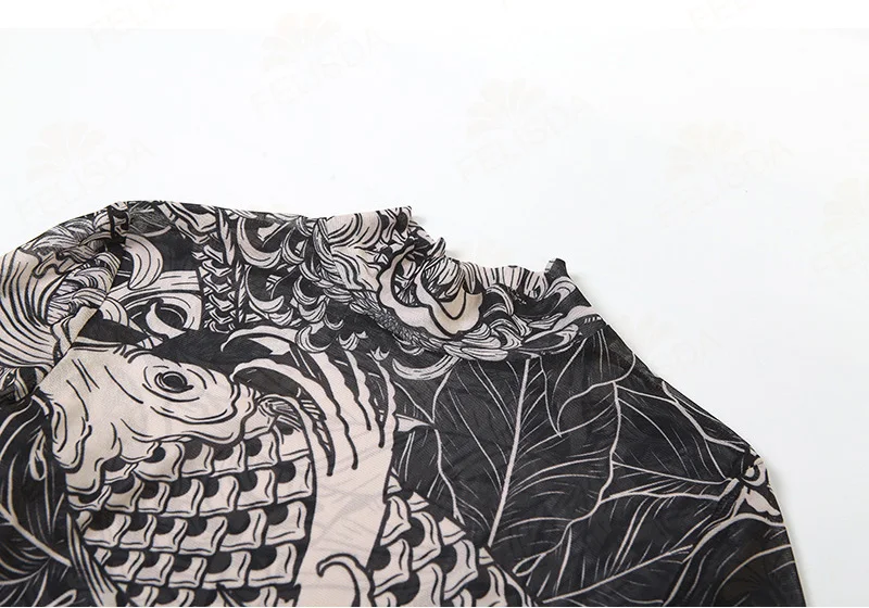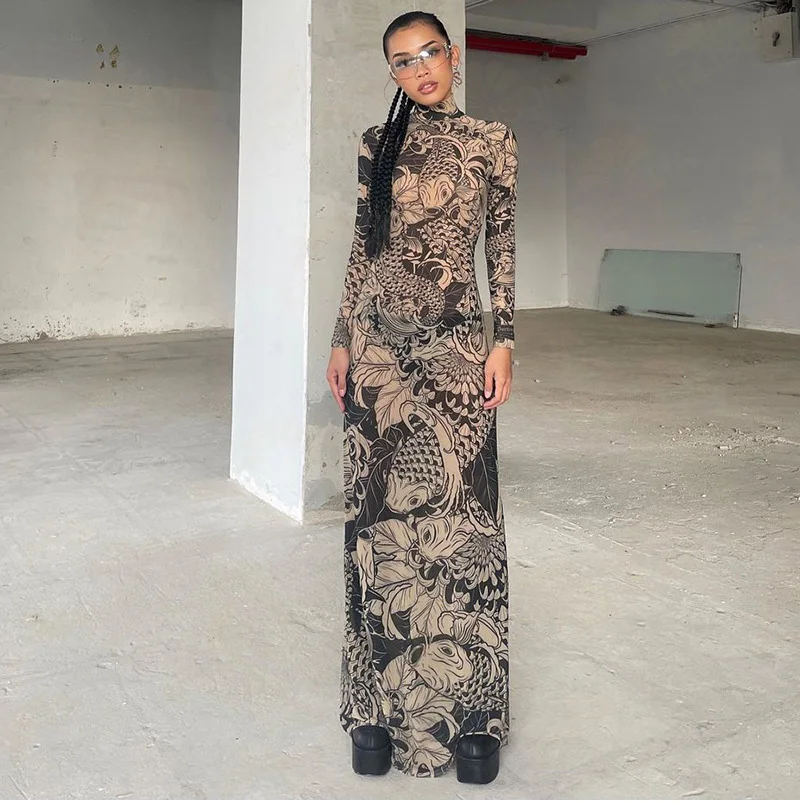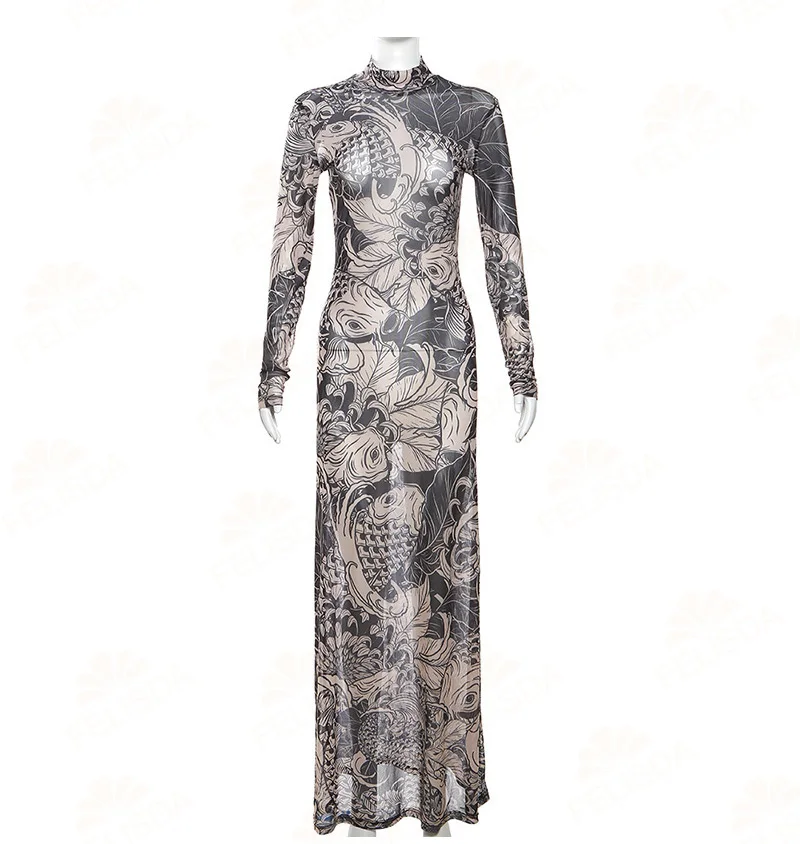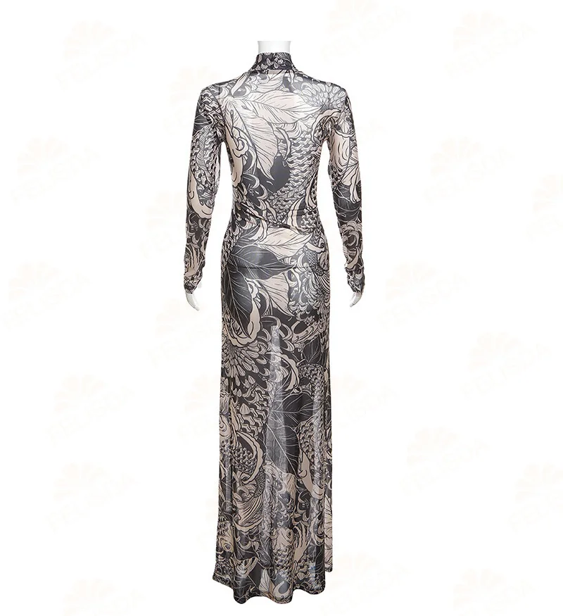 30% Off Mesh Printed Women Maxi Dress Full Sleeve Bodycon High Street Party Attirewear See Through Long Dress for Wholesale